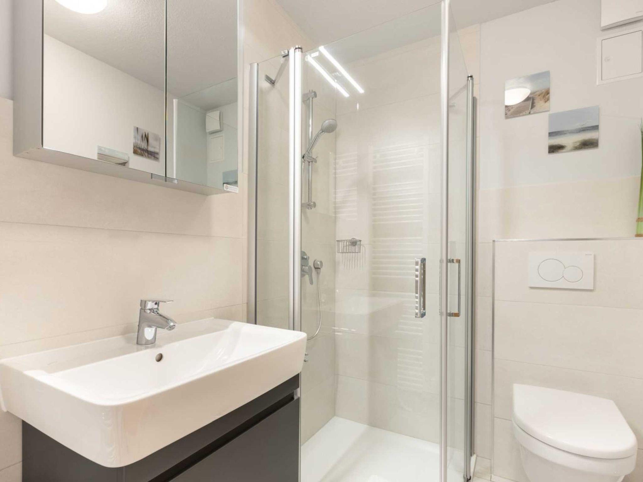 Badezimmer (Duschbad) mit Dusche, WC, elektrischer Lüftung, Föhn und Heizlüfter.