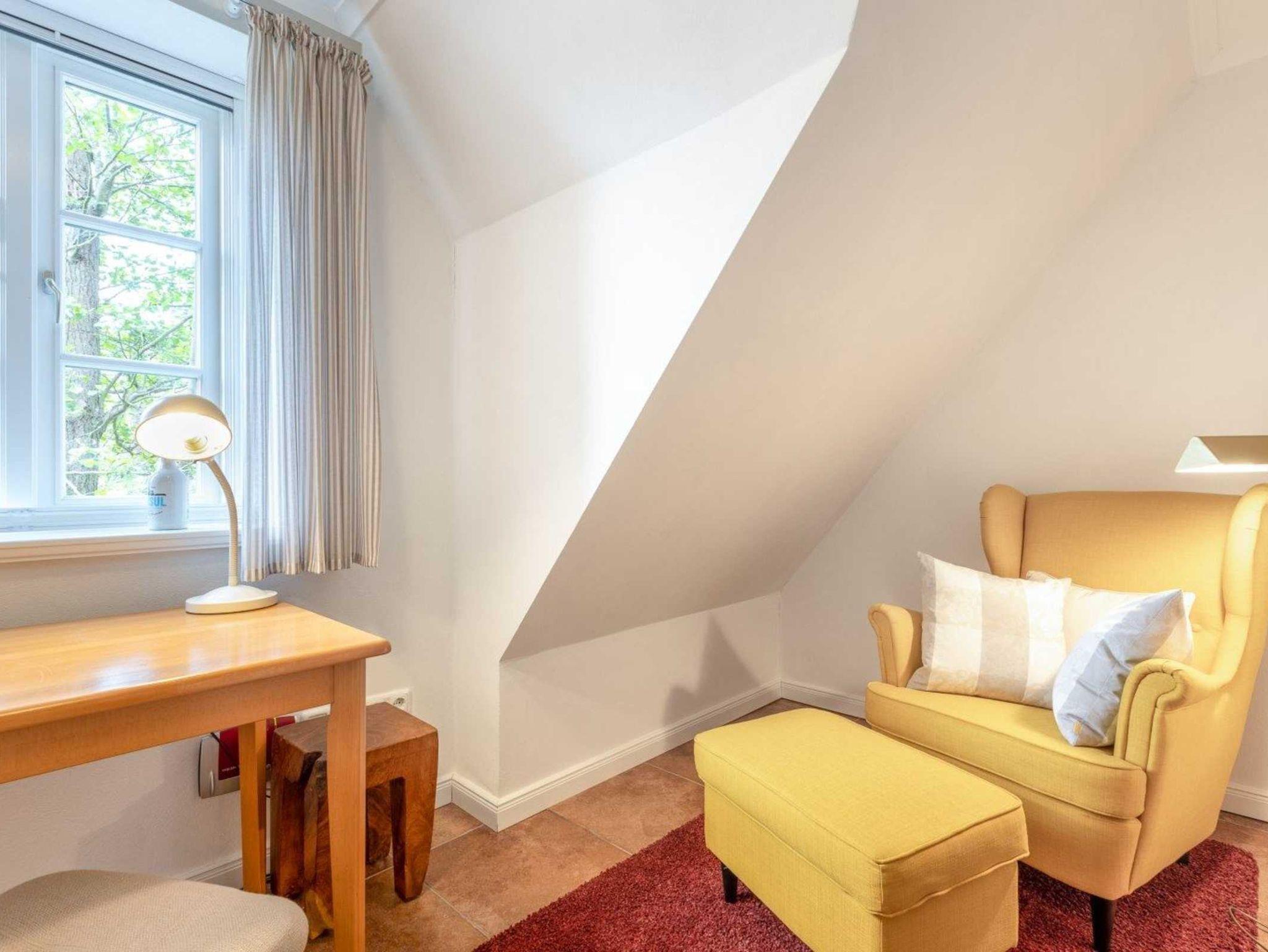 Arbeitszimmer mit Schreibtisch, Ohrensessel und Büchern.