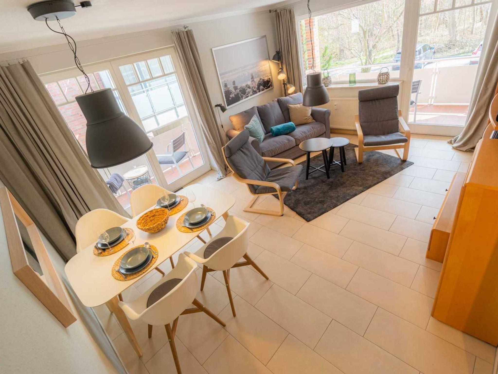 Wohnzimmer mit Sofa für 2-3 Personen, 2 Sesseln, SMART-TV (Kabel), Stereo-Kompaktanlage, Bluetooth-Soundsystem und Esstisch mit 4 Stühlen. Direkter Zugang zu den beiden überdachten Balkonen nach Nordost und nach Südost. Halboffene Küche mit Mikrowelle, Kühlschrank mit Gefrierfach und Geschirrspüler.