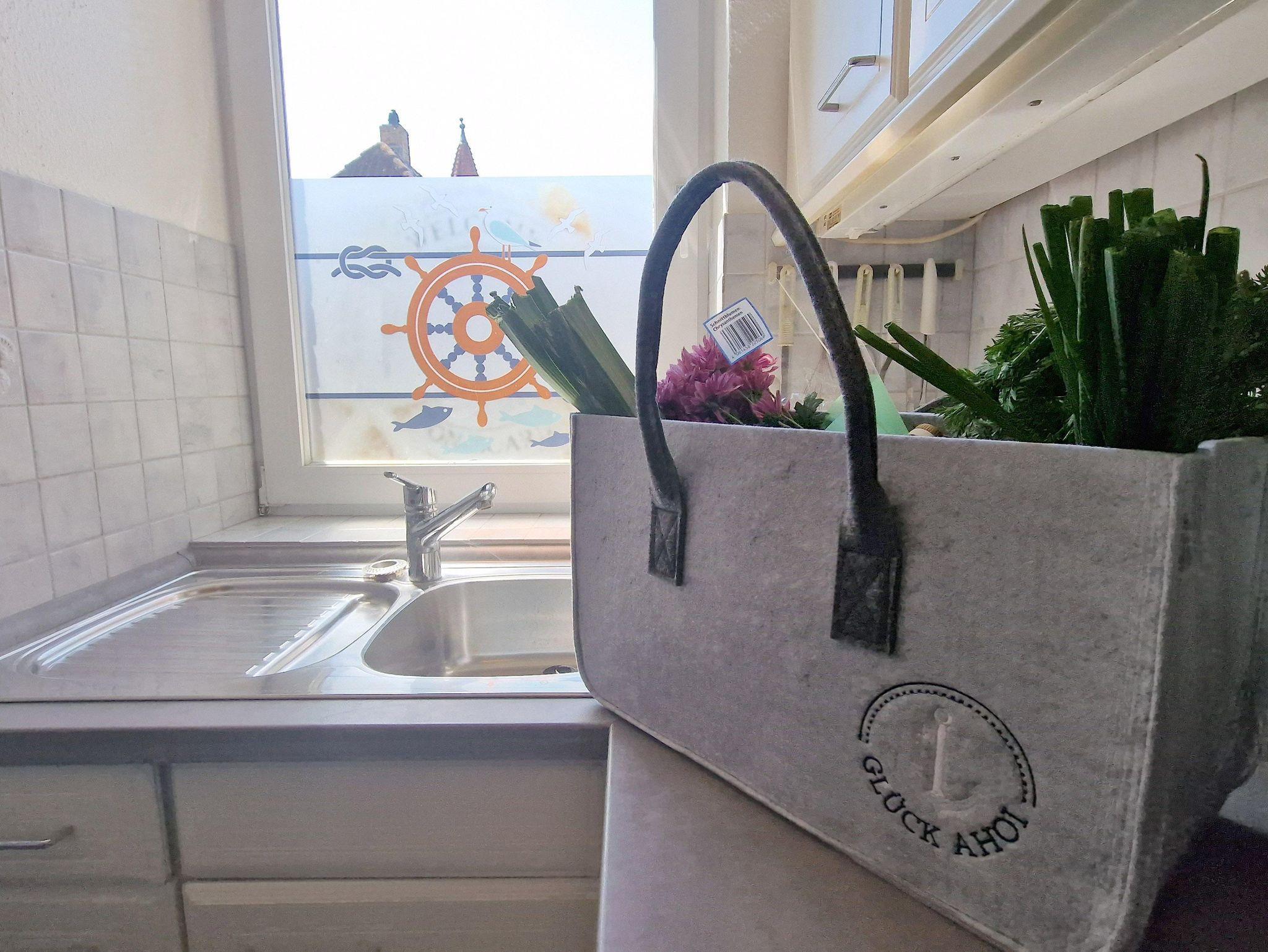 KücheEinbauküche, 4 Platten-Ceranfeld, Dunstabzugshaube, Kühlschrank, Spülmaschine, Kaffeemaschine, Wasserkocher, Toaster, Geschirr, Kochtöpfe
