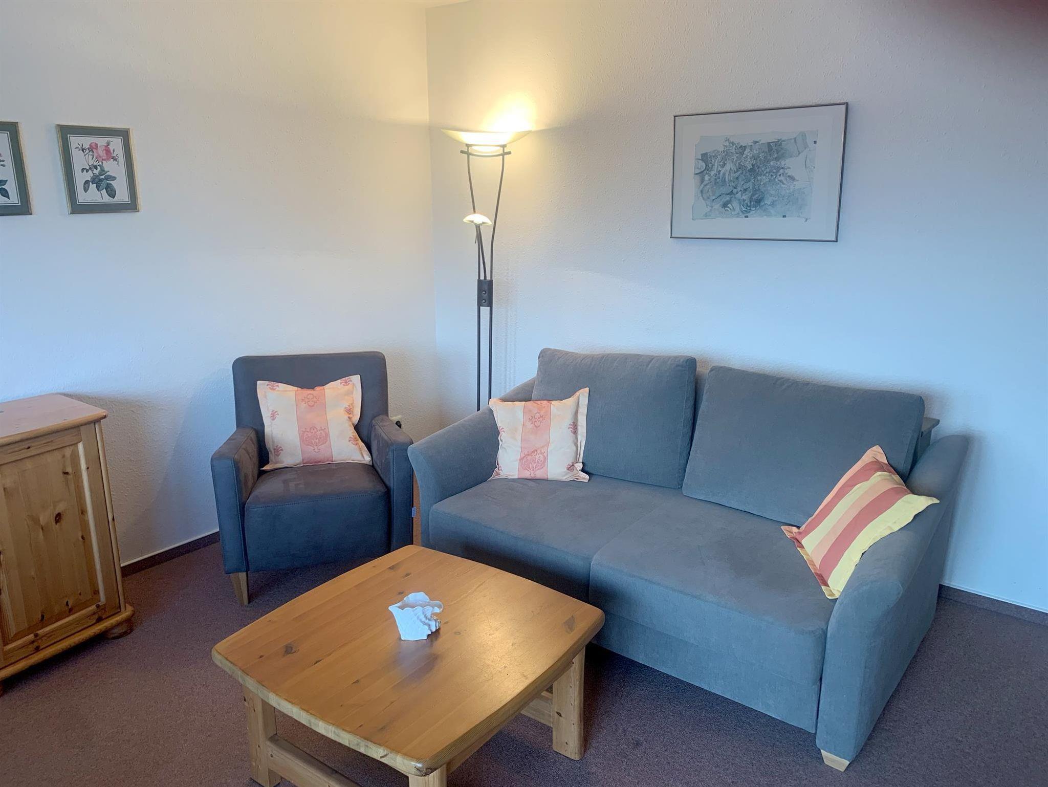 WohnzimmerCouch, Couchtisch, 2 Sessel, Stehlampe, Anrichte, Kabel-TV, Telefon, Stereoradio mit CD-Player, Nachtspeicherofen, Esstisch, 4 Stühle, Küchenzeile, 4 Plattenherd mit Backofen, Dunstabzugshaube, Kühlschrank, Kaffeemaschine, Wasserkocher, Toaster, Handmixer, Geschirr, Kochtöpfe