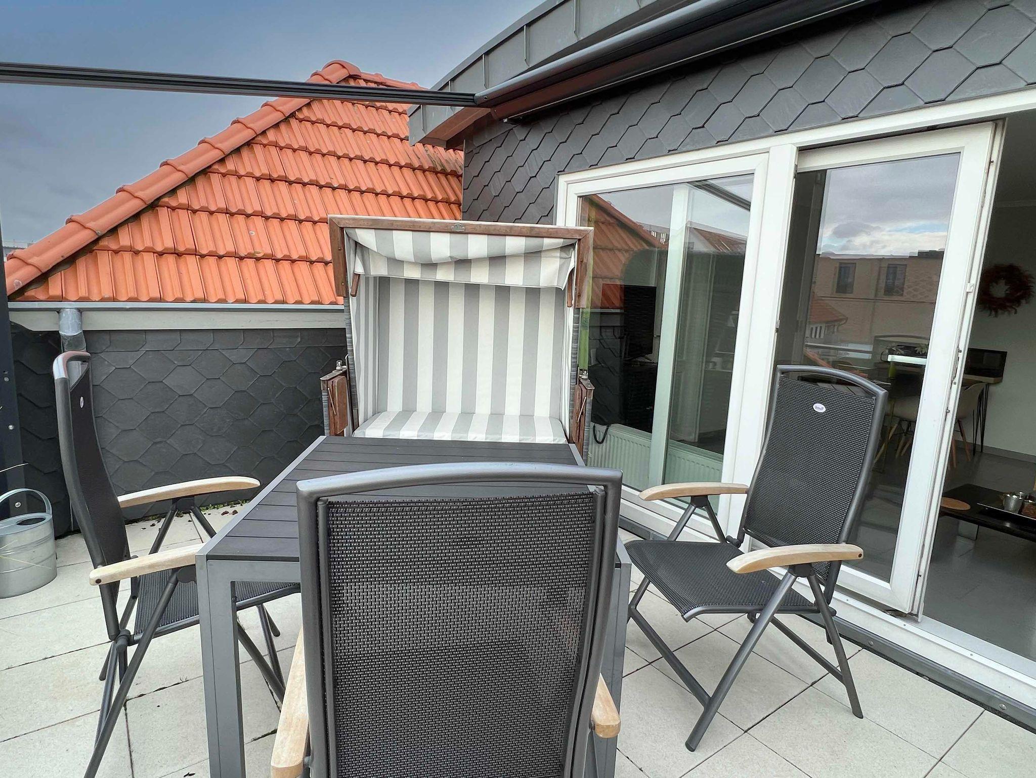 • Dachterrasse mit Gartenmöbeln und Strandkorb