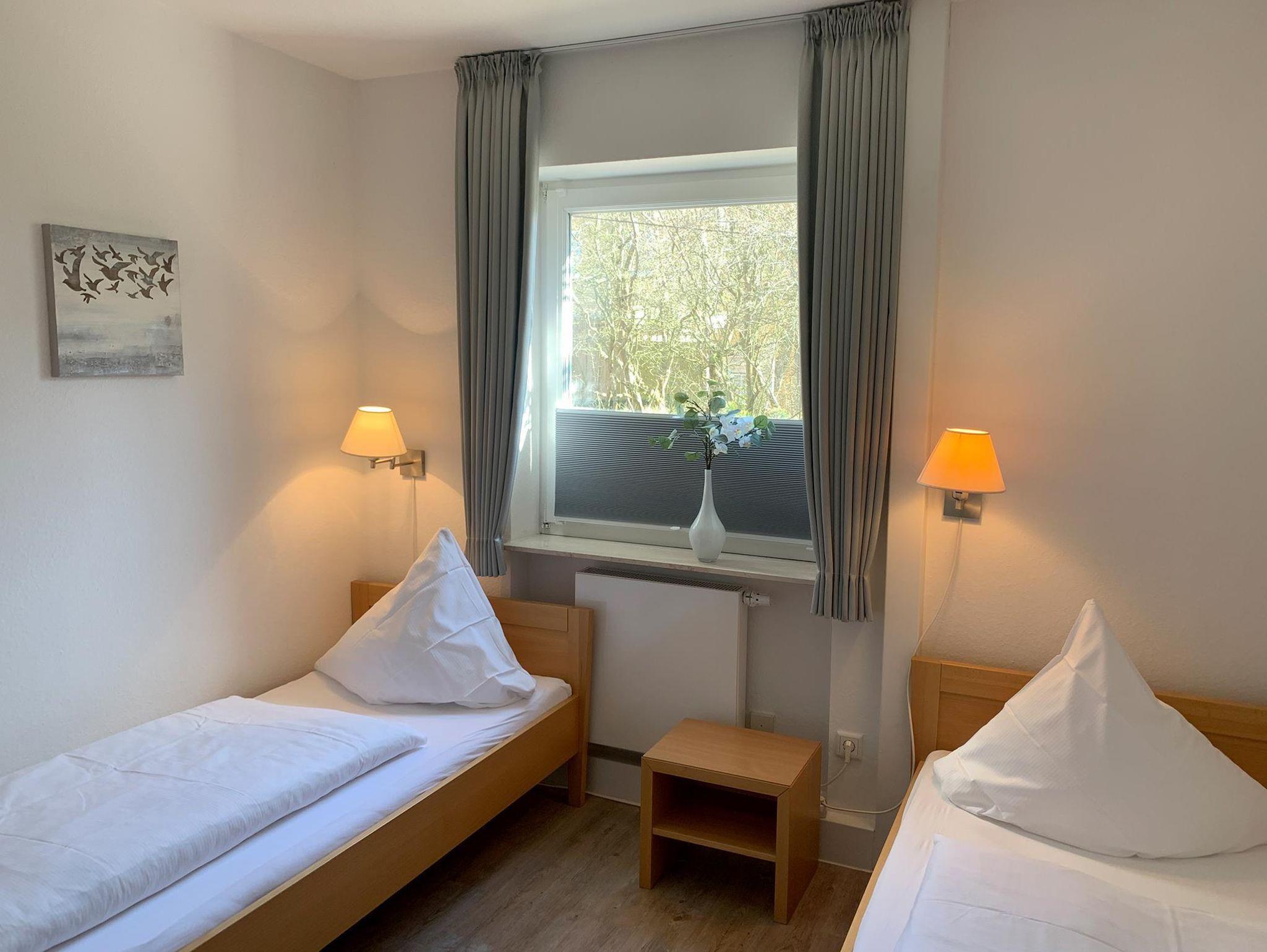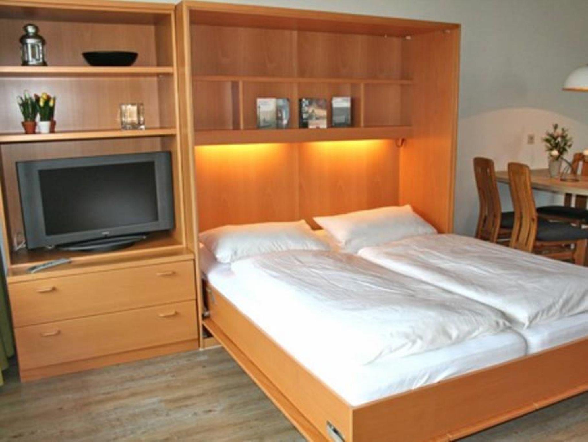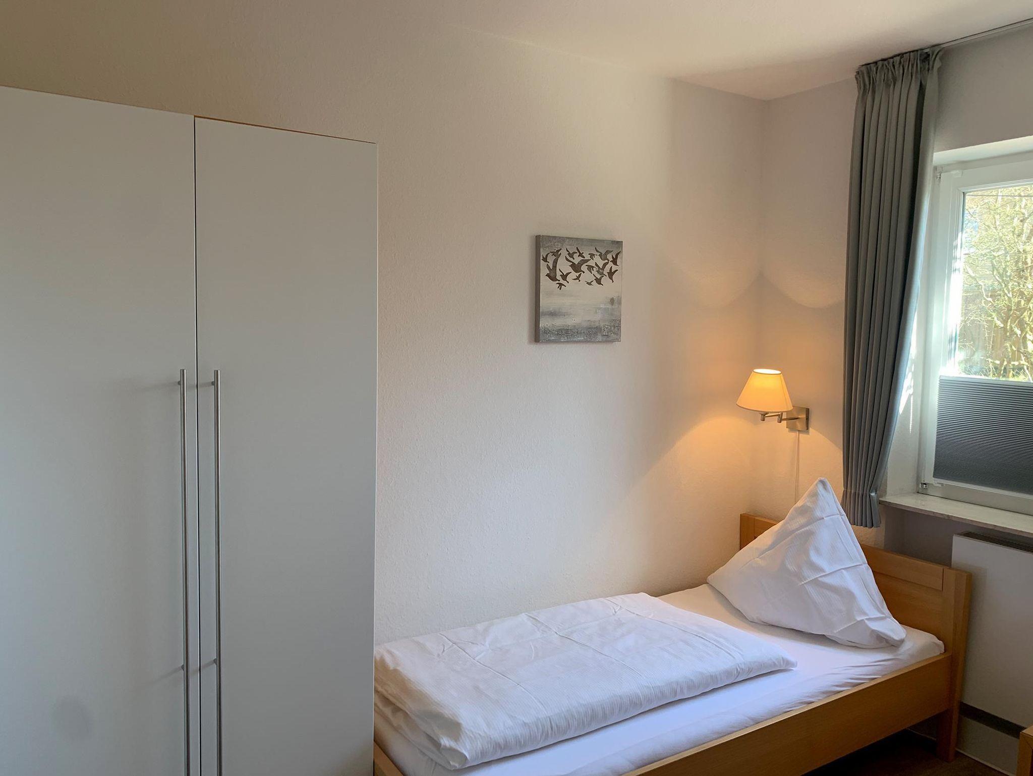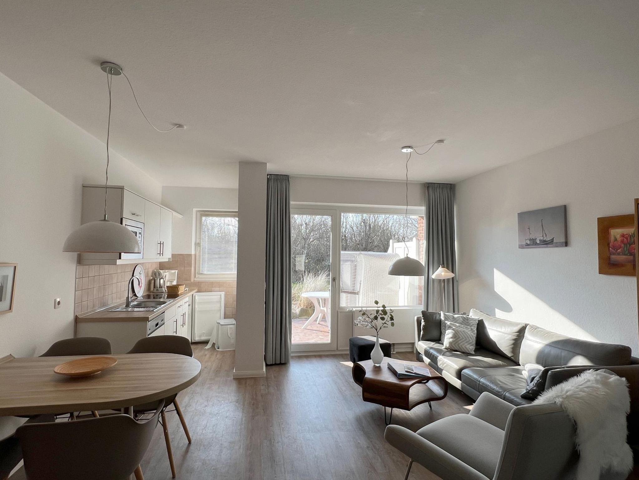 Die Wohnung teilt sich wie folgt auf: Eingangsdiele mit Garderobe, Schlafzimmer mit 2 Einzelbetten, (90x200cm) Duschbad mit WC. Der großzügige Wohnraum mit direktem Zugang zur Terrasse und Garten überzeugt mit seiner gemütlichen Sitzecke und dem direktem Blick nach draußen, der modernen, weißen Küche, der Essecke und als weitere Schlafmöglichkeit 1 Doppelschrankbett. Parkplatz vorhanden.