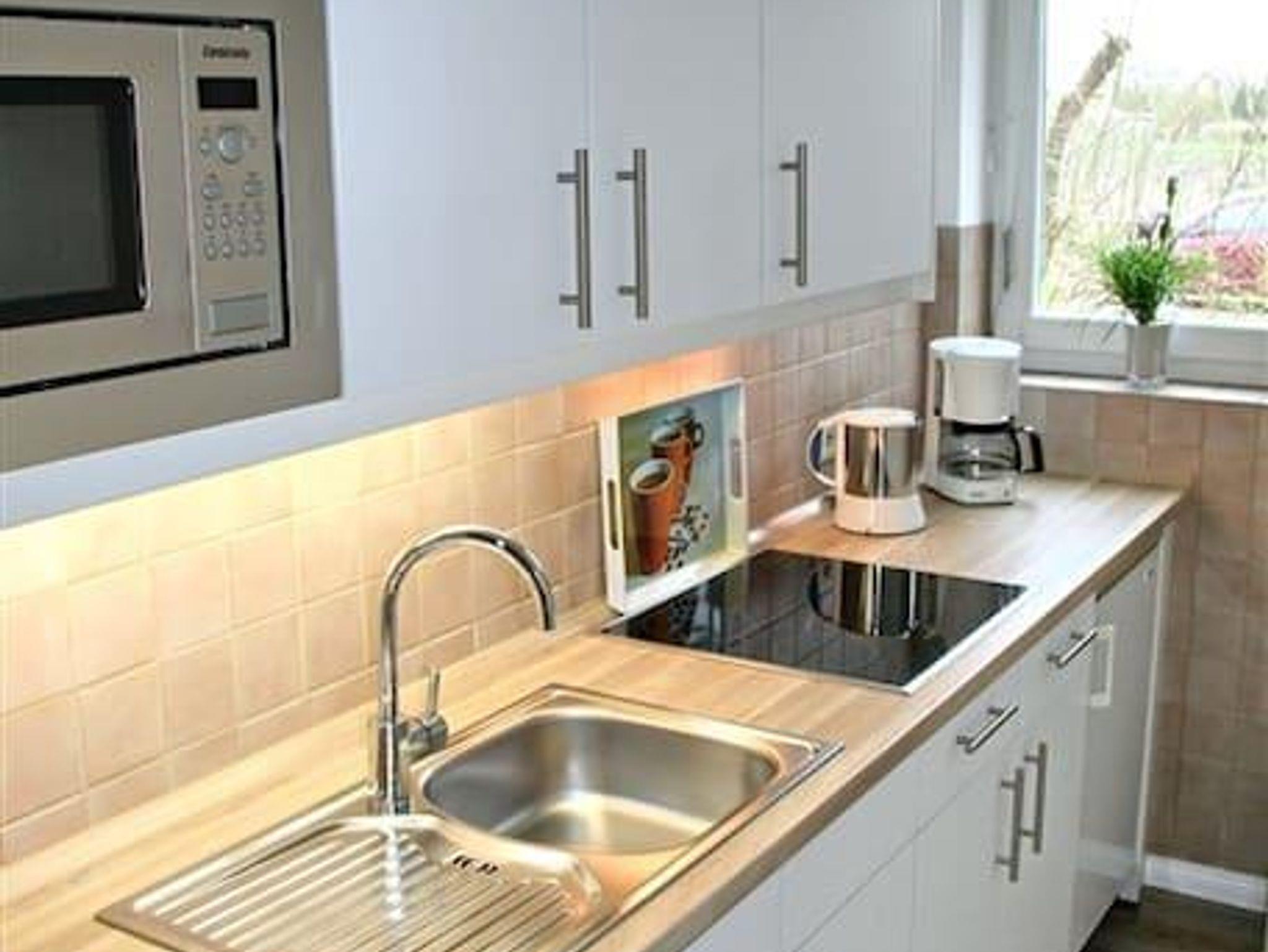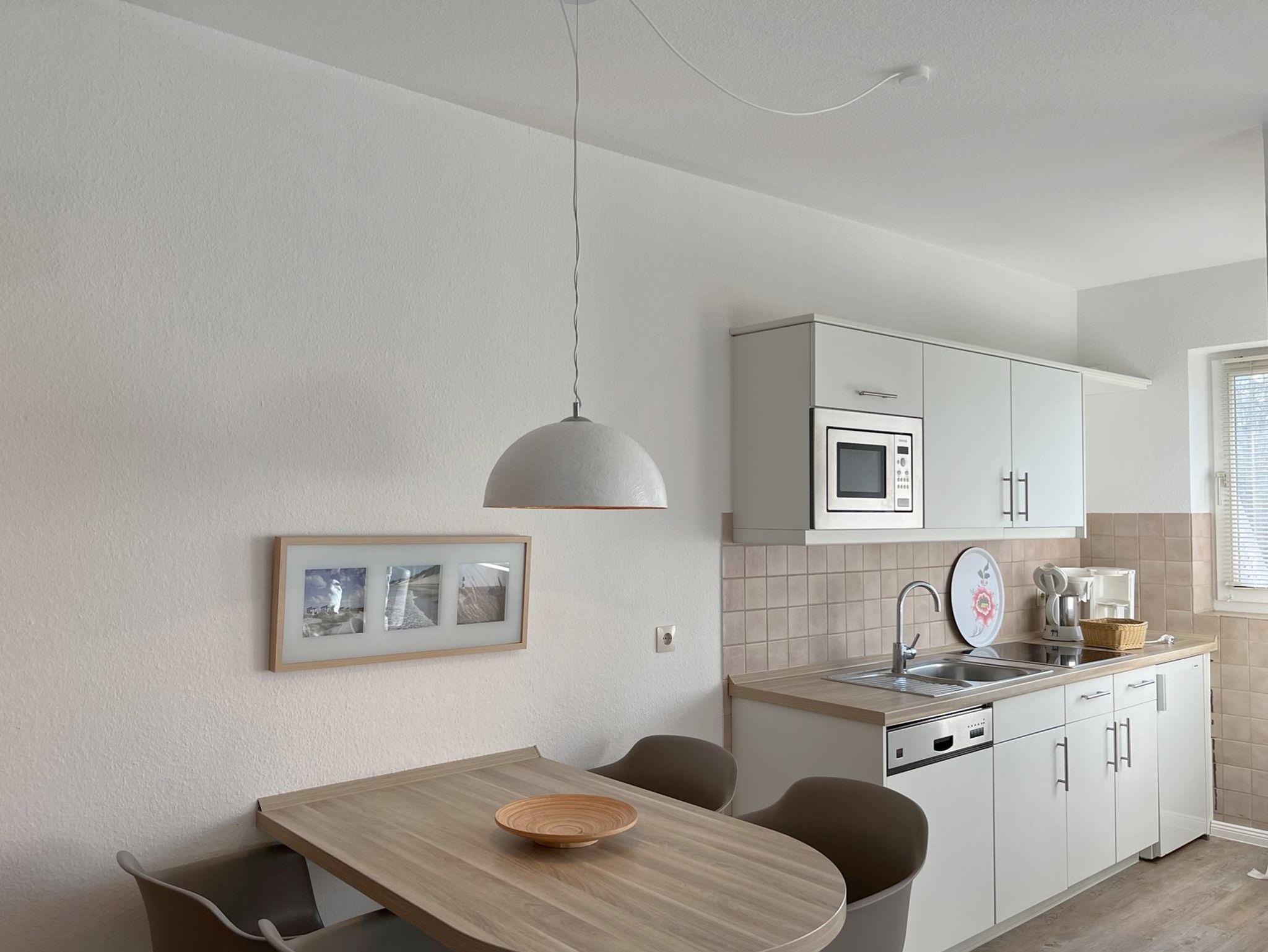 • komplett eingerichtete Küche mit Ceranfeld, Mikrowelle, Geschirrspüler, Kühlschrank mit Gefrierfach, Wasserkocher, Kaffeemaschine (Filter), Toaster.