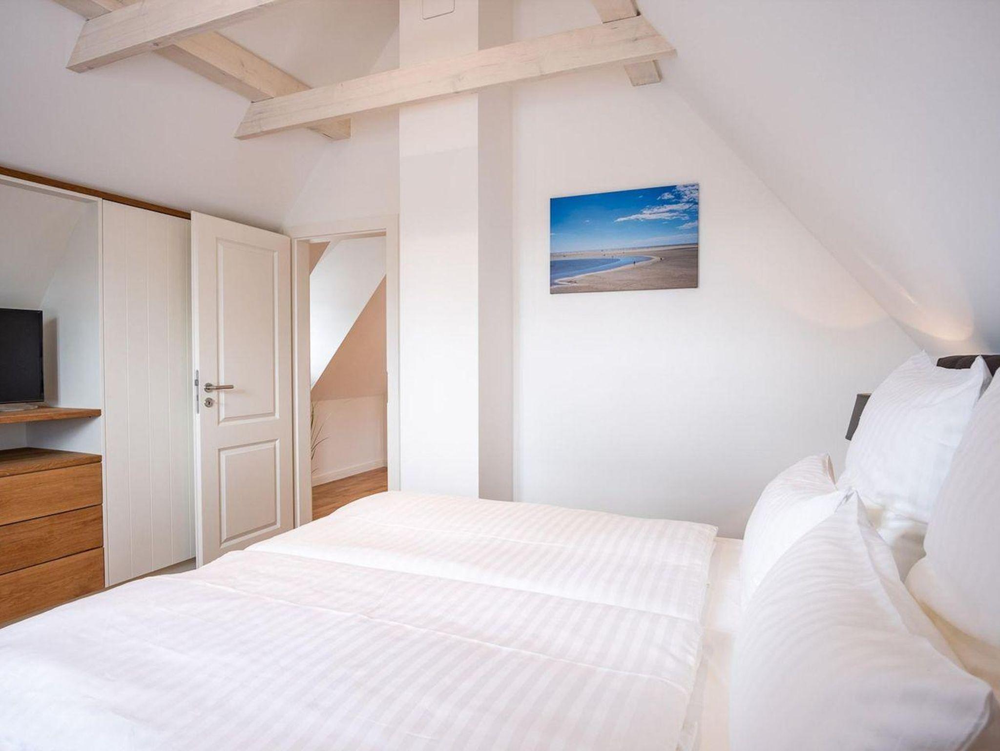Über eine Holztreppe gelangt man in das Obergeschoss. Die beiden Schlafzimmer, eines mit Doppelbett und TV und das andere mit 1 Einzelbett, bieten ruhevolle Erholung.