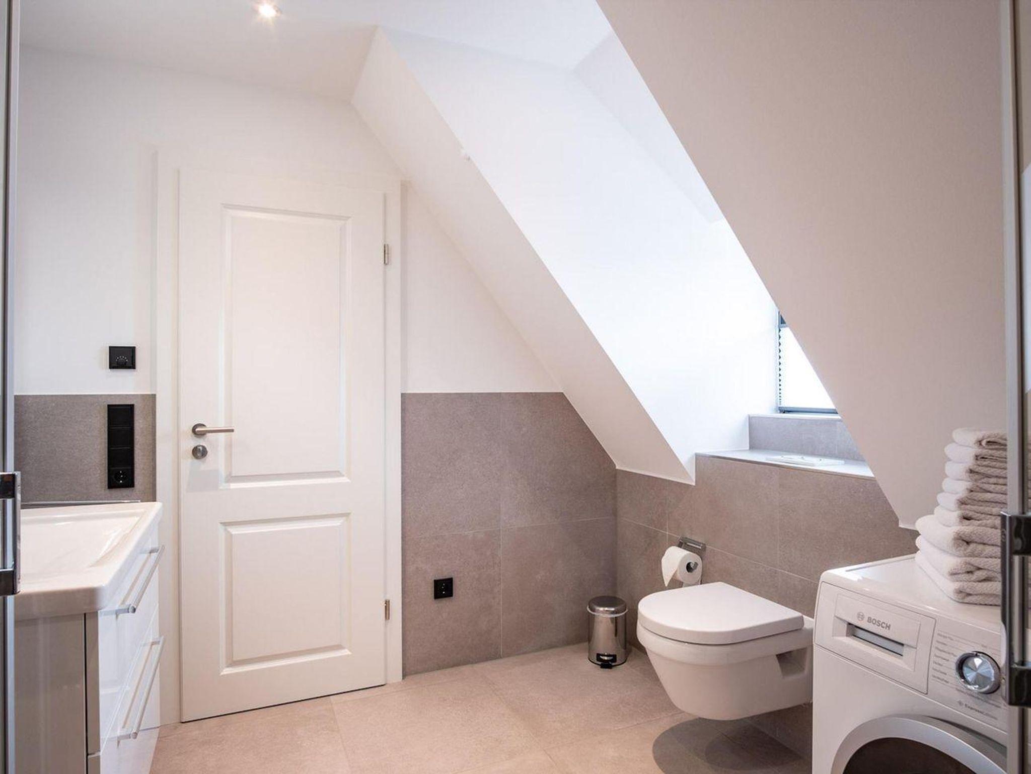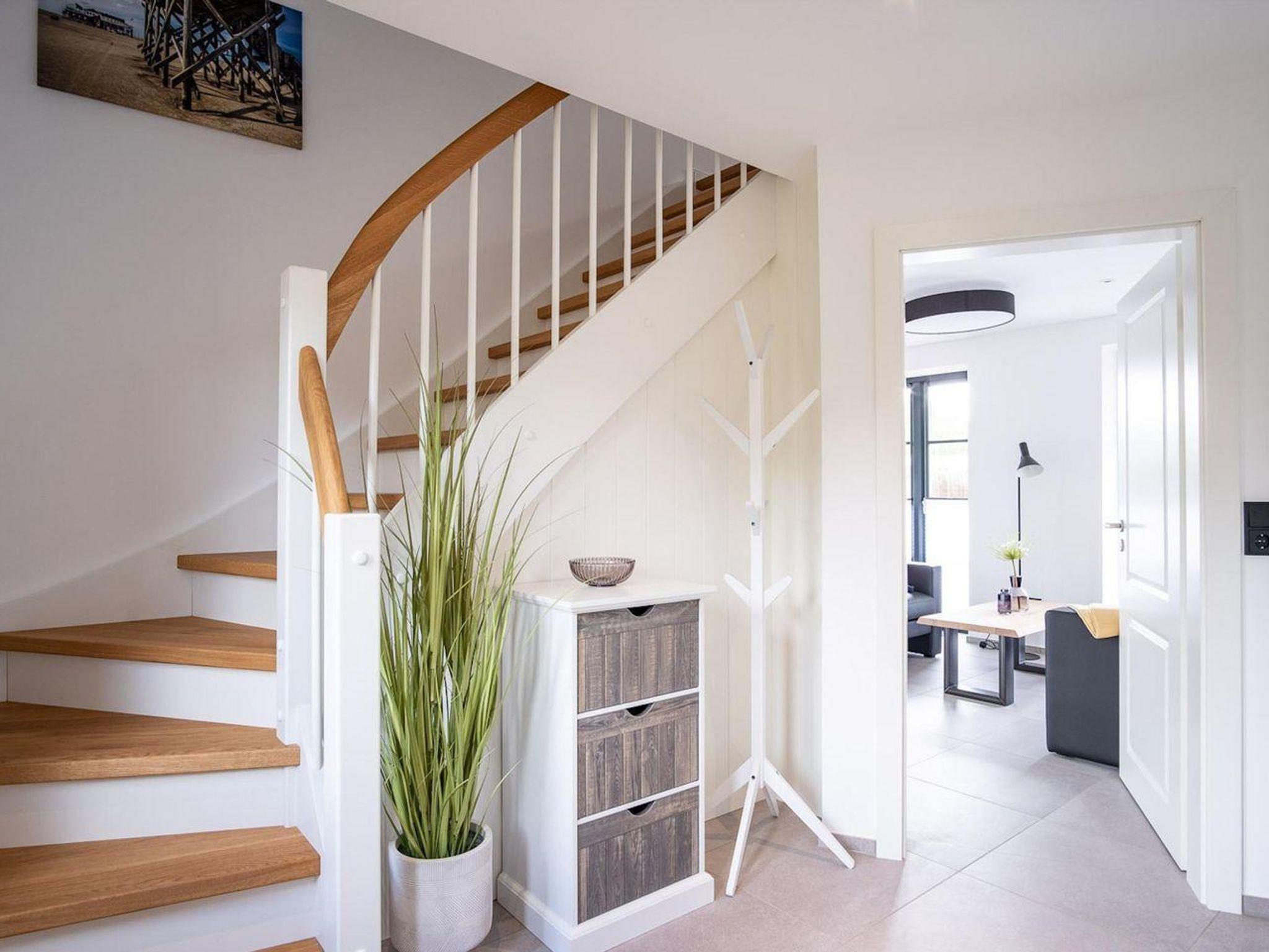 Im Erdgeschoss befindet sich der lichtdurchflutete Wohnraum mit TV, einer luxuriösen, angrenzenden Küche sowie einem stilvollen Essbereich. Der Wohnraum ist mit modernen, stylischen Möbeln eingerichtet. Die Küche verfügt über hochwertige Elektrogeräte und ist voll ausgestattet. An den Wohnbereich schließen sich ein Flur, ein Duschbad und ein Doppelschlafzimmer mit TV an.