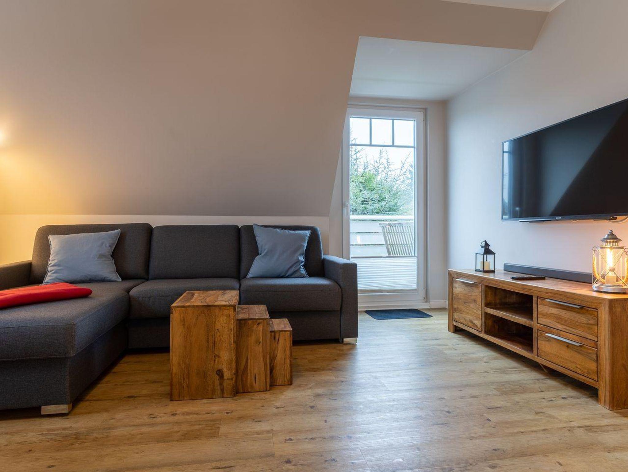 Das App. Dorf im Ferienhaus Rückenwind verfügt über ca. 45 m² Wohnfläche und bietet Platz für 1-3 Personen. Die Wohnung befindet sich im Obergeschoss mit einem großzügige Wohnraum mit TV und einer modernen Wohnküche. Die Wohnräume sind mit neuen und modernen Möbeln ausgestattet. An den Wohnbereich schließen sich ein Duschbad, sowie ein Schlafzimmer mit einem Doppelbett (1,80 x 2,00 m) an. Zusätzlich gibt es im Wohnzimmer ein gemütliches Schlafsofa (1,40 x 2,00 m) für eine Personen. Vom Wohnzimmer gelangen Sie auf einen gemütlichen Balkon (Richtung Nord-West).