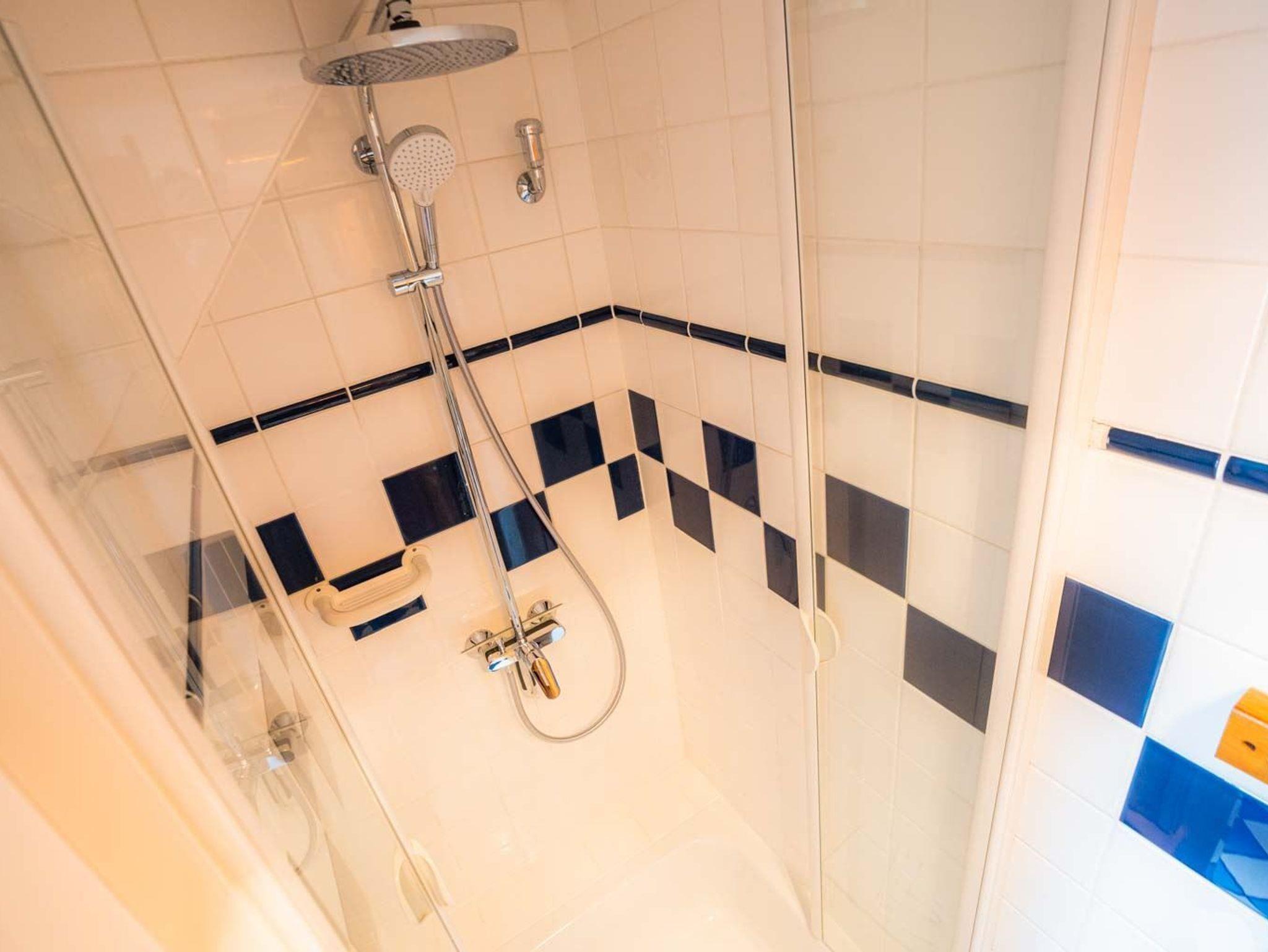 Badezimmer (Duschbad) mit Dusche, Föhn und Tageslicht. Separates WC mit Waschbecken.