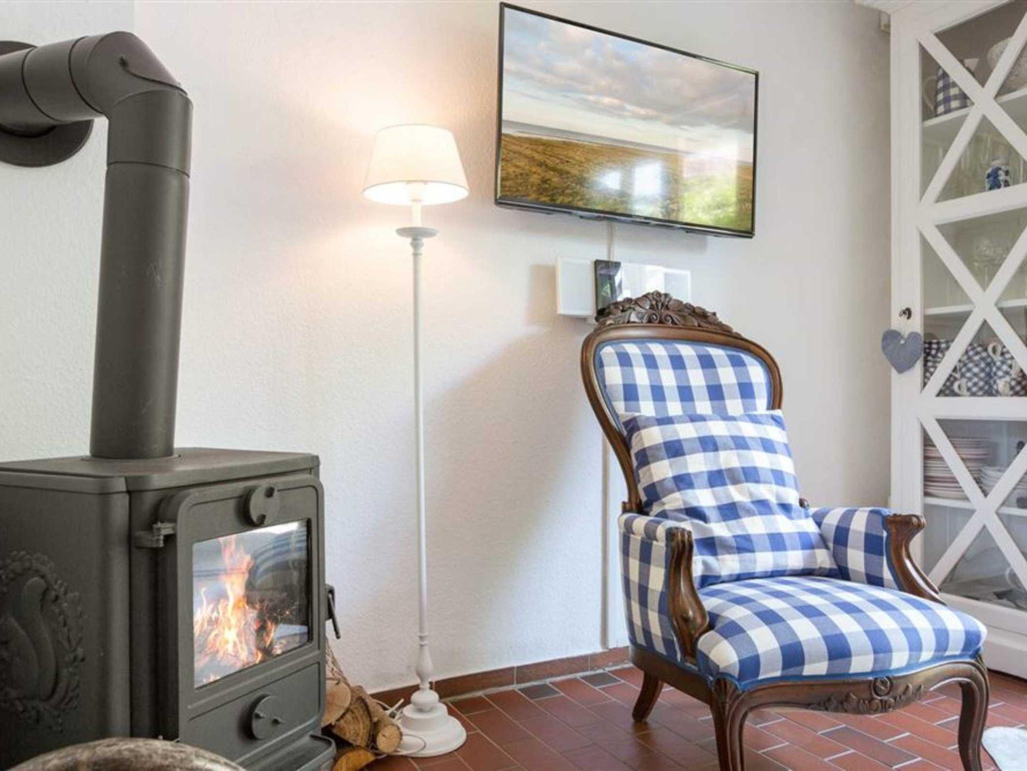 Wohnzimmer mit Sofa (2er), 2 Sesseln, Kaminofen, TV (Sat), Radio mit CD-Player und Esstisch mit 4 Stühlen. Direkter Zugang zur windgeschützten, möblierten Terrasse nach Osten. Ein Tischgrill ist ebenfalls vorhanden. Offene Küche mit Backofen, Kühlschrank mit Gefrierfach und Geschirrspüler. Abstellraum mit Mikrowelle, Staubsauger und Bügelset.