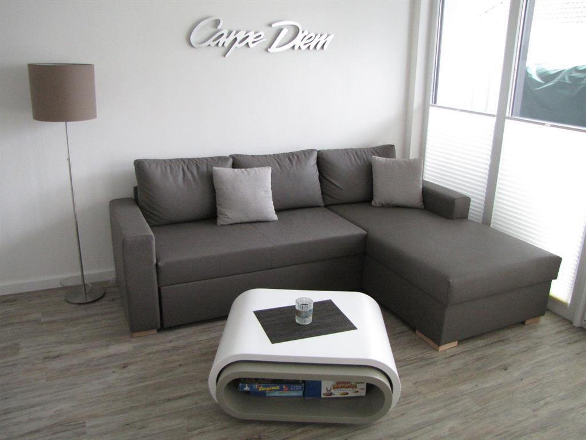 Im Wohnzimmer steht zudem ein gemütliches ausklappbares Ecksofa zur Verfügung, das bei Bedarf zusätzliche Schlafmöglichkeiten bietet.