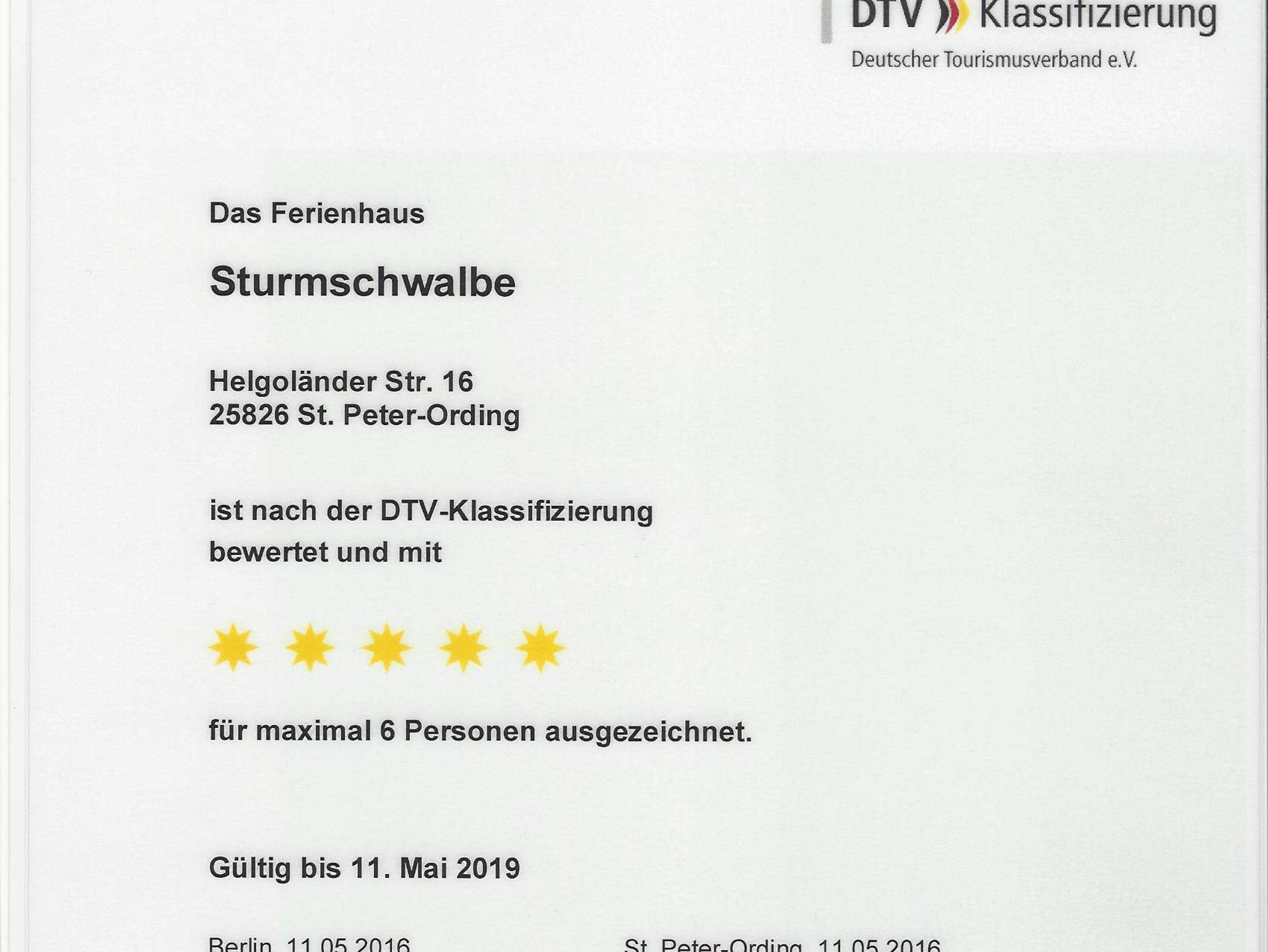 Der Deutsche Tourismusverband hat die Sturmschwalbe mit 5 Sternen ausgezeichnet, wobei die Mindestanforderungen für die 5 Sterne klar übertroffen wurden.