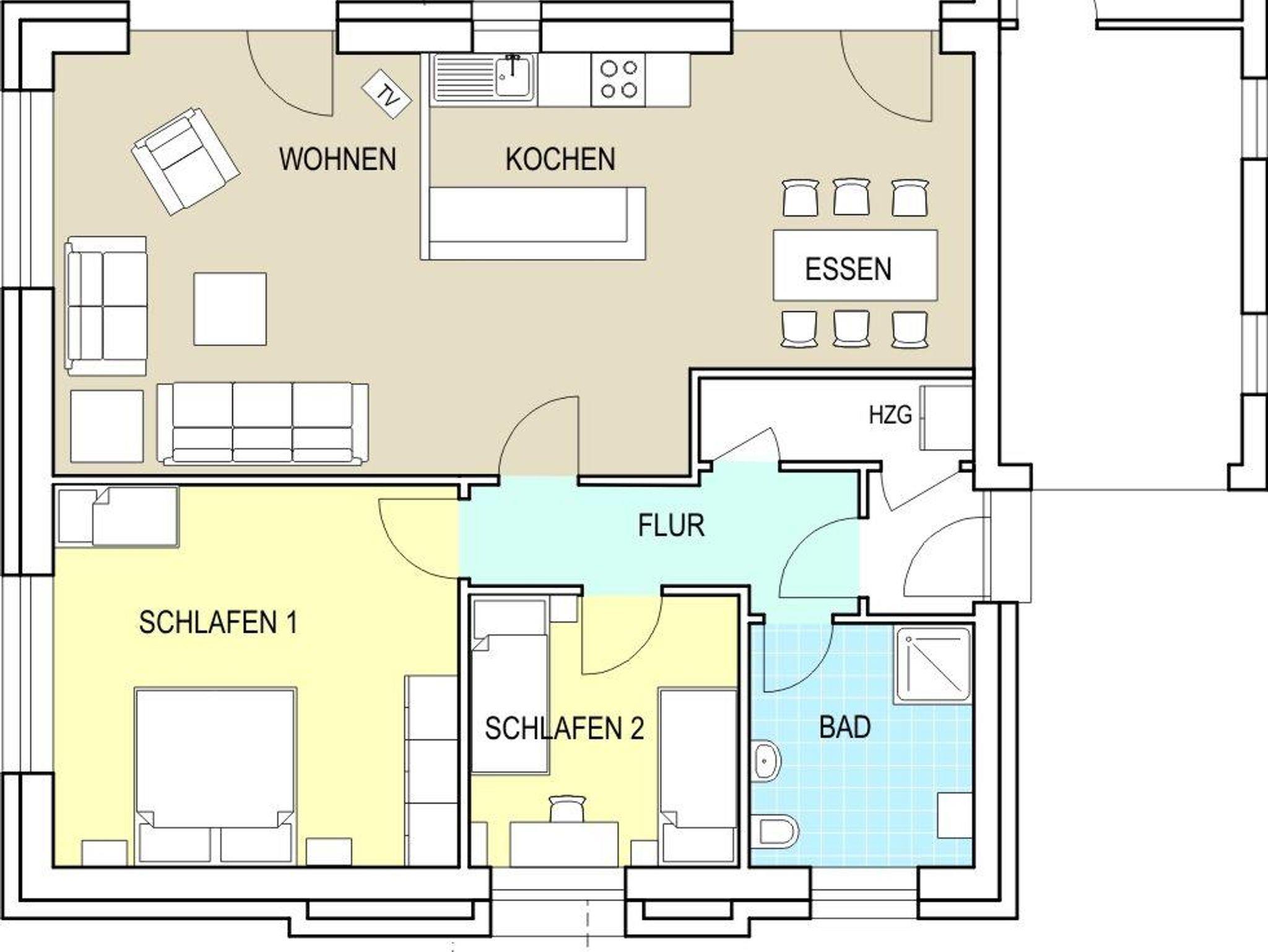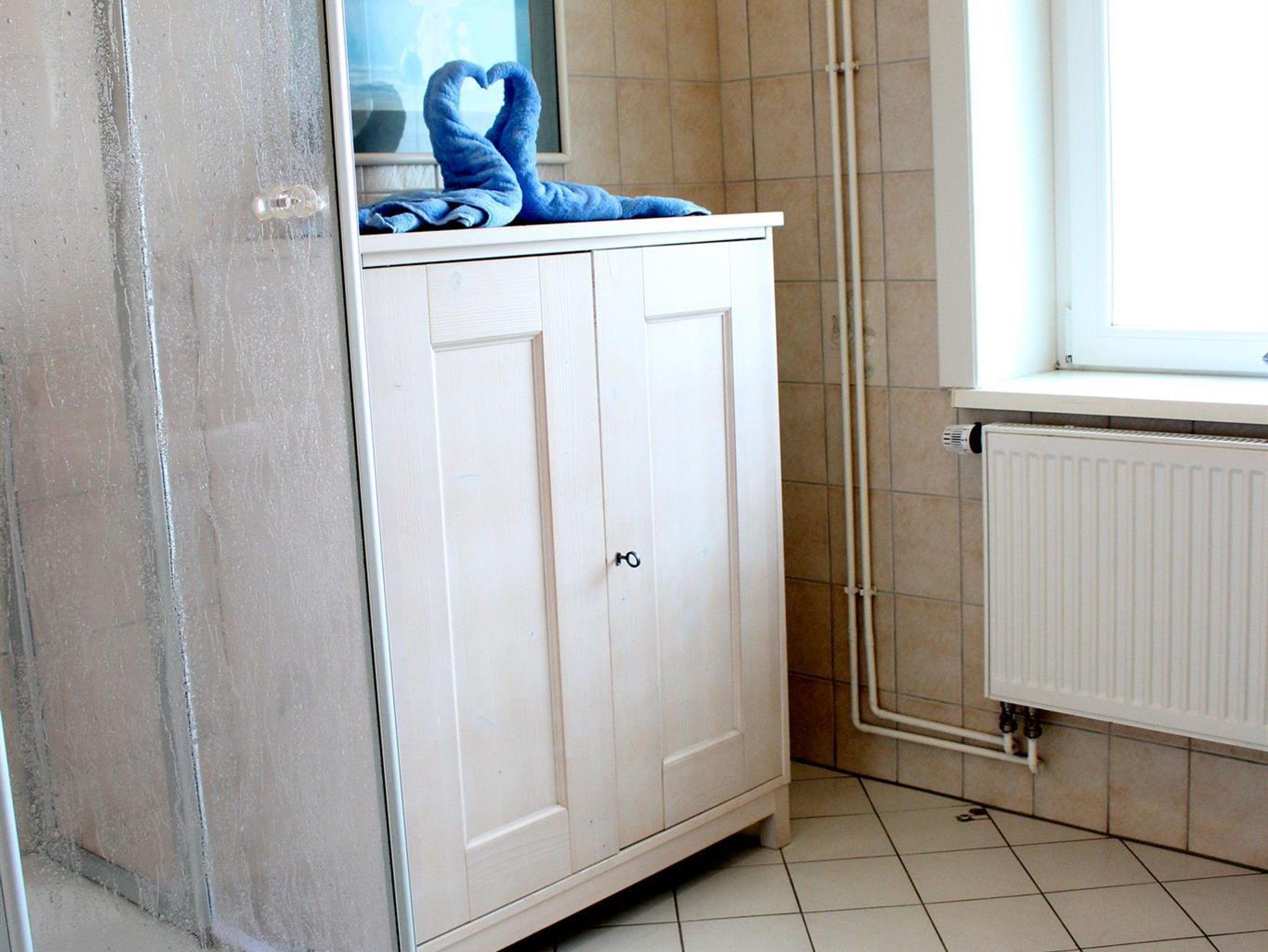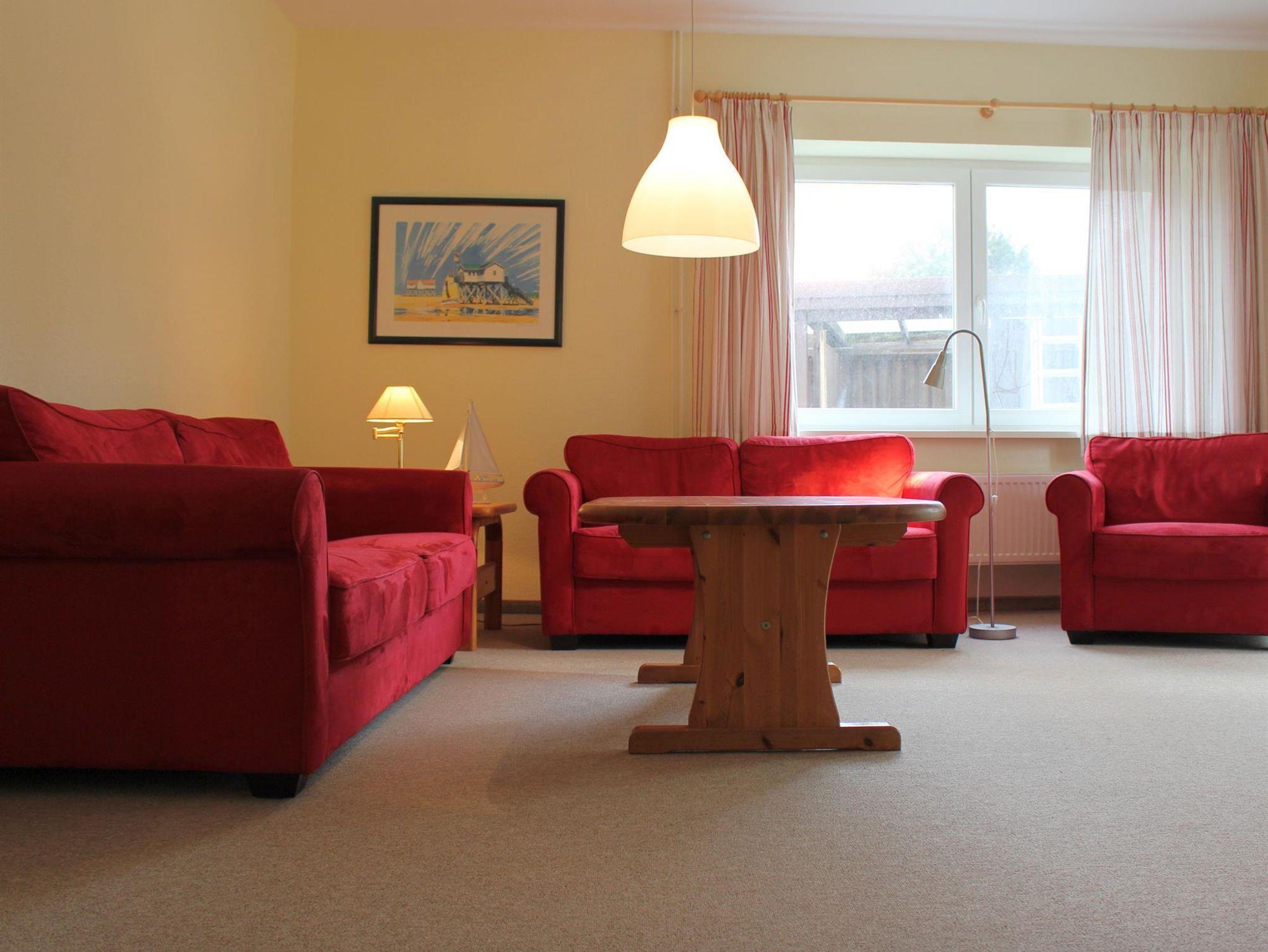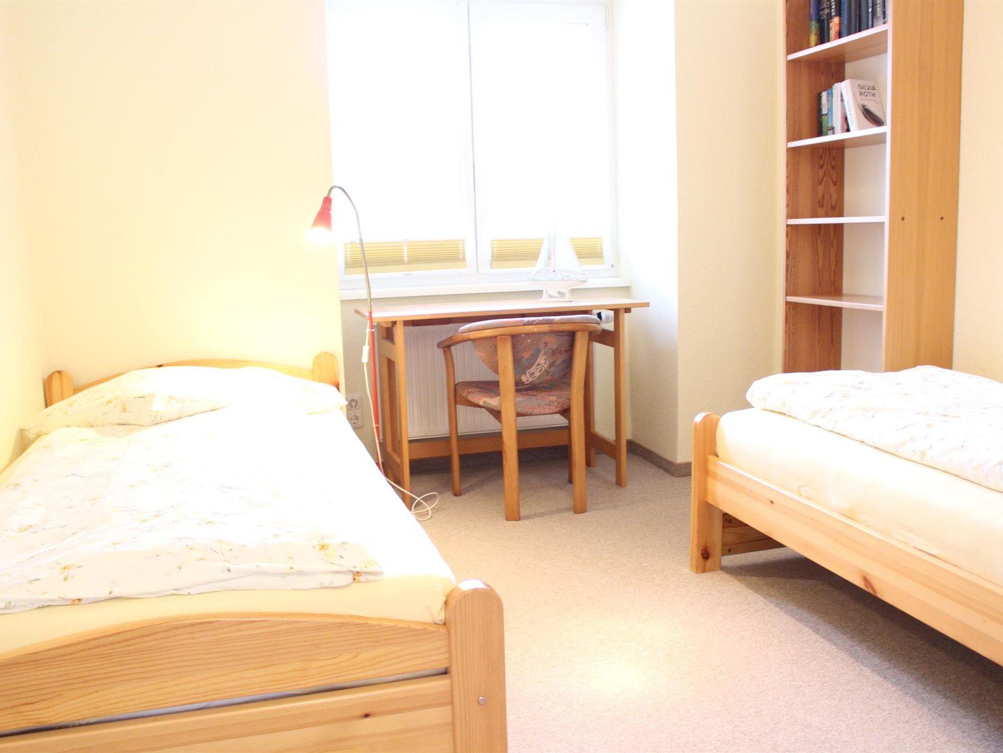 Die Wohnung Strand befindet sich im Erdgeschoss, ist über einen separaten Eingang zu erreichen, ca. 90 m² groß und verfügt über ein Wohnzimmer mit eingebauter Küche, 2 Schlafzimmern mit insgesamt vier Betten (ein Kinderbett kann zugestellt werden), sowie ein Duschbad. Aus dem Wohnzimmer und von der Essecke aus können Sie durch die Terrassentüren auf die Terrasse mit dem Strandkorb und in den Garten gelangen.
