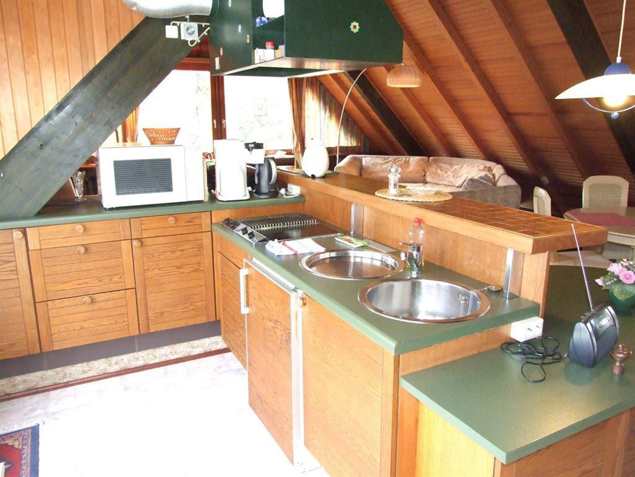 Das Wohnzimmer bietet allen Komfort, eine Küchenzeile mit umfangreicher Ausstattung lädt zum Kochen ein. Schlafnische mit Doppelbett und ein einzelstehendes Extrabett lassen beim Schlafen die freie Auswahl.