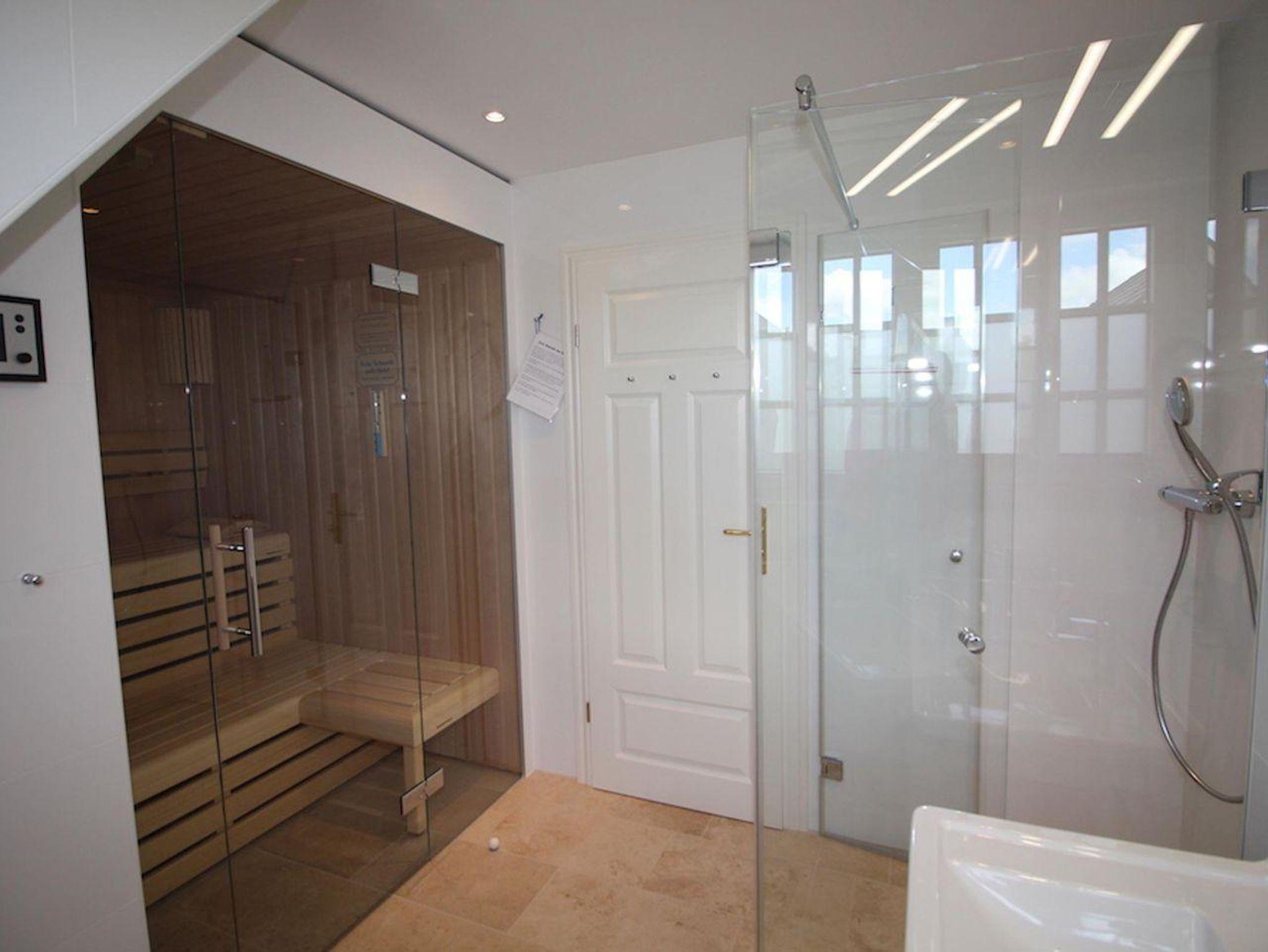 Im Erdgeschoss befindet sich der lichtdurchflutete Wohnraum mit TV, Kamin, einer offenen Küche sowie einem stilvollen Essbereich mit gemütlicher Eckbank. Die Wohnräume sind mit exklusiven Möbeln ausgestattet. Die Küche verfügt über hochwertige Elektrogeräte. An den Wohnbereich schließen sich ein Flur mit eingebauter Garderobe, ein Abstellraum und ein Gästebad an. Ebenso ist Ebenerdig ein Doppelschlafzimmer mit Einbauschränken. Das gesamte Erdgeschoss ist mit geschmackvollen Fußbodenfliesen versehen, die über eine Fußbodenheizung beheizt werden können. Über eine Holztreppe gelangt man in das mit Parkett ausgelegte Obergeschoss. Dieses verfügt ebenfalls über eine Fußbodenheizung. Die beiden Schlafzimmer, jeweils mit einem Doppelbett, sind ebenfalls mit TV ausgestattet. Einbauschränke gewähren Ihnen hinreichend Ablageflächen. Darüber hinaus befinden sich im Obergeschoss zwei weitere, geräumige Bäder mit Dusche. Für zusätzliche Entspannung sorgt eine Sauna mit Sternenhimmel. Vom Obergeschoss führt die Holztreppe hinauf in das Dachgeschoss. Ein drittes Schlafzimmer mit Doppelbett und großen Fenstern mit Blick bis zum Wasser erfüllt jeden Urlaubstraum.