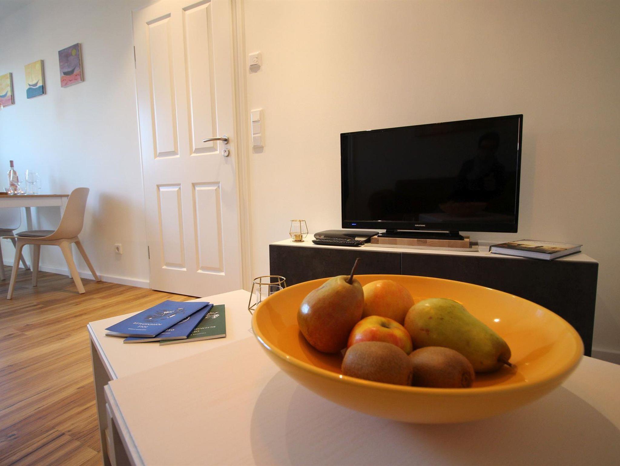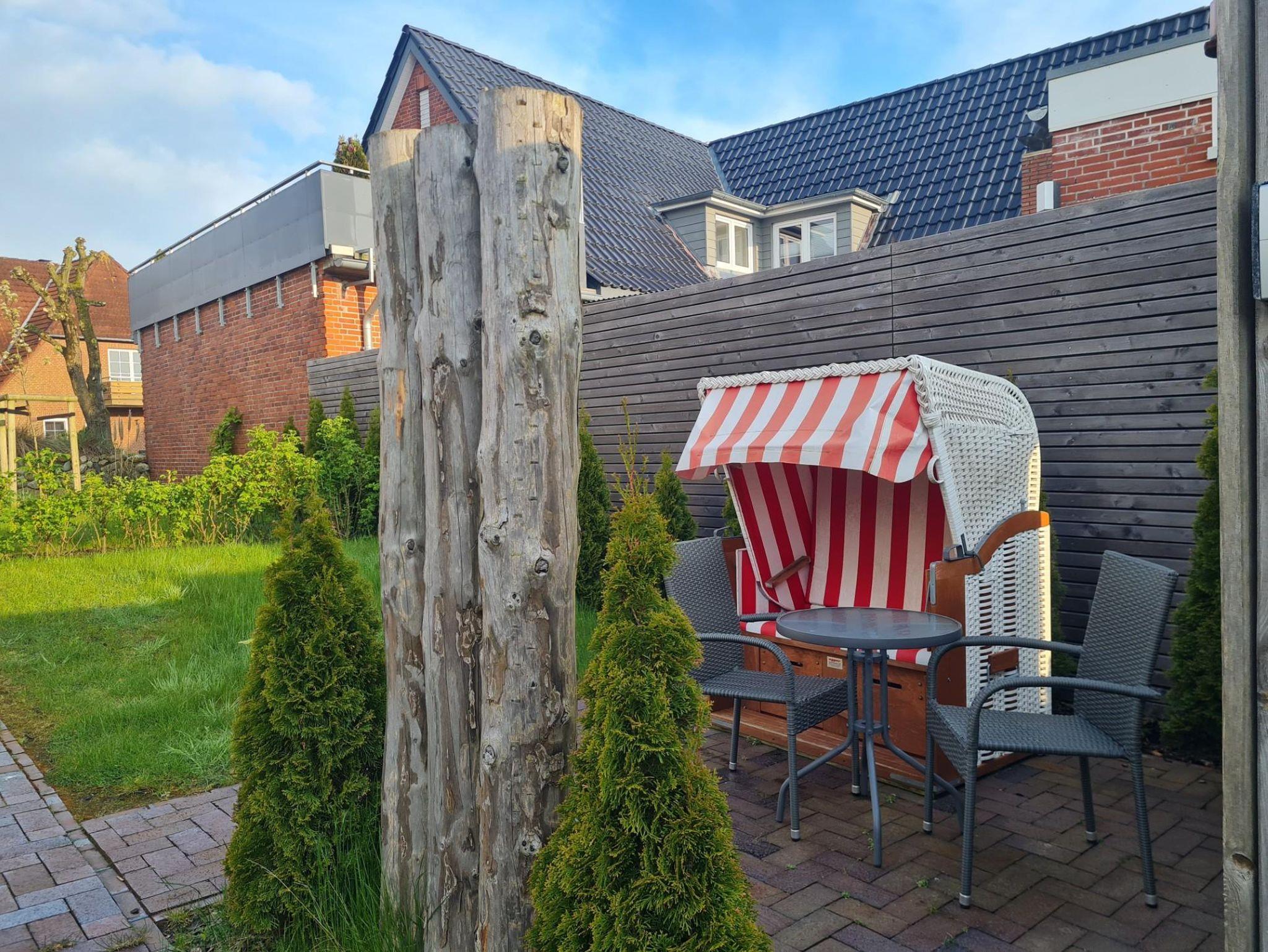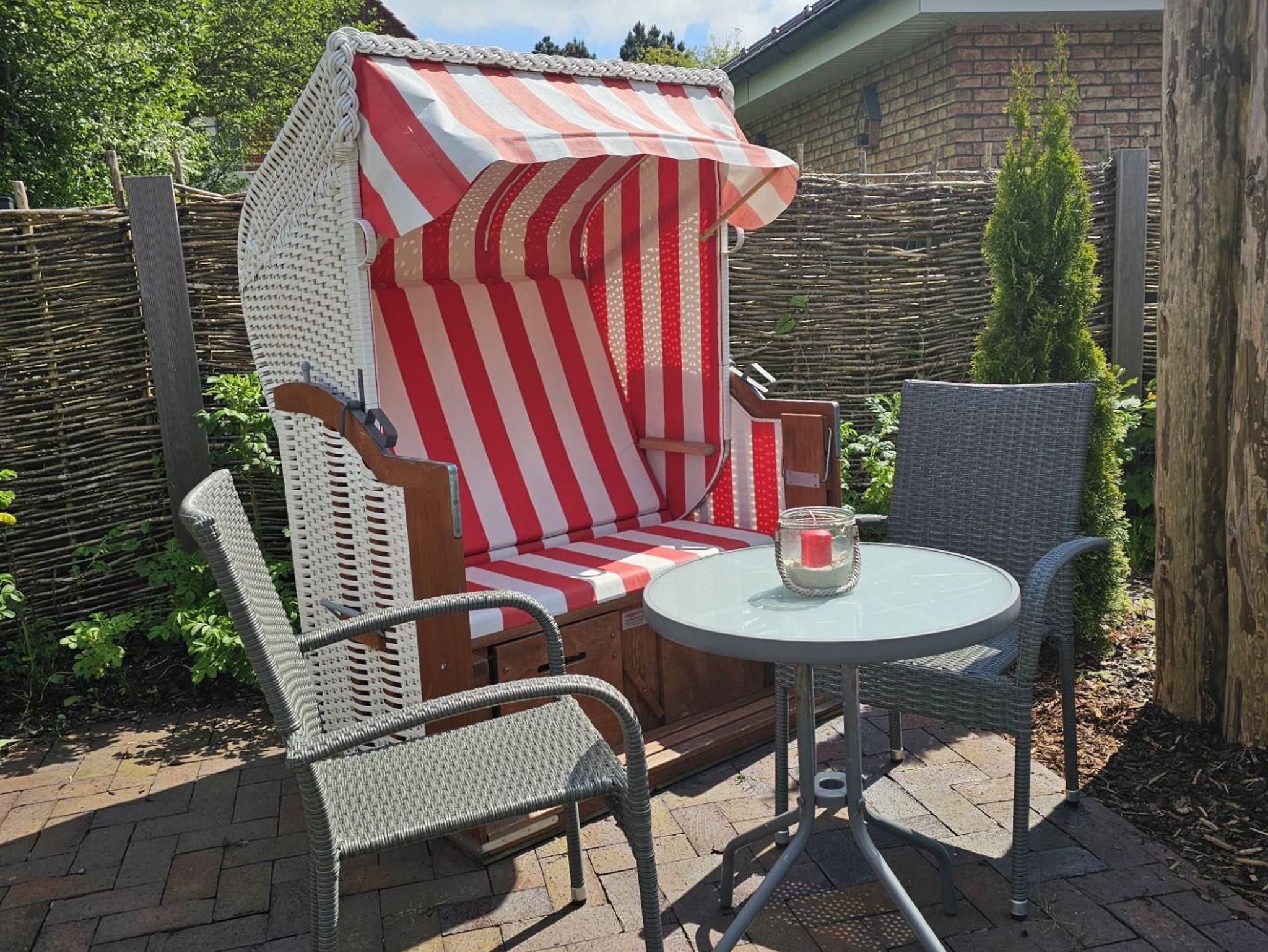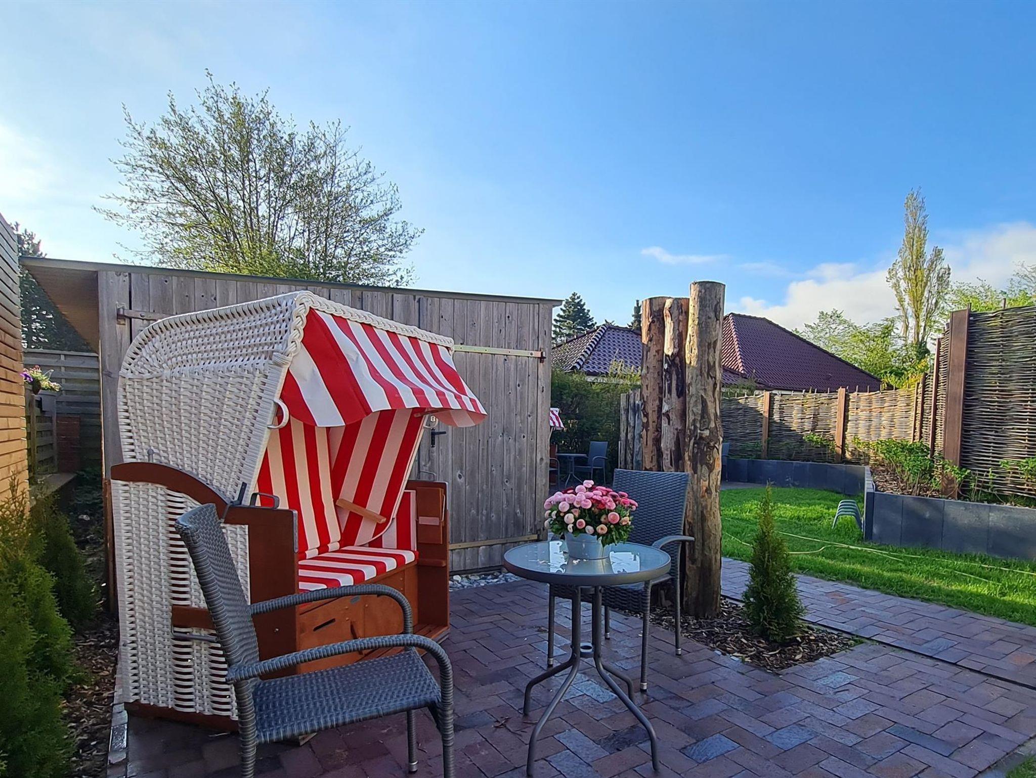 Eine zur Wohnung gehörende kleine Terrasse im hinteren Garten mit Strandkorb, Tisch und zwei Stühlen bietet einen Rückzugsort, wenn es mal nicht zum Strand gehen soll. Fahrräder können in einem Radständer oder auch in einem kleinen Fahrradschuppen abgestellt werden. Eine Lademöglichkeit für E-Bikes ist im Fahrradschuppen ebenfalls vorhanden. In der Wohnung und auf der Terrasse ist WLAN möglich. Ferner gehört zu der Ferienwohnung ein Stellplatz auf dem Grundstück.