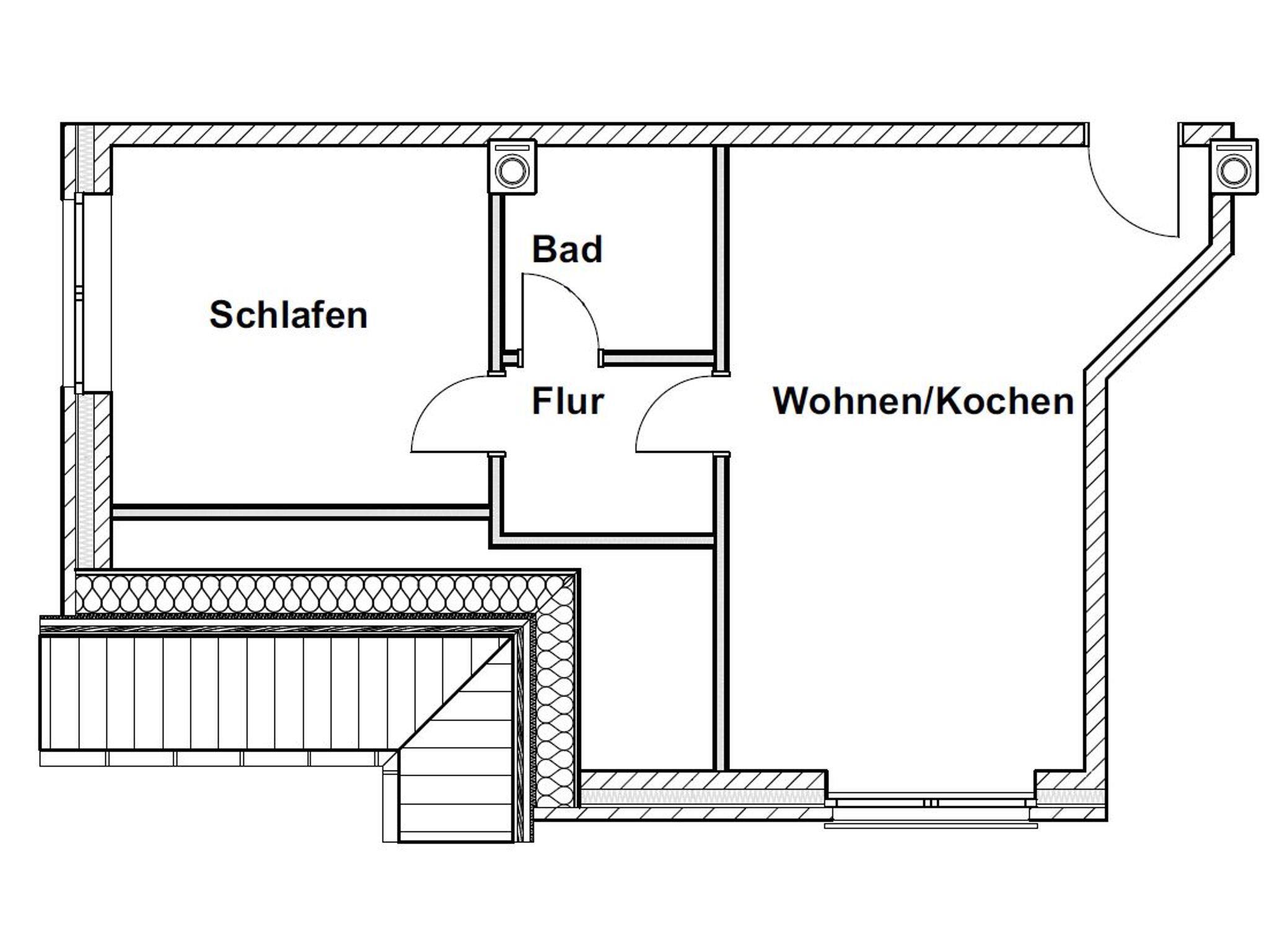 Die Wohnung ist ca. 35 qm groß, im Obergeschoss gelegen und bietet Platz für zwei Personen.