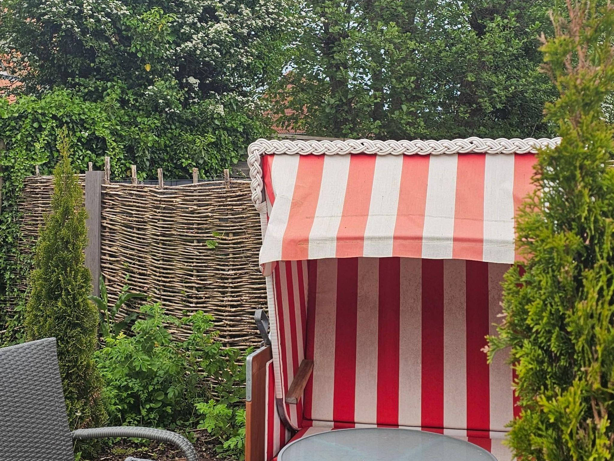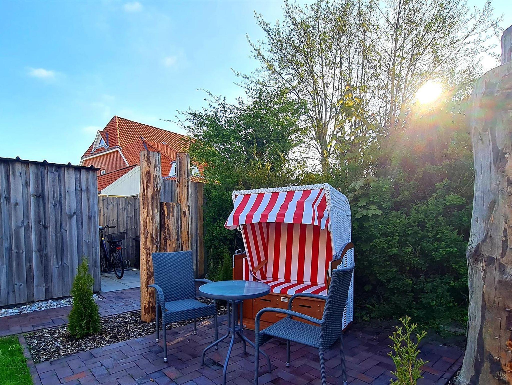 Eine zur Wohnung gehörende kleine Terrasse im hinteren Garten mit Strandkorb, Tisch und zwei Stühlen bietet einen Rückzugsort, wenn es mal nicht zum Strand gehen soll. Fahrräder können in einem Radständer oder auch in einem kleinen Fahrradschuppen abgestellt werden. Eine Lademöglichkeit für E-Bikes ist im Fahrradschuppen ebenfalls vorhanden. In der Wohnung und auf der Terrasse ist WLAN möglich. Ferner gehört zu der Ferienwohnung ein Stellplatz auf dem Grundstück.