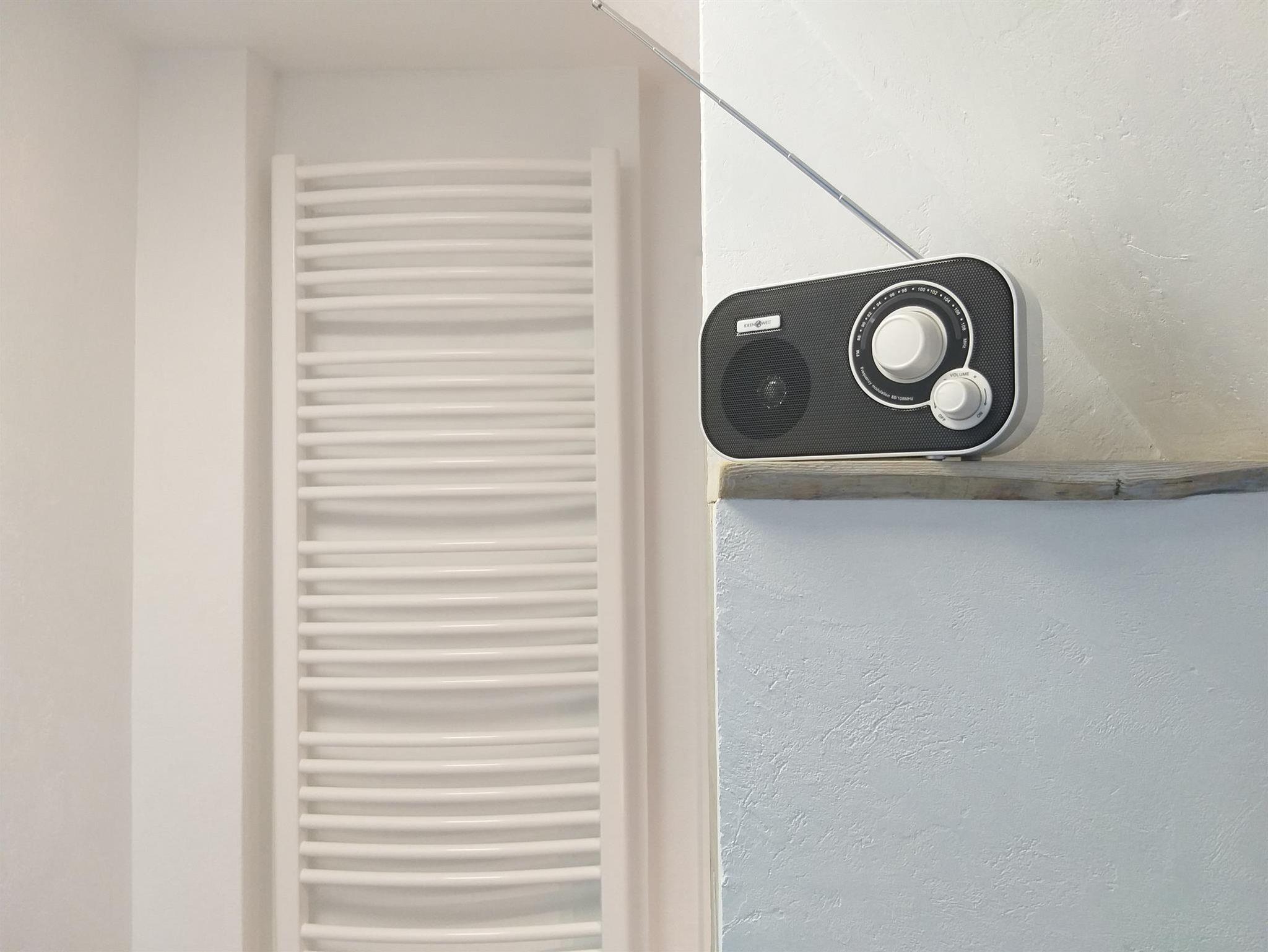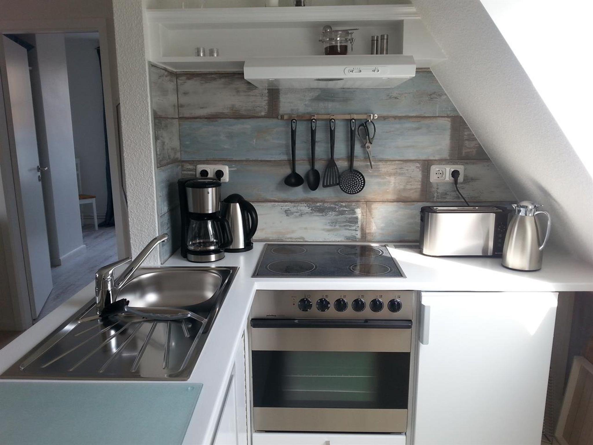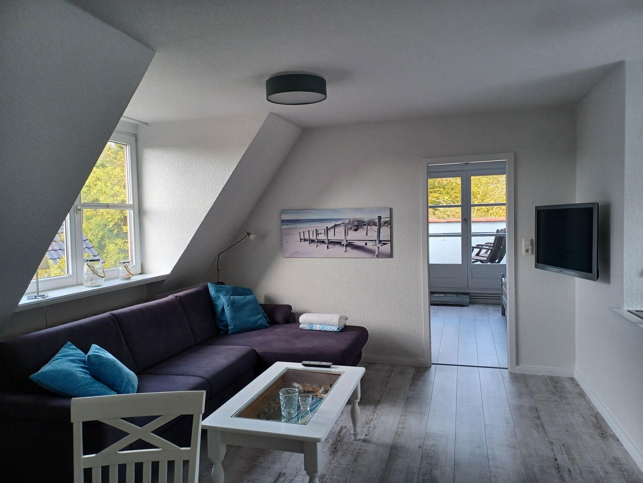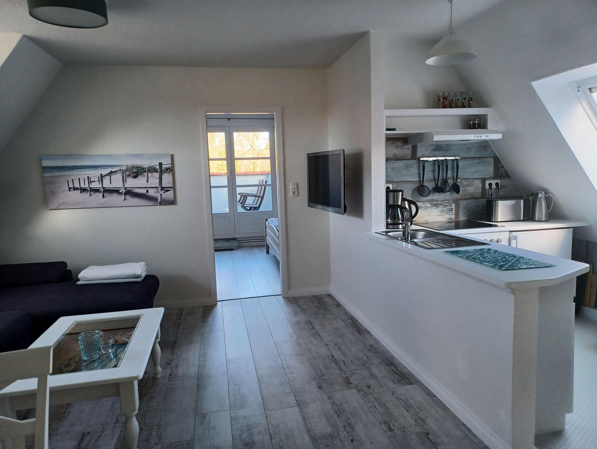 Das helle Wohnzimmer hat eine Essecke mir vier Stühlen, einen Flachbildfernseher mit Satelitenempfang und ein kleines Radio, einen Couchtisch und ein bequemes neues Sofa mit Ottomanen. Die zum Wohnzimmer hin offene Küche ist mit einem Cerankochfeld und Backofen, Dunstabzug, Kühlschrank mit Gefrierfach, Wasserkocher, Kaffeemaschine, Espressokocher, Toaster, umfangreichem Geschirr, Besteck, Messern sowie Töpfen und Pfannen ausgestattet. Ein großer, eigener, wind- und sichtgeschützter Balkon (zum Garten hin) lädt mit seiner Ruhe zum Verweilen und Entspannen ein. Ihnen stehen darauf vier Teakholzstühle incl. Sitzauflagen, ein größerer Tisch sowie ein Sonnenschirm zur Verfügung.