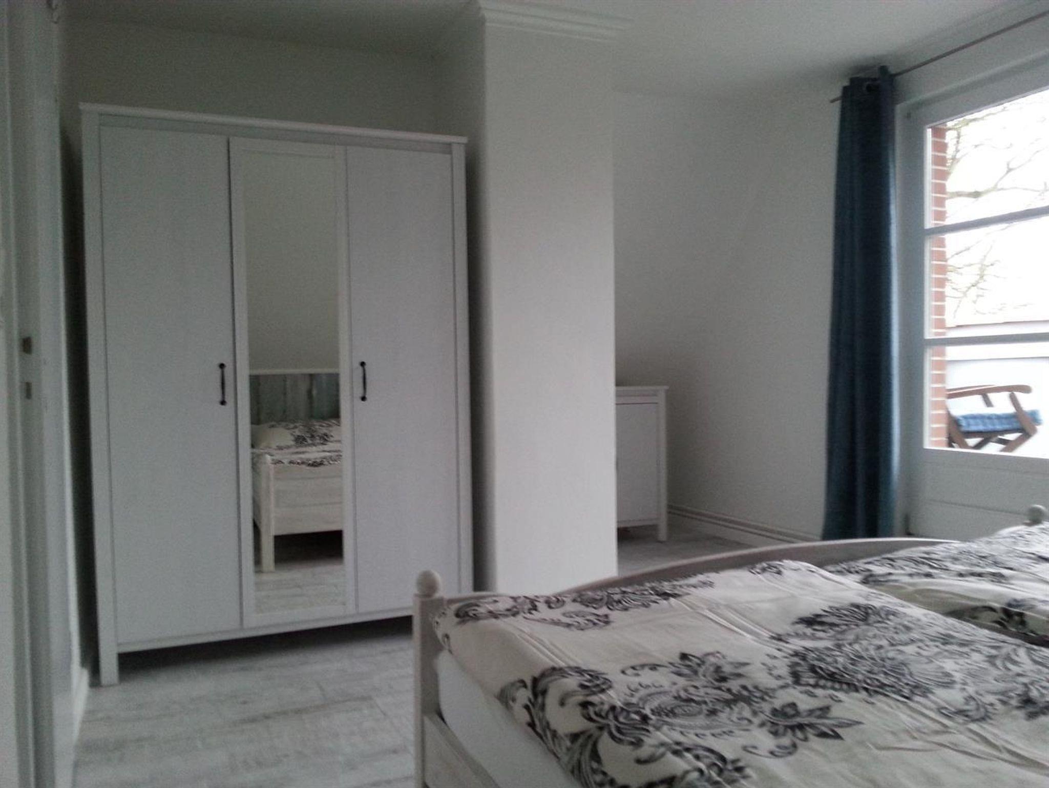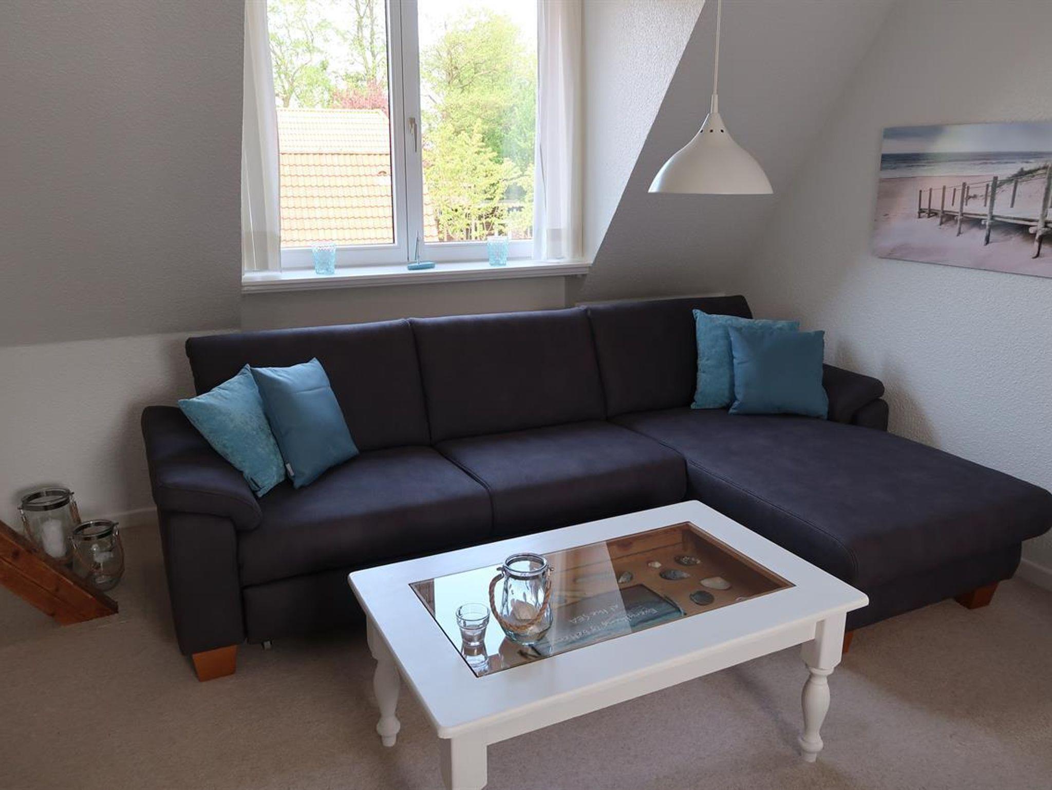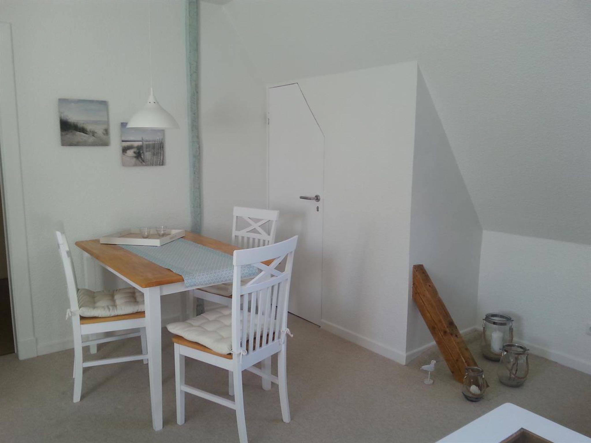 Die Wohnung befindet sich im ersten Obergeschoß eines roten Backsteinhauses, gegenüber von einem kleinen Wald. Genießen Sie hier die Ruhe und Nordseeluft auf Ihrem eigenen und 8 qm großen Balkon mit Blick in den Garten.