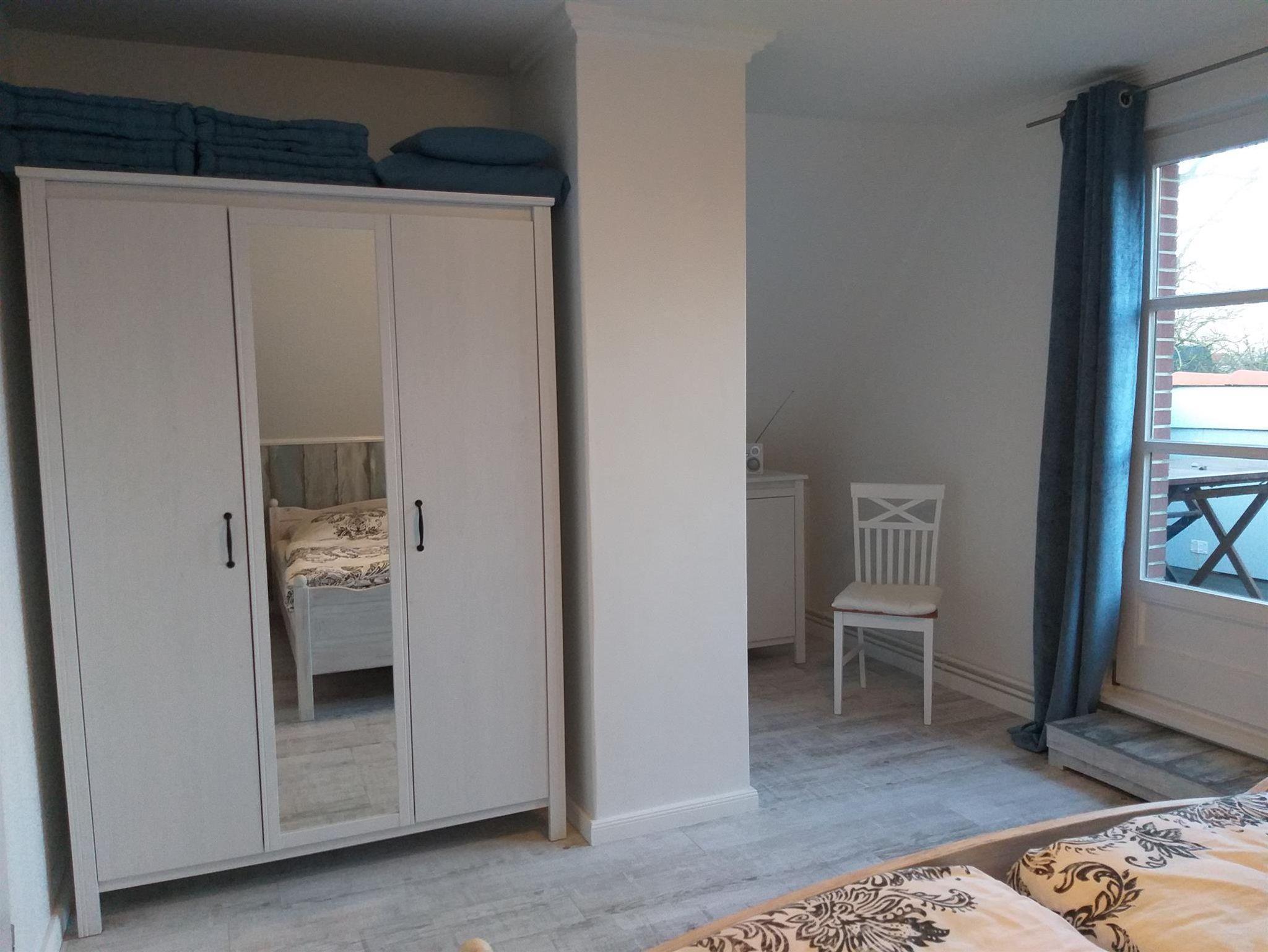Die Wohnung verfügt über ein 2018 komplett renoviertes Schlafzimmer mit bequemen großem Doppelbett, zwei Nachtschränken, einem dreitürigen Kleiderschrank und einer Kommode. Die Lattenroste sind an Kopf- und Fußteil klappbar. Die neuen dunkelblauen Gardinen lassen sehr wenig Licht einfallen und der weiße Laminatboden wurde frisch verlegt. Durch eine doppelte Flügeltür gelangen Sie auf den großen Balkon.