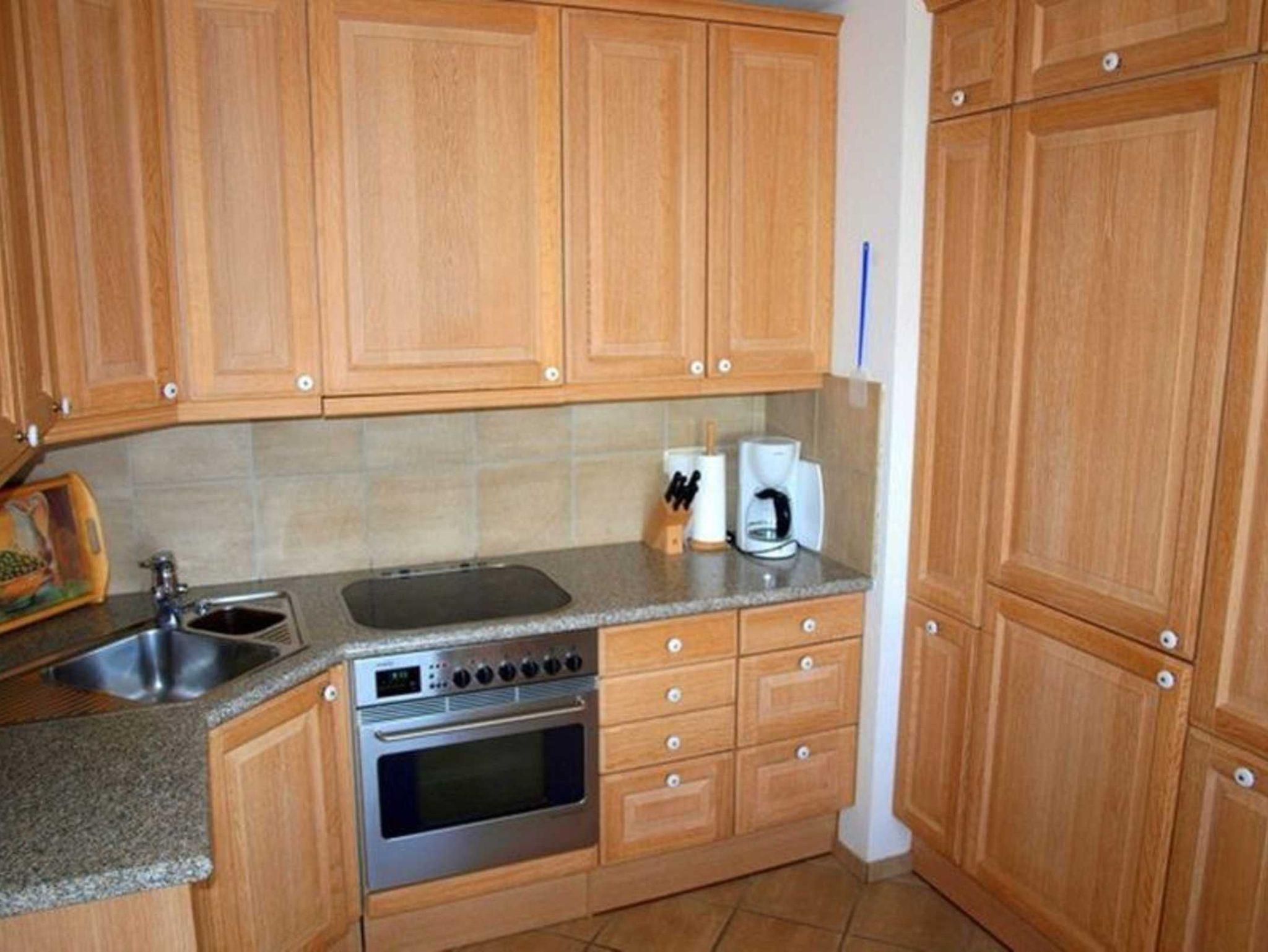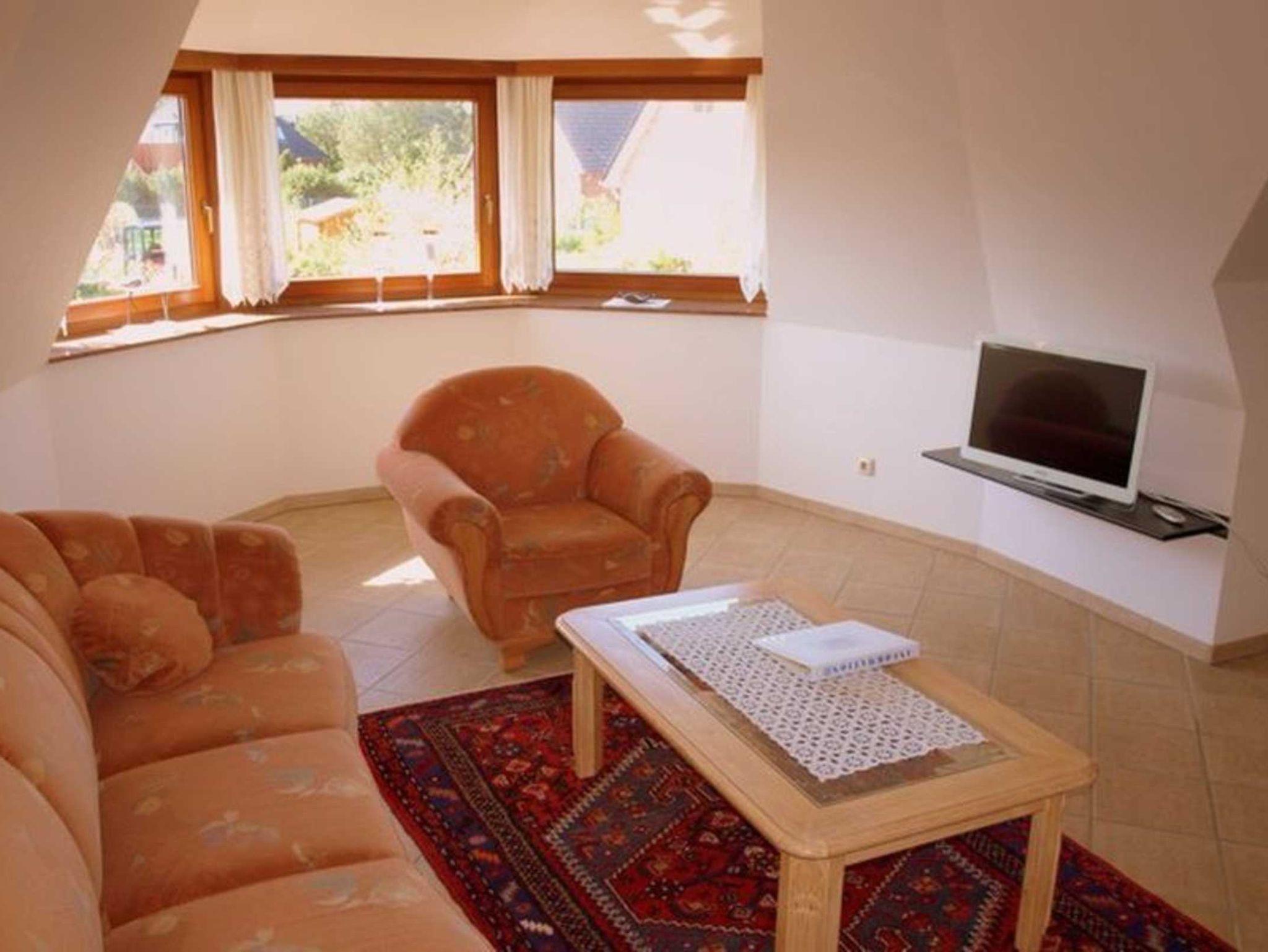 Helles Wohnzimmer mit Sofa für 3 Personen, 2 Sesseln und TV (Kabel). Halboffene Küche mit Backofen-Mikrowellen-Kombigerät, Geschirrspüler, Kühlschrank, Gefrierschrank, Esstisch für 5 Personen und Radio.