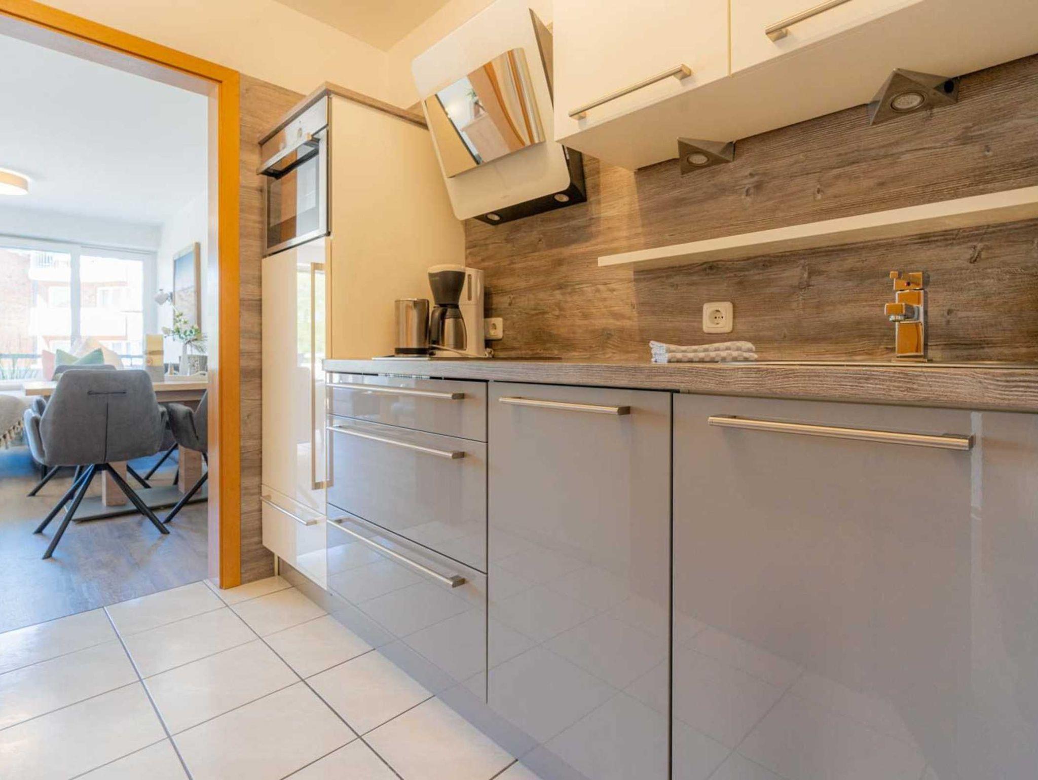 Halboffene Küche mit Backofen, Induktionsherd mit 2 Ceran-Kochstellen, Kühlschrank mit Gefrierfach und Geschirrspüler.