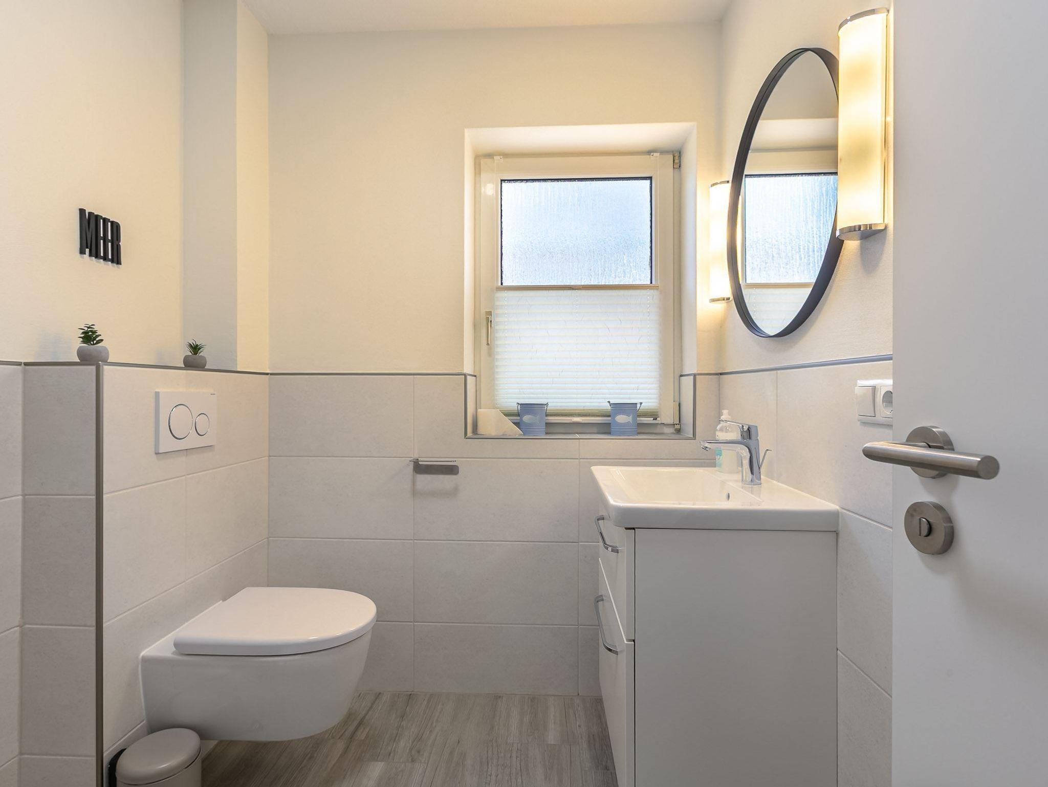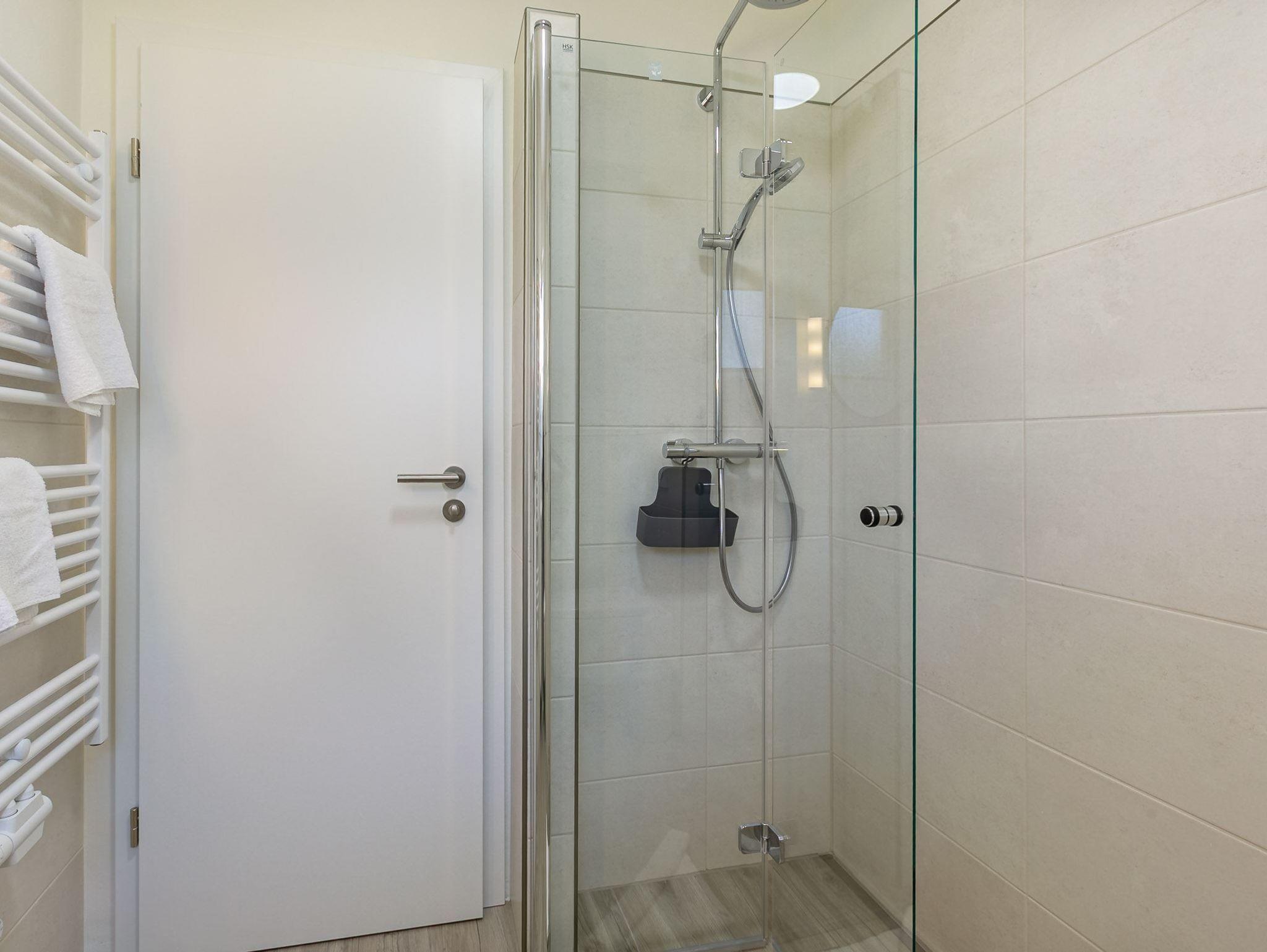 Badezimmer (Duschbad) mit bodengleicher (Regen-) Dusche, WC, Tageslicht und Föhn.