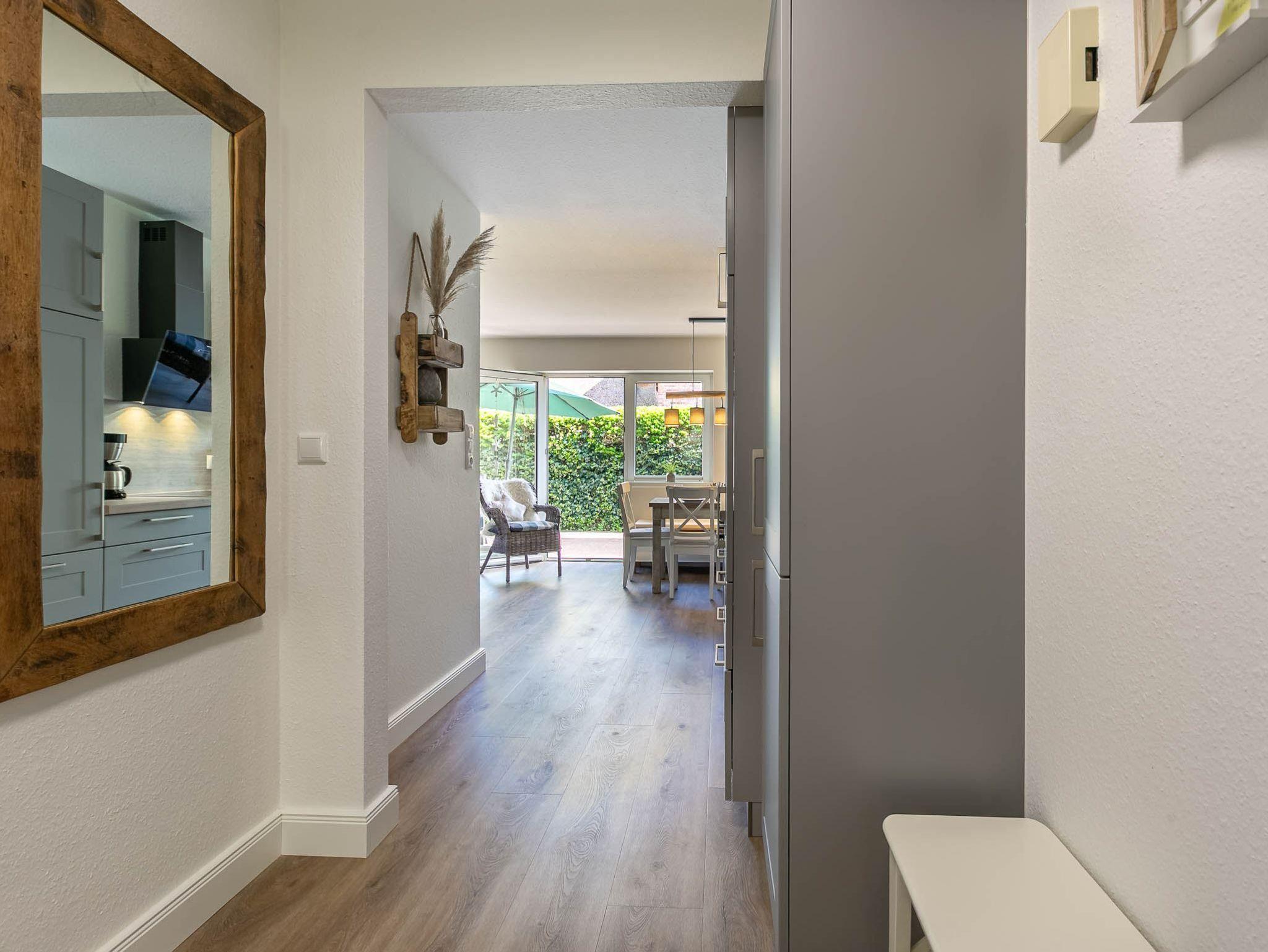 Flur mit Schuhablage, Spiegel und Garderobenschrank mit Staubsauger im Eingangsbereich.