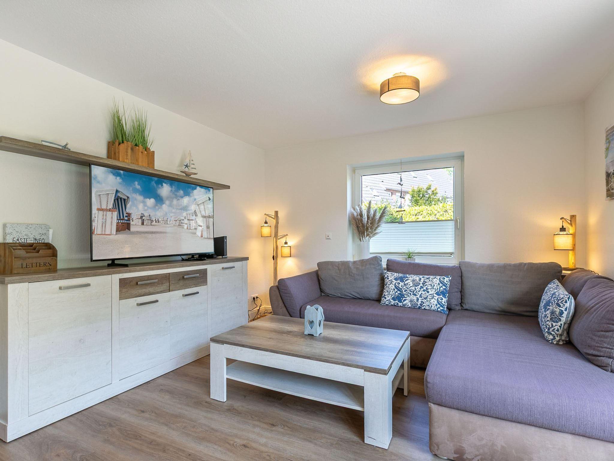 Helles Wohnzimmer mit großem Ecksofa (bis zu 4 Personen), Korbsessel, SMART-TV (Kabel) und Esstisch mit 4 Stühlen. Direkter Zugang zur möblierten Terrasse nach Osten. Offene Küche mit Backofen, Geschirrspüler und Kühlschrank mit Gefrierfach.