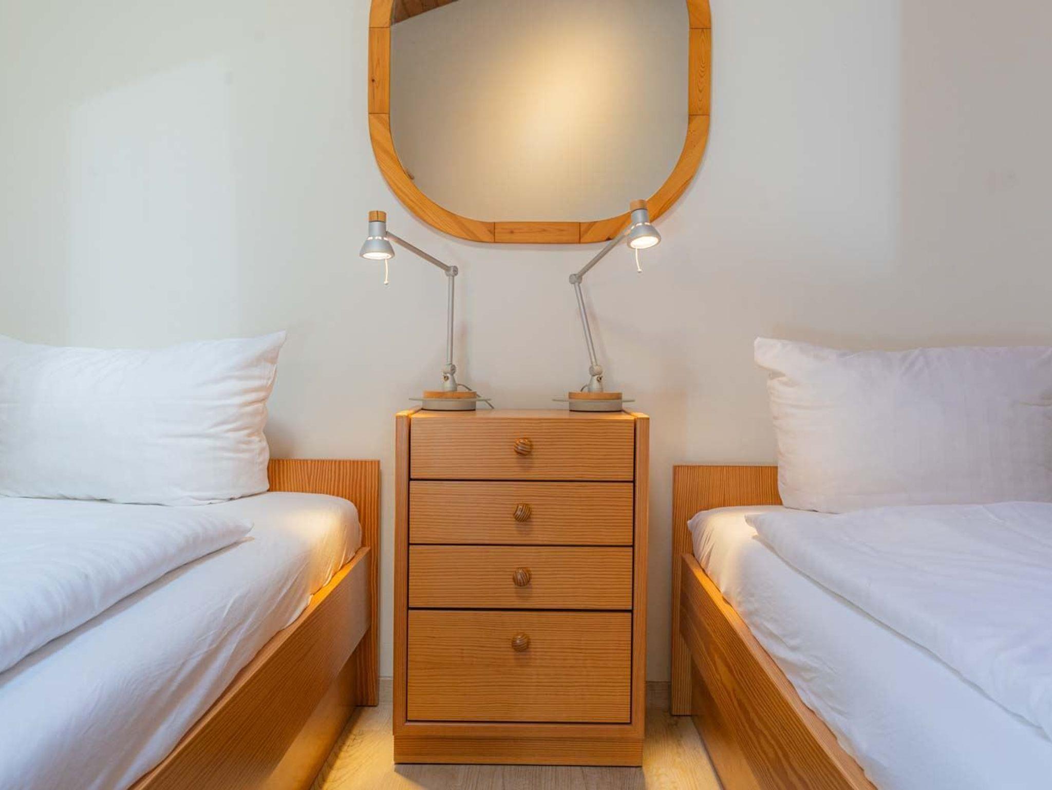1. Schlafzimmer mit 2 Einzelbetten (je 90x190cm), Stuhl mit Herrendiener und Kleiderschrank. Dieses Schlafzimmer ist offen zum Wohnzimmer (Schlafempore) und Durchgang zum 2. Schlafzimmer.