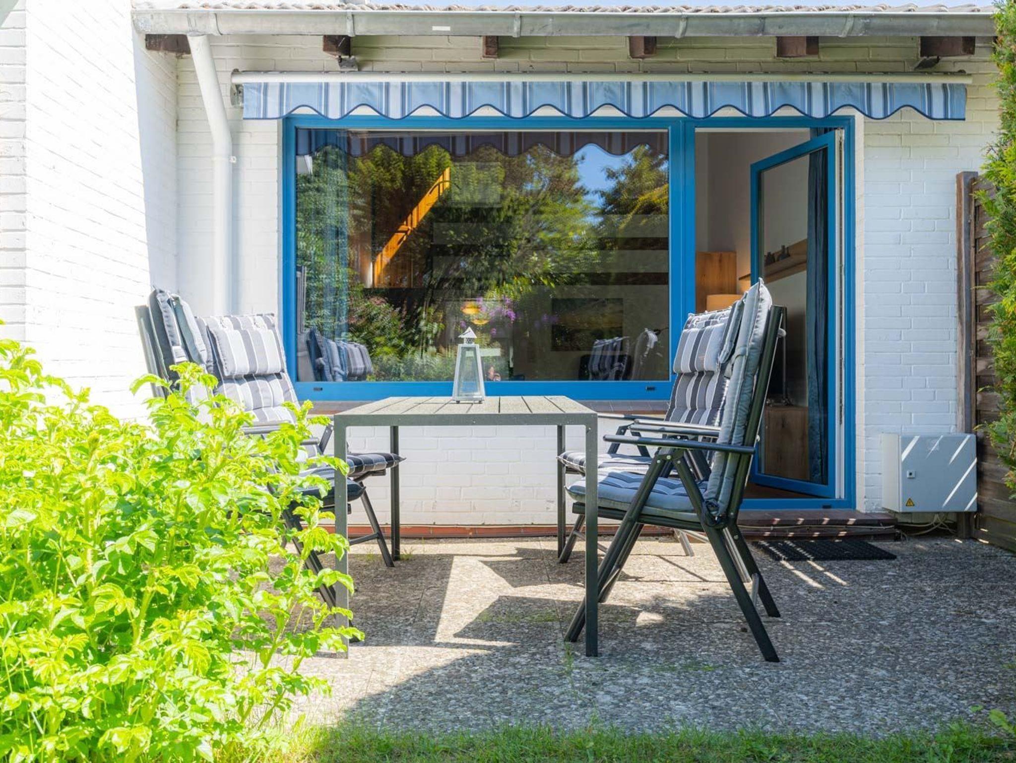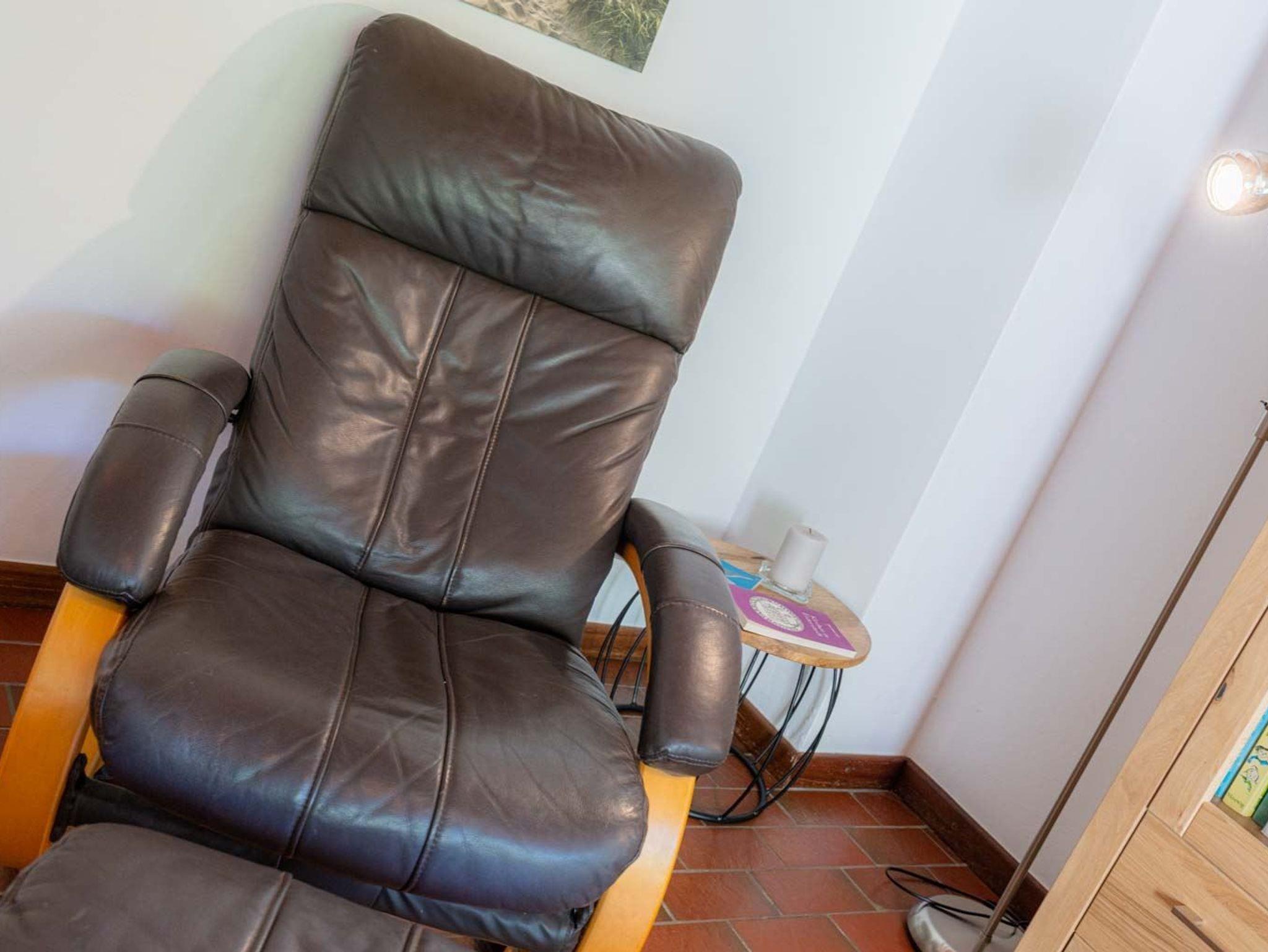 Wohnzimmer mit 2 Sofas für je 2 Personen, Sessel, kleines TV (Sat) und Radio. Direkter Zugang zur möblierten, windgeschützten Gartenterrasse mit Sonnenmarkise nach Südwesten.