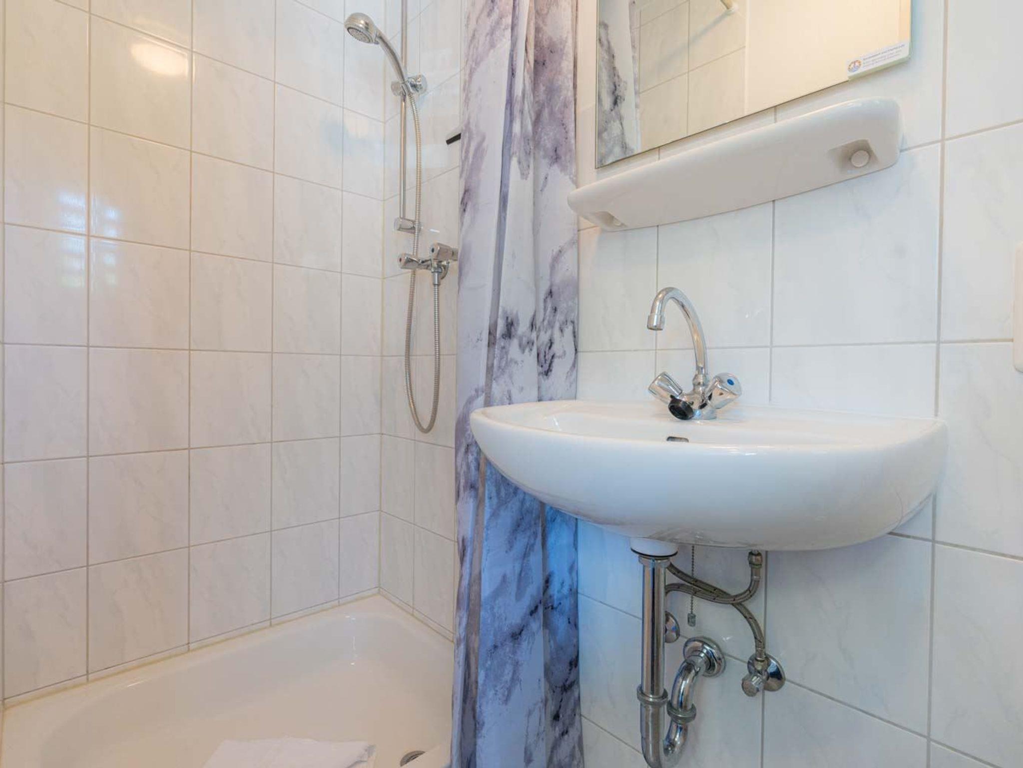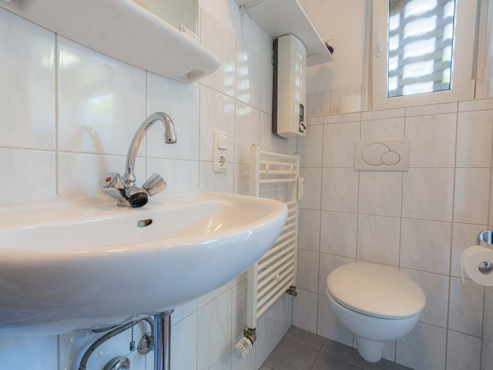 Kleines Badezimmer (Duschbad) mit Dusche, WC, Handtuchwärmer, Tageslicht und Föhn.