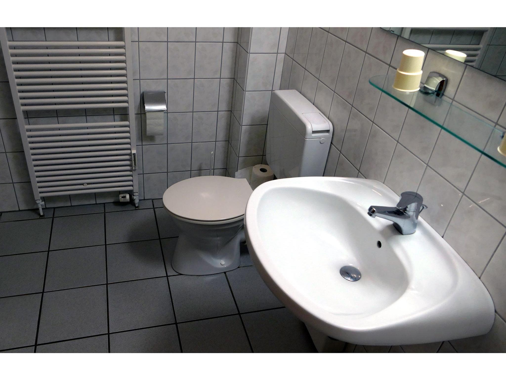 Bad: Dusche, Waschbecken, WC, Duschkabine, Spiegel, Regal