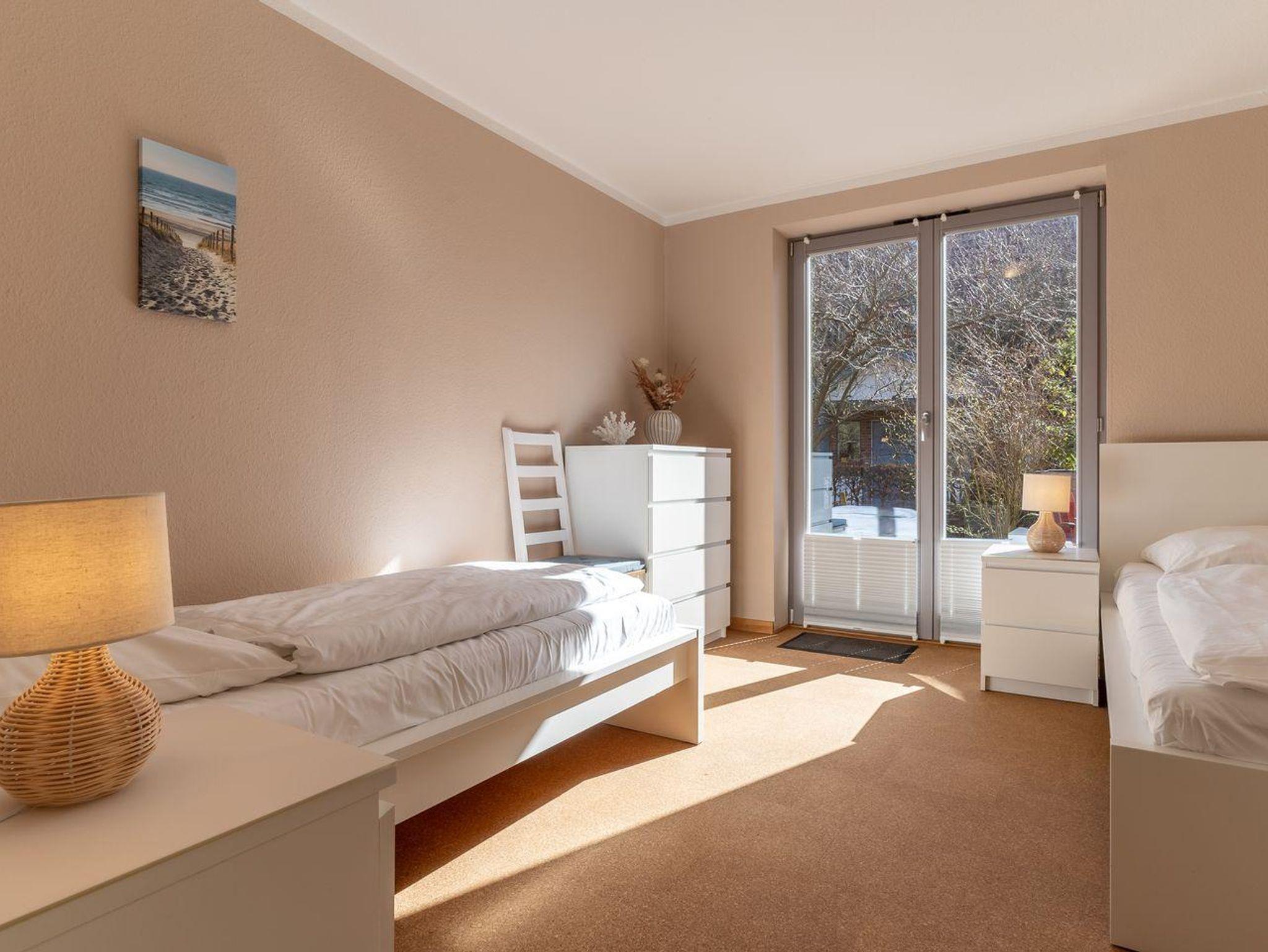 Im Erdgeschoss befindet sich der Wohnraum mit einer offenen Küche und einem gemütlichen Essbereich. Die Küche ist mit hochwertigen Geräten voll ausgestattet. Vom Flur aus gelangen sie in die beiden Schlafzimmer. Eines mit einem 180er Doppelbett und das Anderes mit 2x 90er Einzelbetten. Beide Schlafzimmer haben große Fenster und Zugang zur Terrasse. Der Flur mit eingebauter Garderobe bietet genügend Platz für Ihre Utensilien. Ein Duschbad mit WC und das weitere Gäste-WC bieten jeden Komfort.
