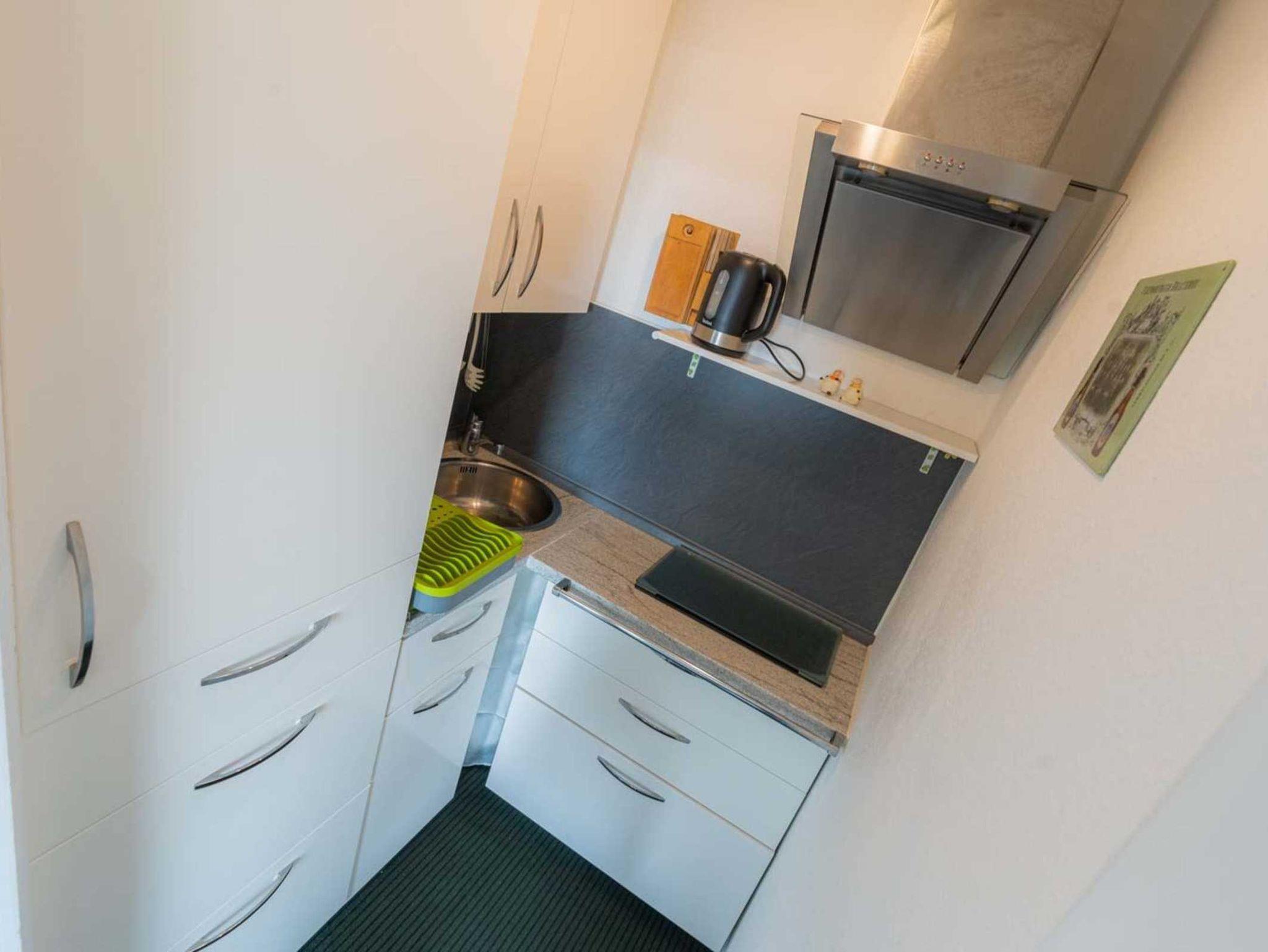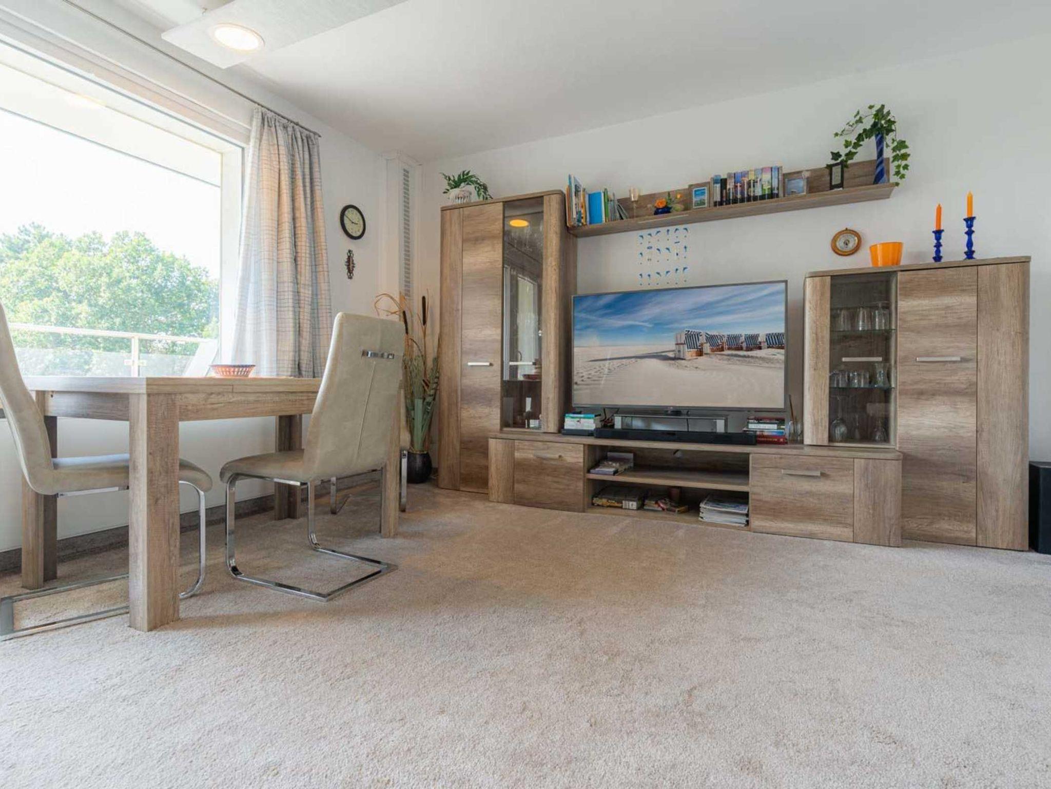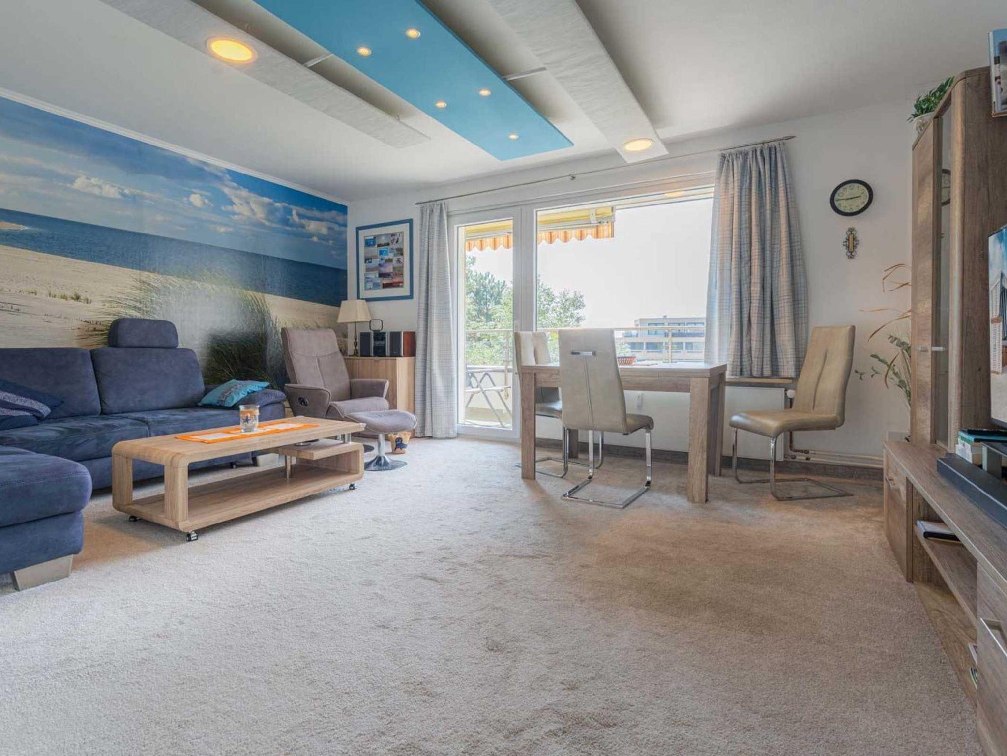 Wohn- und Schlafzimmer mit Ecksofa (ausziehbar zum Schlafsofa 120x190cm), Relax-Sessel mit Fußhocker, großem SMART-TV (Kabel) mit Bluetooth-Soundbar und BluRay-Player sowie ein Esstisch mit 3 Stühlen. Direkter Zugang zum möblierten, windgeschützten Balkon nach Südwesten, von dem aus Sie einen herrlichen Ausblick auf das Kurzentrum und sogar einen Mini-Meerblick (klitzekleinen Streifen vom Meer) haben. Kleine halboffene Küche mit Herd mit 2 Ceran-Kochstellen, Geschirrspüler und Kühlschrank mit Gefrierfach.