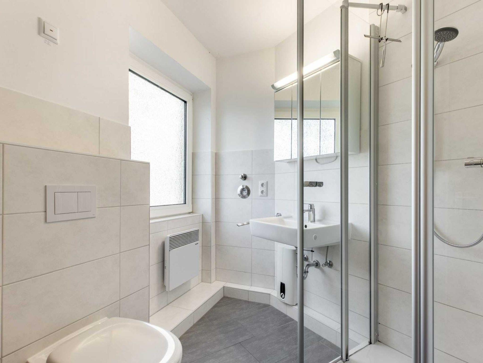 Modernes Badezimmer (Duschbad) mit Dusche, WC, Föhn und Tageslicht. Haushaltsschrank mit Staubsauger.