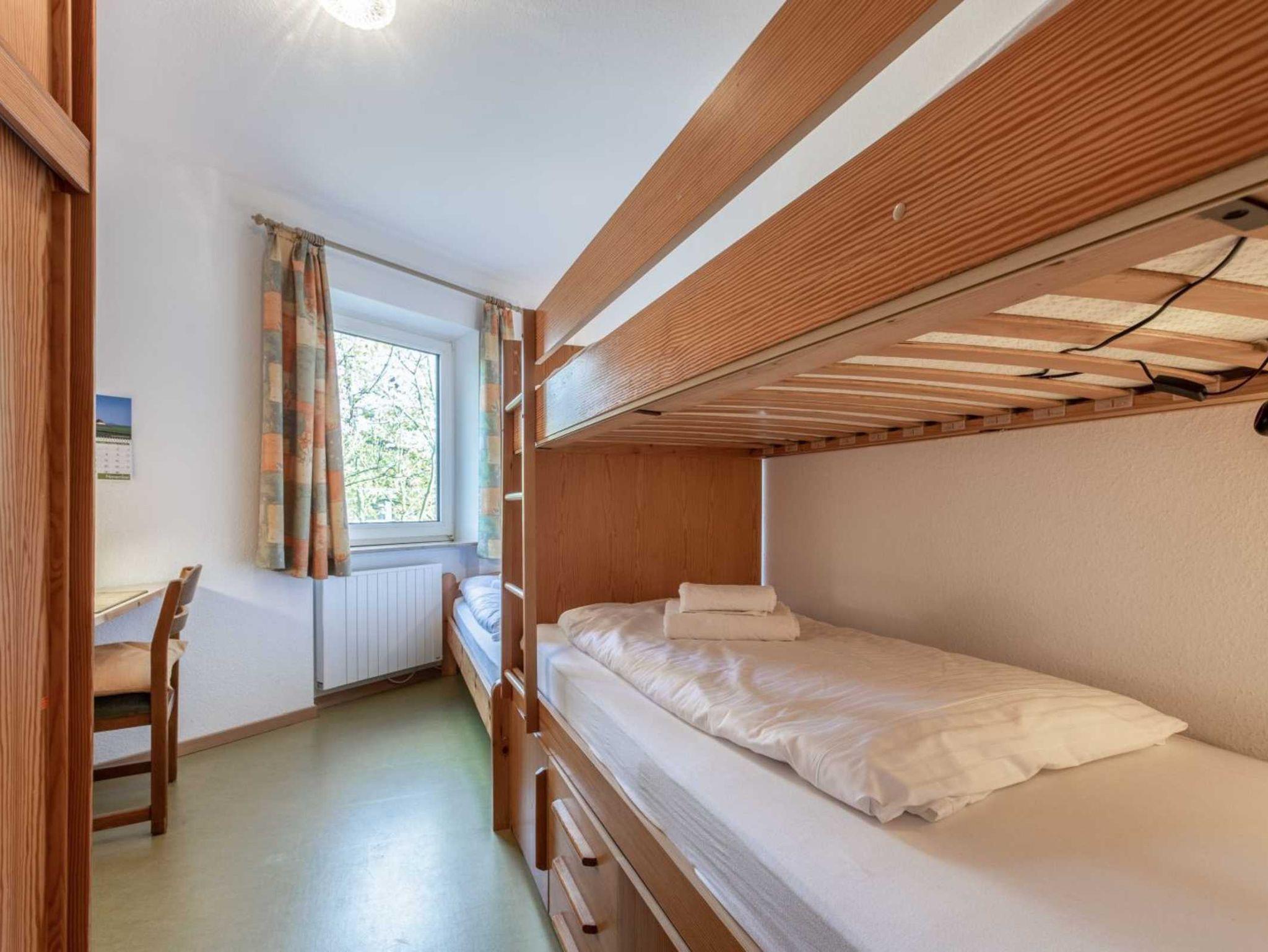 Schlafzimmer mit Einzelbett (90x190cm) und 2 Etagen-Einzelbetten (je 90x200cm), Kleiderschrank und Stuhl.