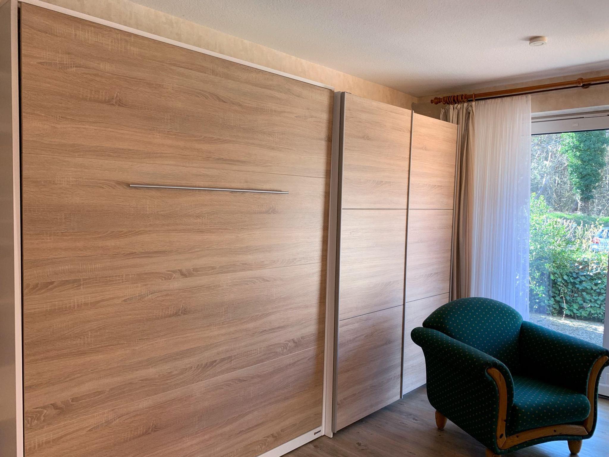 Wohnzimmer: Couch, Couchtisch, Sessel, Stuhl, Stehlampe, Beistelltisch, TV-Tisch, Kabel-TV, Stereoanlage mit CD-Player, Esstisch, 2 Stühle, Kleiderschrank, Regal, 2 Einzelschrankbetten, Küchenzeile, 2 Plattenherd mit Ceranfeld, Kühlschrank, Dunstabzugshaube, Kaffeemaschine, Wasserkocher, Eierkocher, Toaster, Bügeleisen, Geschirr, Kochtöpfe, Staubsauger