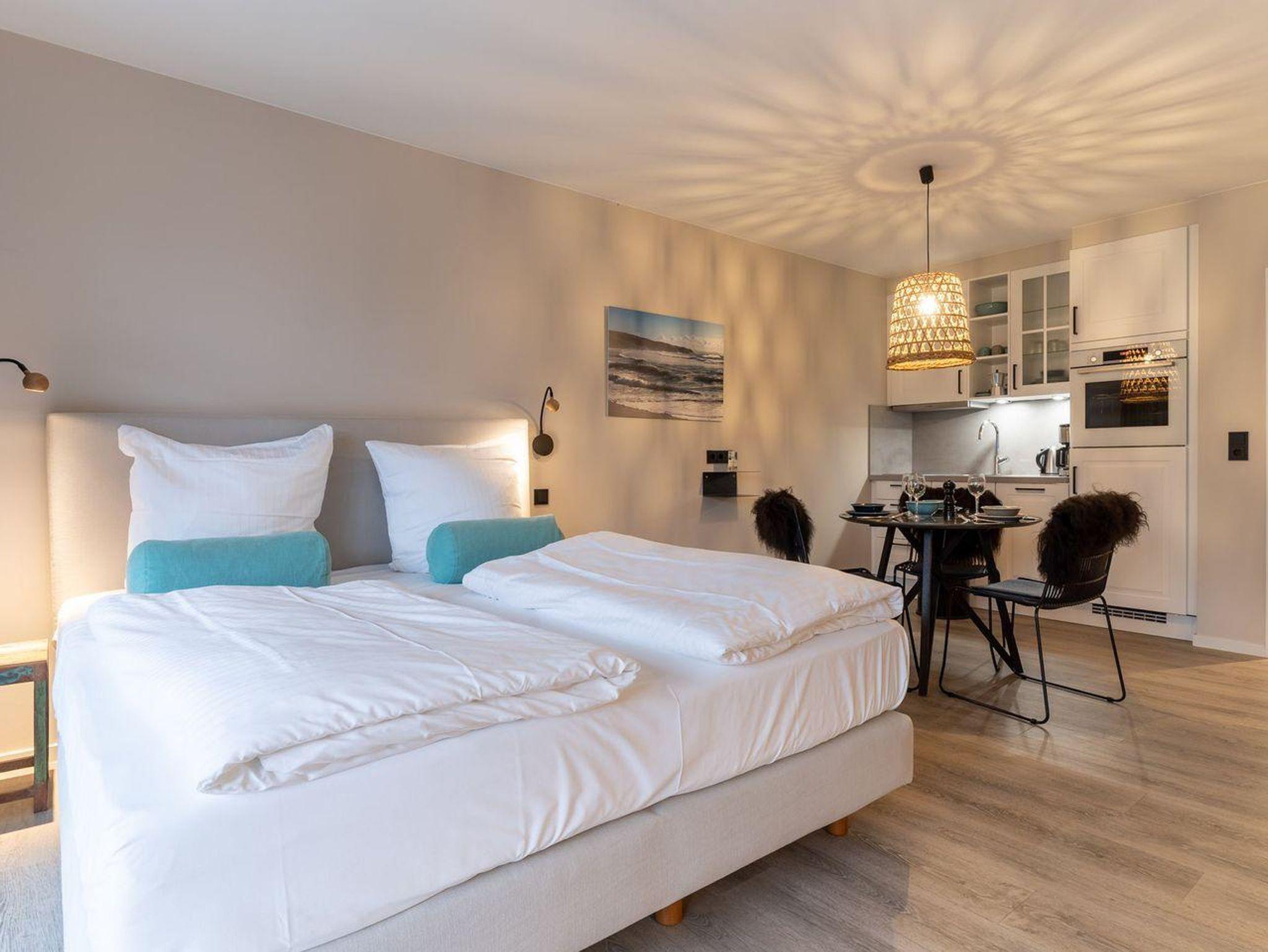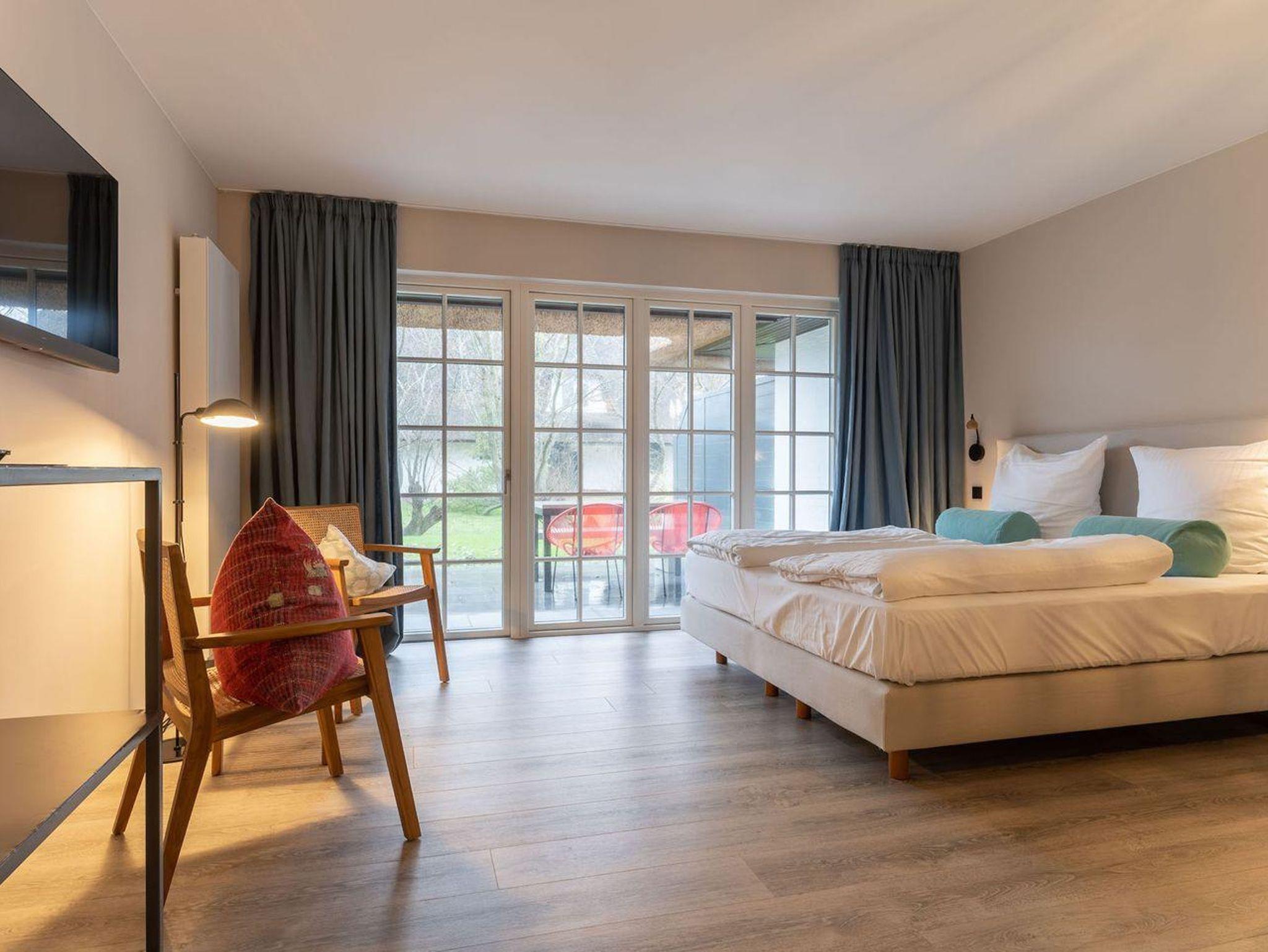 Der Blick in die gepflegte Grünanlage und auf das reetgedeckte Haus sind einfach herrlich und locken nach draußen. Am Abend erholen Sie sich im gemütlichen Doppelbett (180x200cm). Das moderne Bad mit Fenster verfügt über eine bodentiefe Regendusche, Handtuchheizung, Waschbecken und WC.