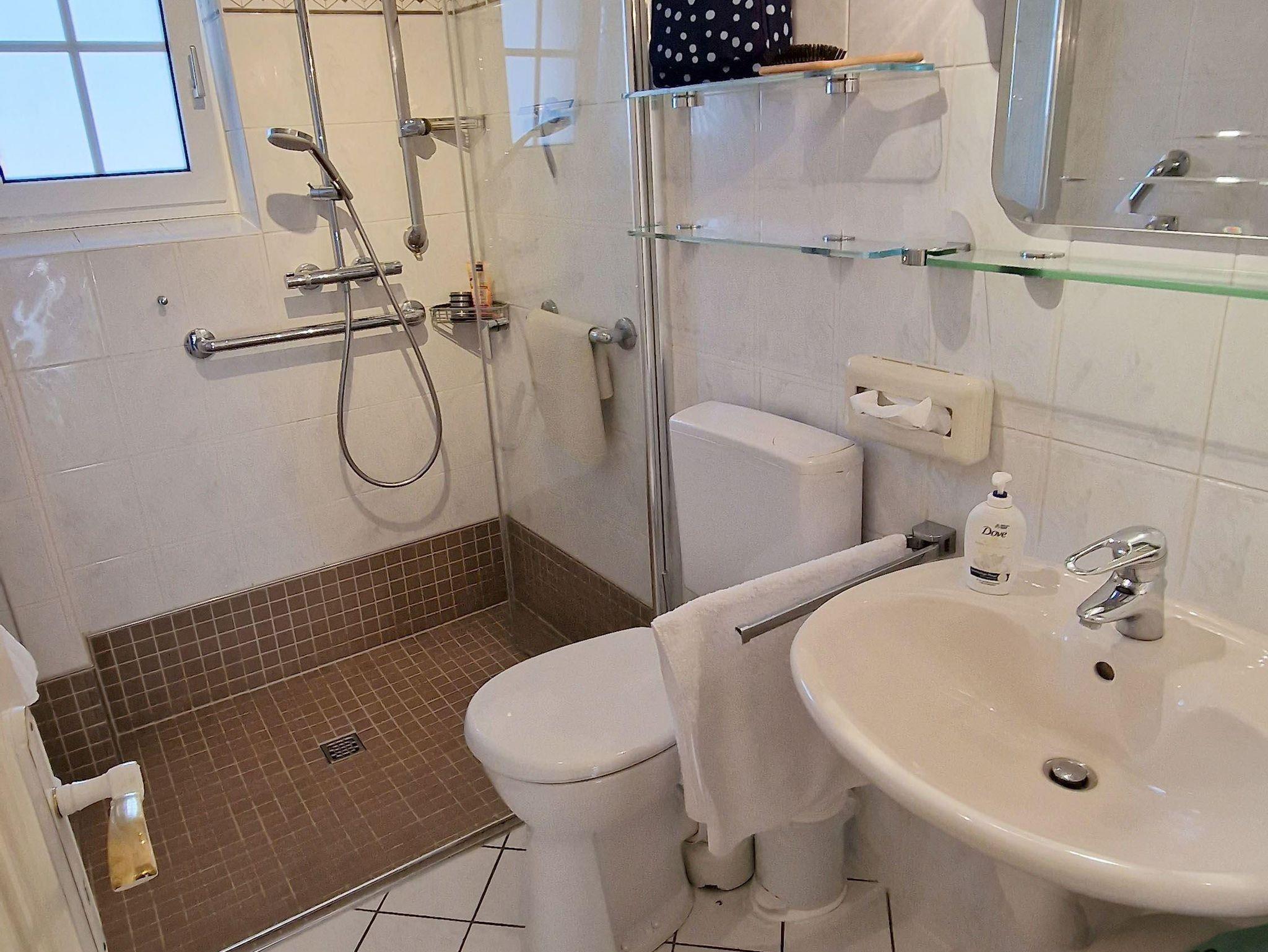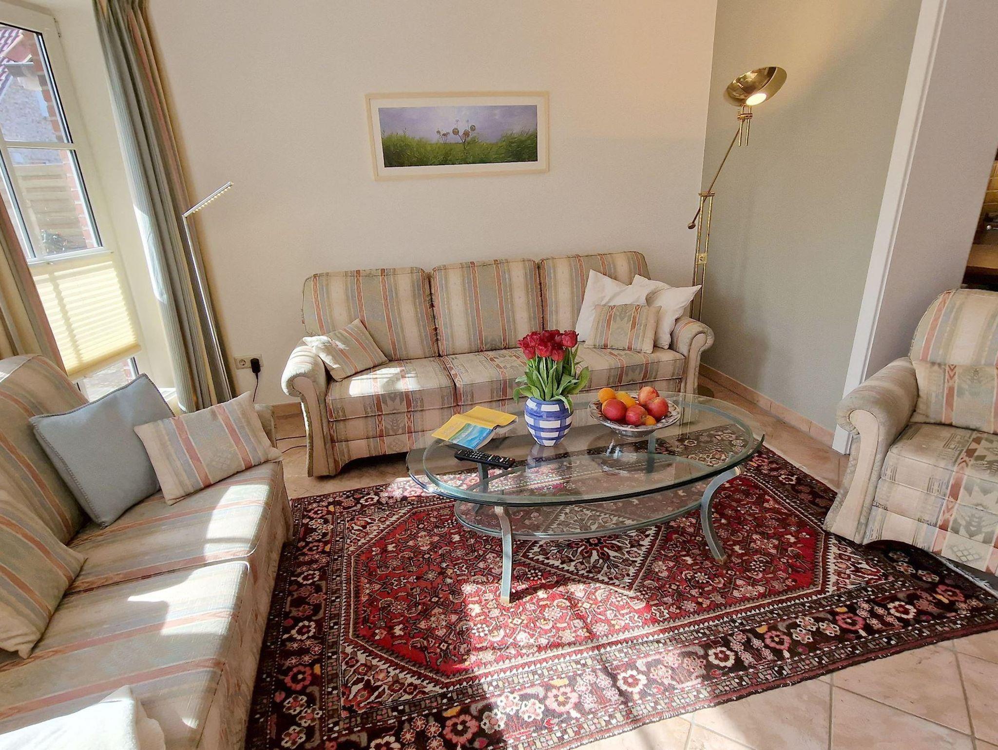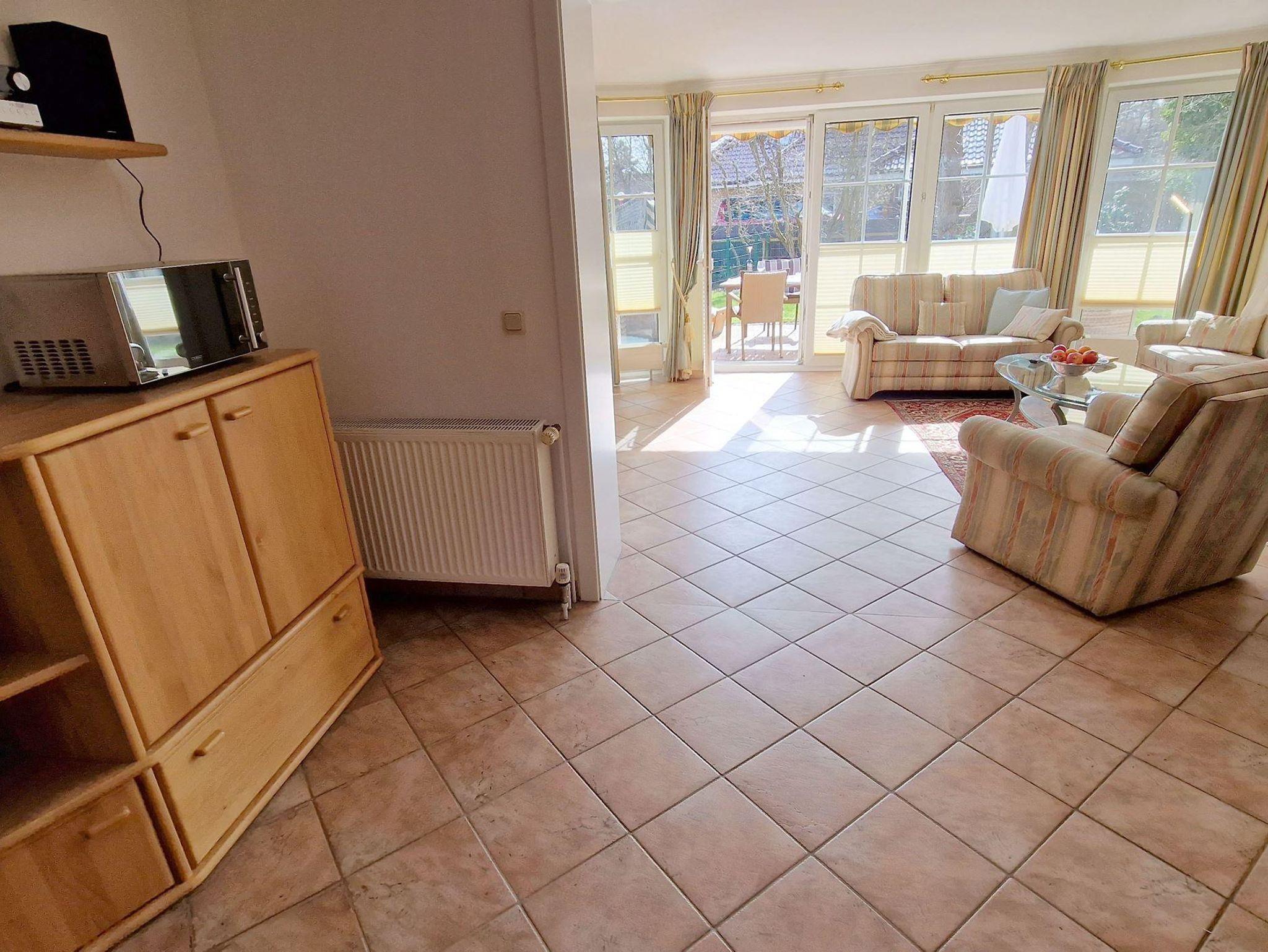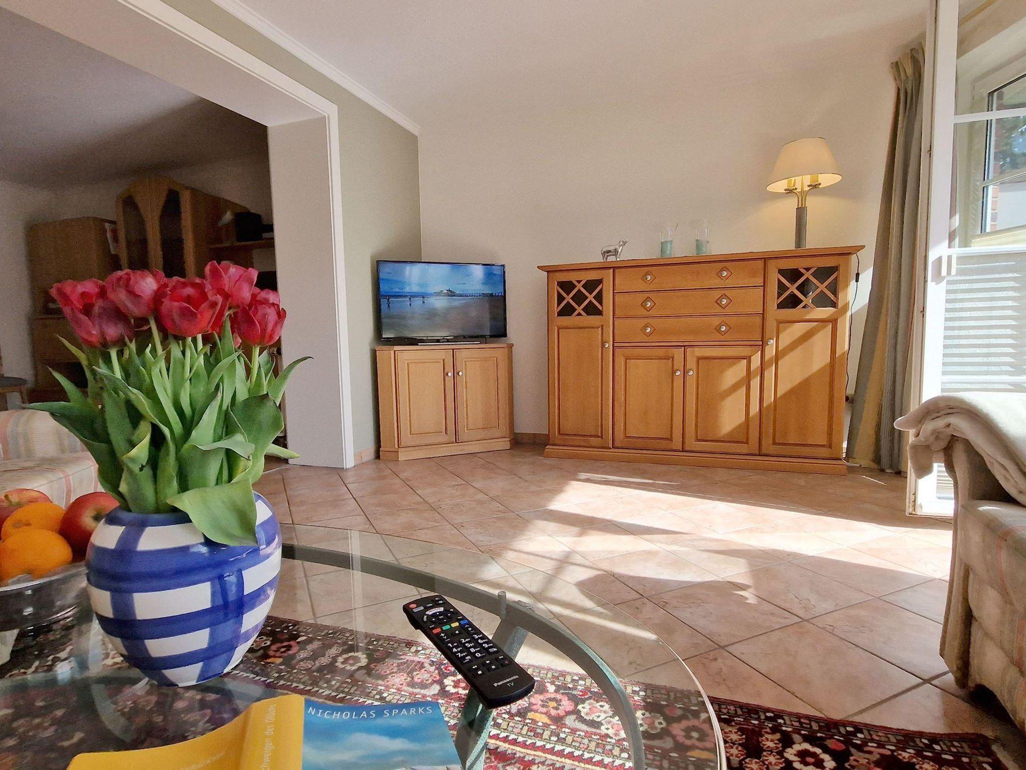 Die geräumige und hochwertig ausgestattete 3- Zimmer-Wohnung (ca. 77m² ) befindet sich im Erdgeschoß und besitzt ein hohes Maß an Funktionalität. Das lichtdurchflutete und sehr hochwertige Wohn-/ Esszimmer verfügt über eine separate Sitzgruppe mit bequemer Couch. Die offene Küche beinhaltet eine voll ausgestattete Einbauküchenzeile. Eines der Schlafzimmer ist mit einem Doppelbett ausgestattet, das andere verfügt über zwei Einzelbetten. Das elegante Badezimmer verfügt über eine geräumige Dusche mit nahezu ebenerdigem Einstieg und Echtglastüren. Vom Wohn-Esszimmer haben Sie direkten Zugang zur großen sonnigen Terrasse mit Gartenmöbeln, Sonnenschirm, Strandkorb und Markise. Ihr Auto können Sie kostenfrei auf einem zu Ihrer Wohnung gehörendem Carport-Stellplätzen ( max. für 2 Pkw´s ) am Haus parken. Der Clou beim dem Grundstück ist, dass Ihr Vierbeiner nicht weglaufen kann, da der Garten komplett eingezäunt ist. Ihre Fahrräder können in einem abgeschlossenem Fahrradschuppen untergestellt werden.