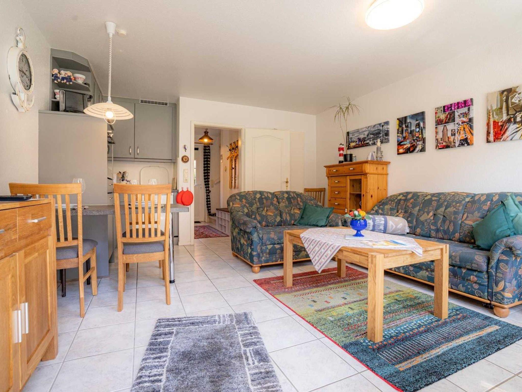 Wohnzimmer mit 2 Sofas (2er, 3er), TV (Kabel), Bluetooth-Soundsystem mit CD-Player und Esstisch für 4 Personen. Offene Küche zum Wohnzimmer mit Backofen, Mikrowelle, Geschirrspüler und Kühlschrank mit Eisfach. Direkter Zugang zur möblierten Süd-Terrasse mit Markise (Handkurbel).
