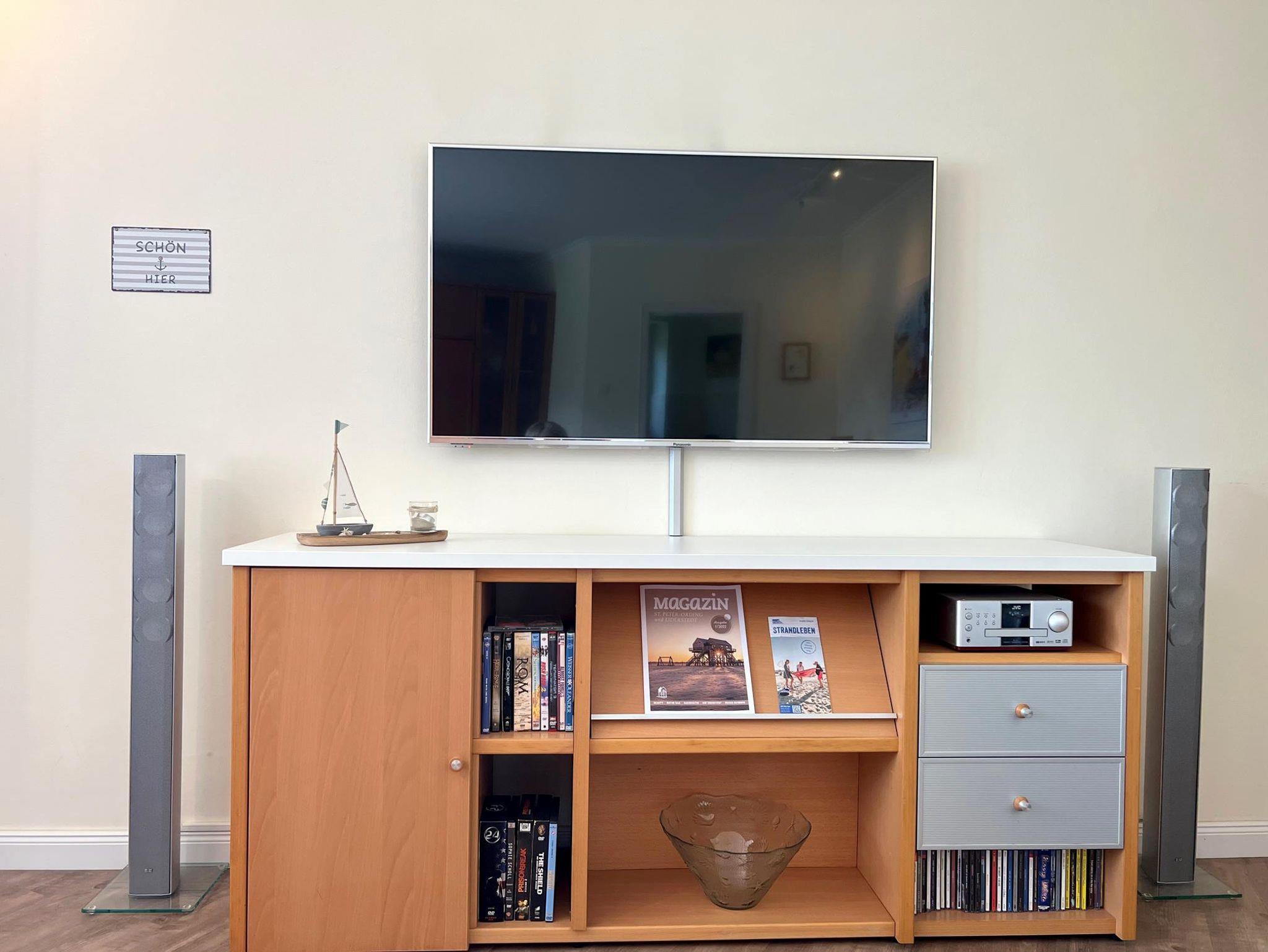 Wohnzimmer:Ledercouch, 1 Ledersessel, Couchtisch, Beistelltisch mit Leselampe, Kabel-TV (HD), 50-Zoll-Flachbildschirm, Stereoanlage mit CD-/DVD-Player, HiFi-Schrank, Stehlampe, Schrankwand, Vitrine, Regal, Schrankdoppelbett, Esstisch, 4 Stühle, moderne E-Heizung