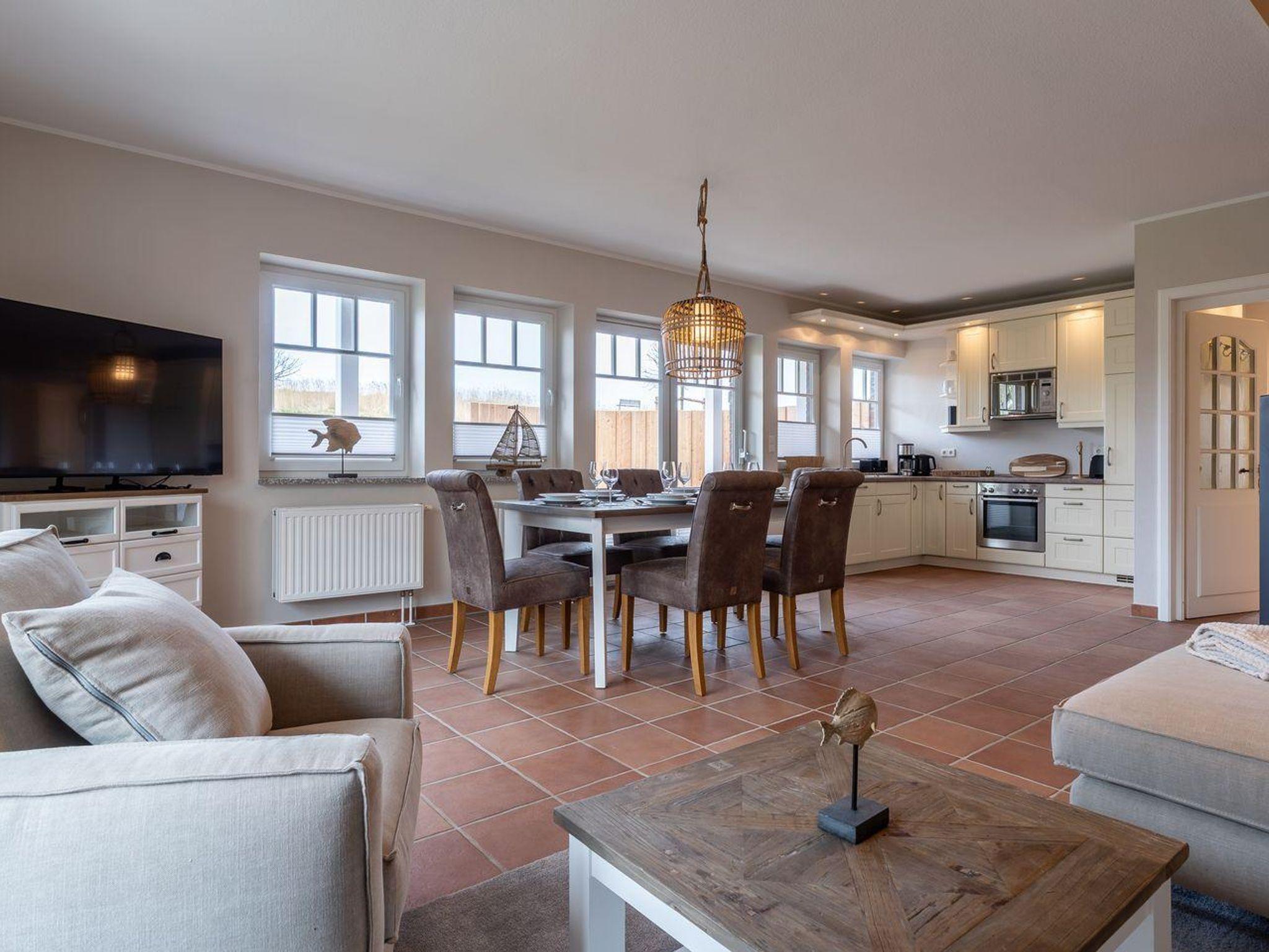 Die Unterkunft erstreckt sich über drei Etagen und bietet Ihnen eine moderne Gestaltung sowie zahlreiche Annehmlichkeiten, die Ihren Aufenthalt so komfortabel wie möglich gestalten. Im Erdgeschoss finden Sie den lichtdurchfluteten Wohnbereich, der offener zur voll ausgestatteten Küche gestaltet ist. Hier können Sie gemeinsam kochen und den Aufenthalt genießen. Die Küche verfügt über viele hilfreiche Utensilien einschließlich eines Ceranherds, Backofens, Mikrowelle und Kühlschrank mit Gefrierfach, sodass Sie hier alles Nötige finden, um Ihre Lieblingsgerichte zuzubereiten.