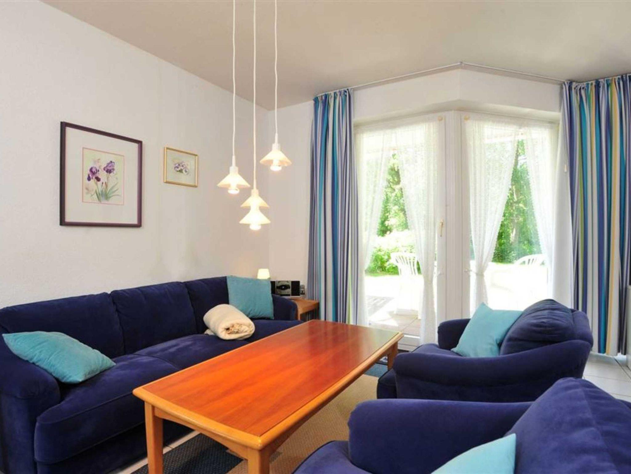 Wohnzimmer mit Sofa für 3 Personen, 2 Sesseln, Schrank-Doppelbett (2x 80x200cm), TV (Sat), Stereo-Kompaktanlage mit CD-Player und Esstisch mit 4 Stühlen. Direkter Zugang zur windgeschützten, möblierten Gartenterrasse nach Westen. Offene Küche mit Backofen, Mikrowelle und Kühlschrank mit Gefrierfach.