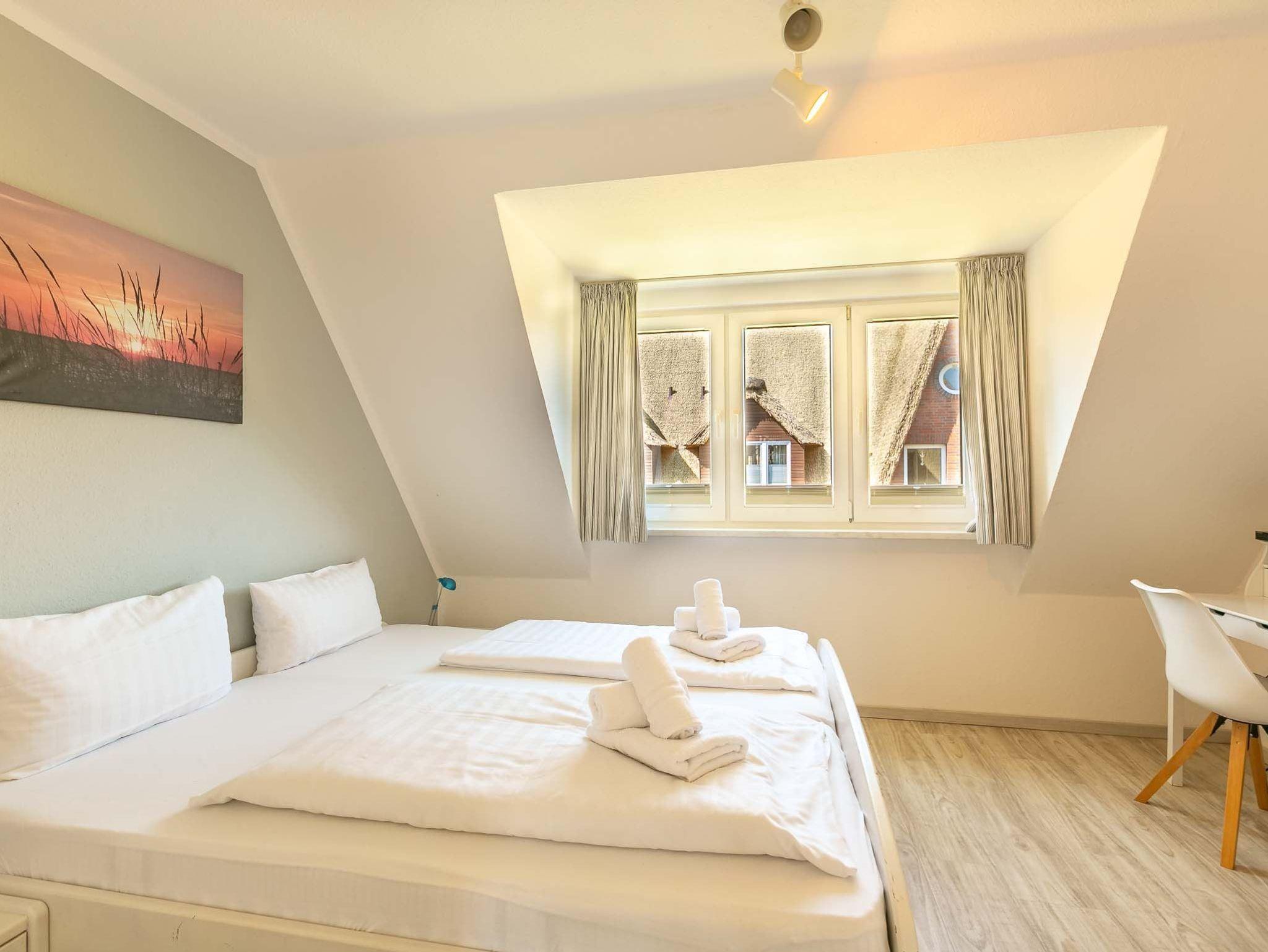 1. Schlafzimmer mit Doppelbett (2x 90x200cm), Kleiderschrank, Sessel, kleinem Schreibtisch mit Stuhl und SMART-TV (Sat) mit BluRay-Player.