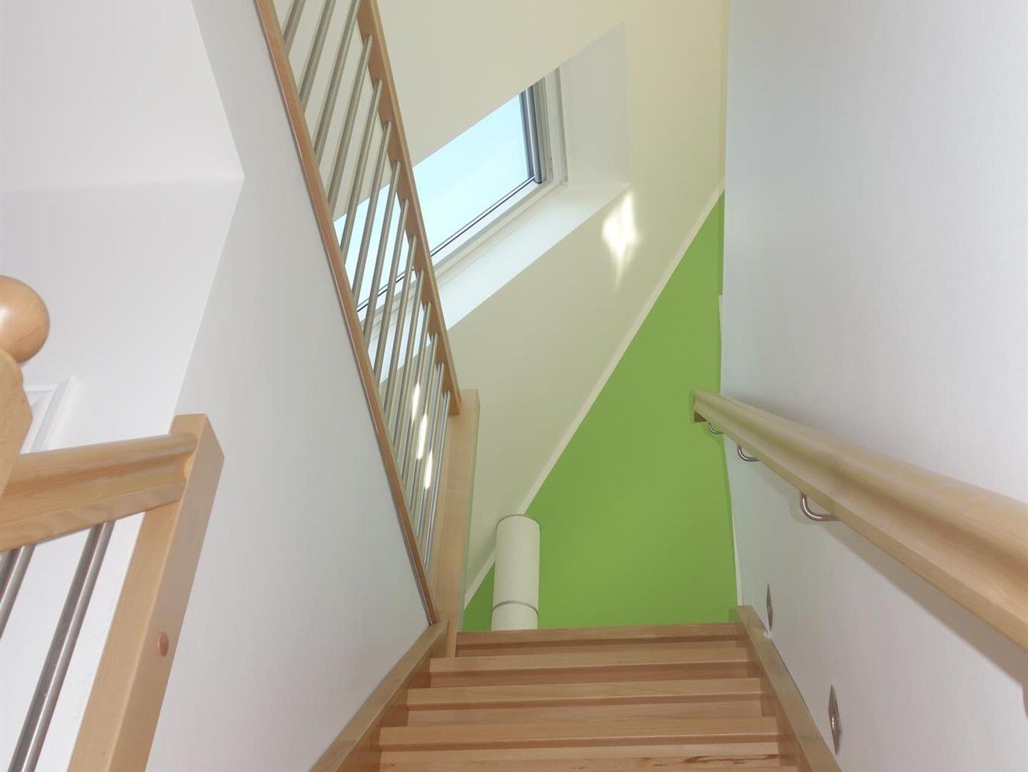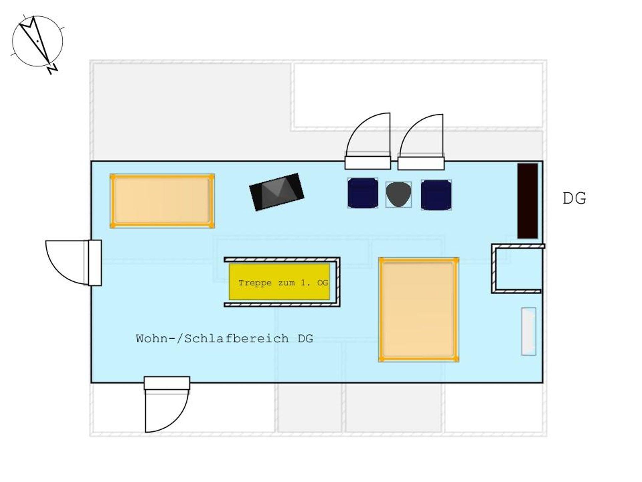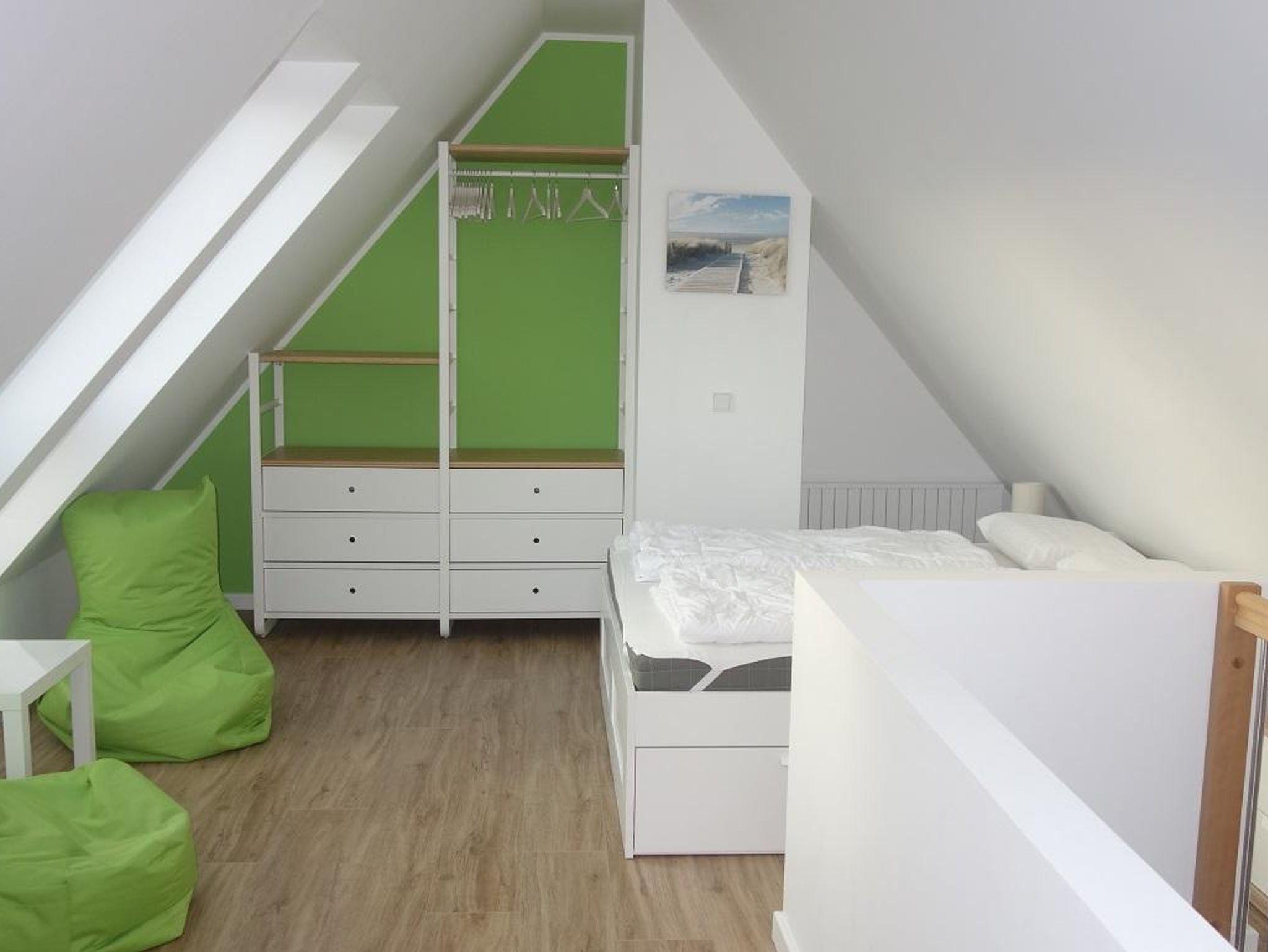 - Ferienwohnung über 2 Ebenen mit Balkon und Gemeinschaftsgarten für 2-5 Personen. In der unteren Ebene befindet sich der Wohn- und Essbereich, ein Schlafzimmer mit Bett 1,80 x 2m mit Bettdecken 1,55 x 2,20 m, Badezimmer und Toilette sind getrennt. In der oberen Ebene befindet sich ein Bett 1,60 x 2m sowie ein Bett 0,90 x 2m, jeweils mit Bettdecken 1,35 x 2m.