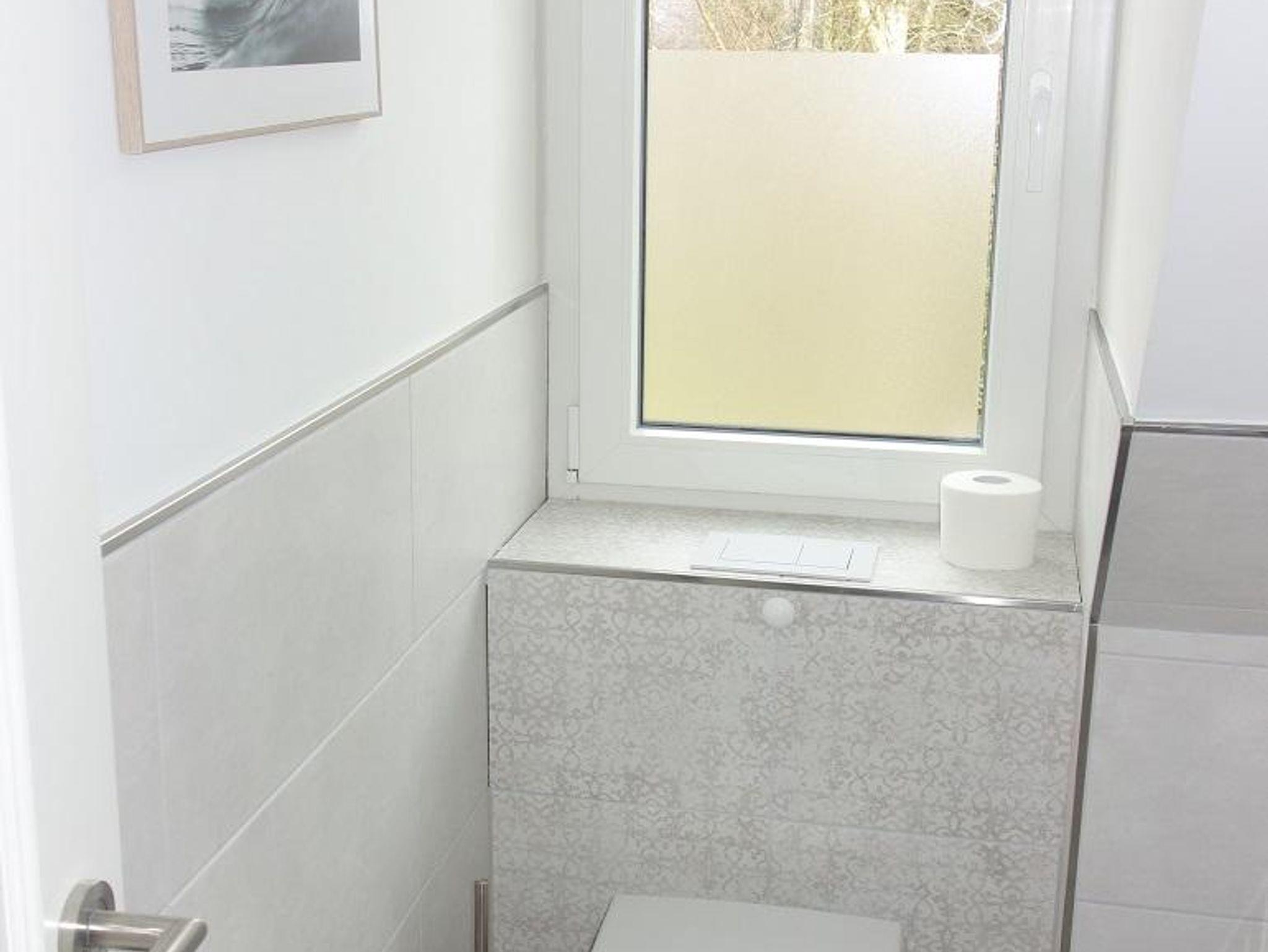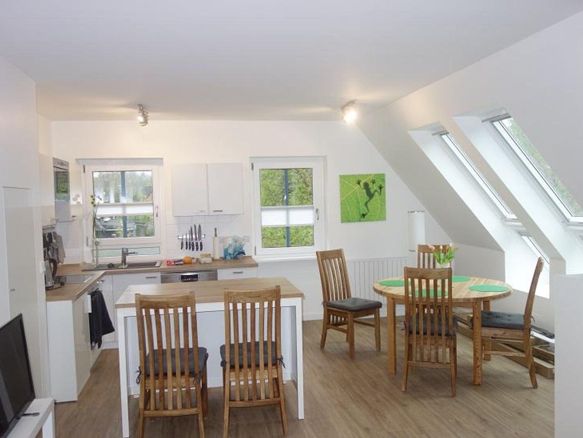 Moderne und lichtdurchflutete Ferienwohnung im Obergeschoß über 2 Ebenen auf 75 qm, mit zwei Schlafzimmern (1 x mit Doppelbett, 1 x Einzel- und Doppelbett), Wohnzimmer mit Balkon, Kaminofen und Kabel-Farb-TV, komplette Küche mit Geschirrspülmaschine, Flur, Duschbad und separatem WC.