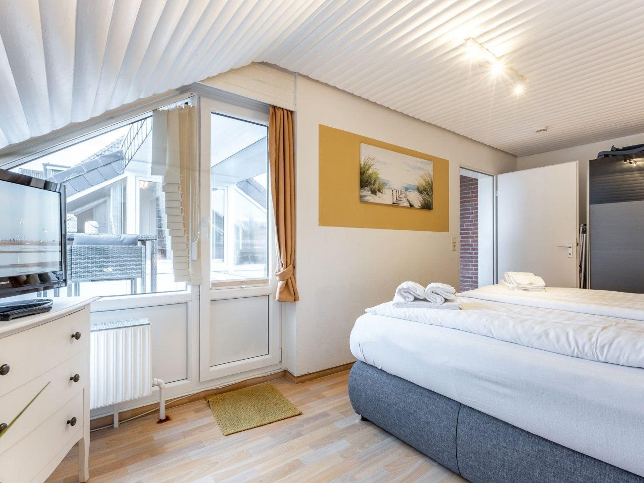 Schlafzimmer mit großem Doppelbett (180 x 200cm, Boxspring), 2 Stühlen, Kleiderschrank und TV (Kabel).