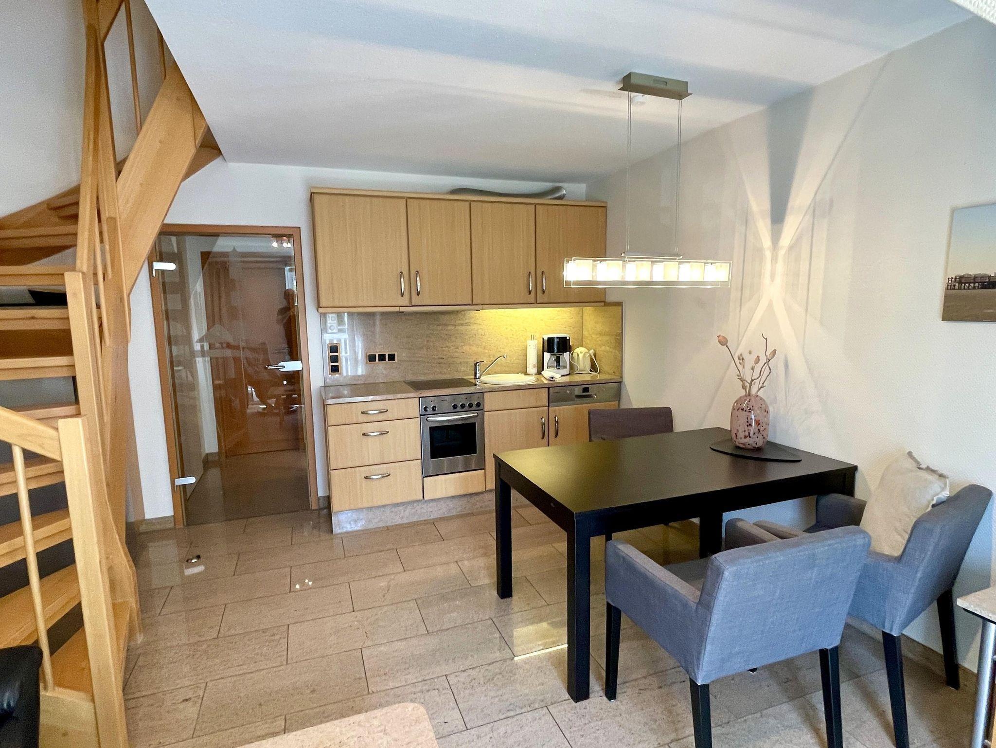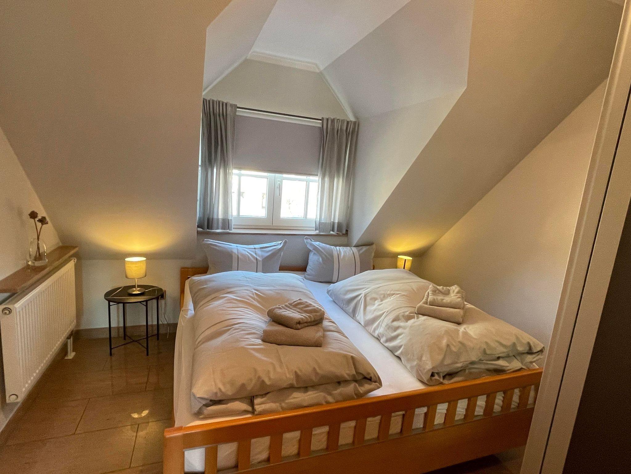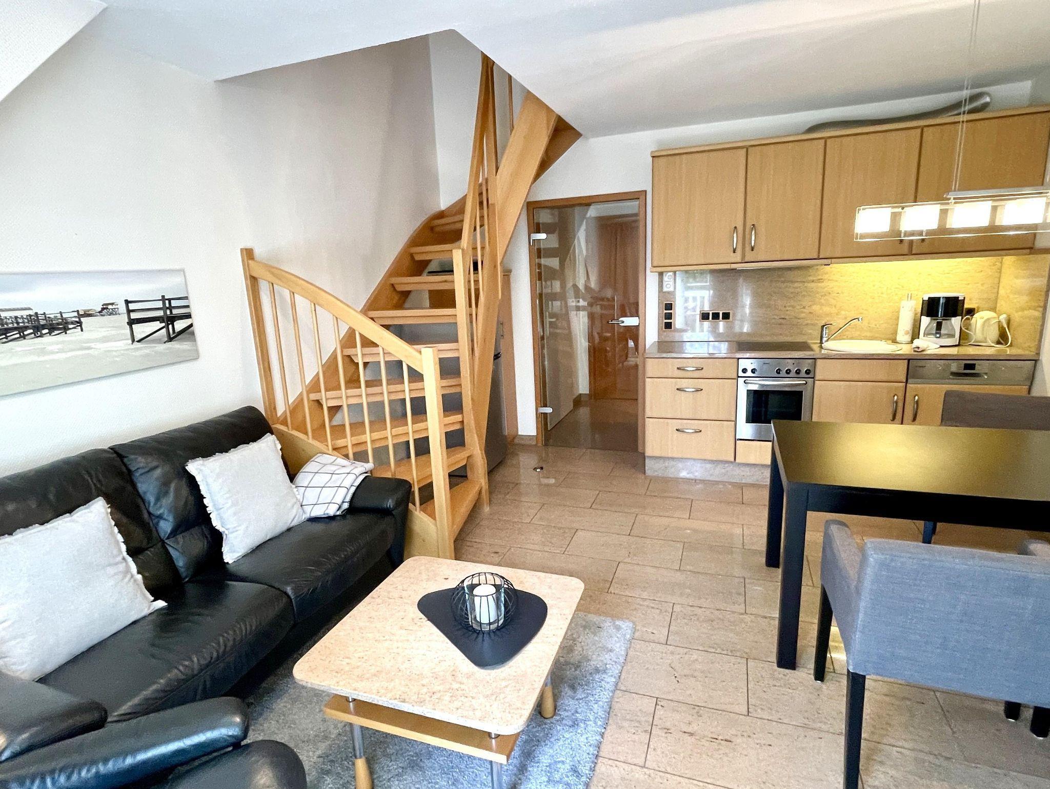 Appartementhaus in attraktiver baulicher Gestaltung in ruhiger bevorzugter Lage zwischen Badzentrum mit Kureinrichtungen und dem gemütlichen Dorf. Gaszentralheizung. 1 Pkw-Stellplatz pro Appartement am Haus und Fahrradstellplatz vorhanden. 3-Zimmer-Appartement im Obergeschoss und Dachgeschoss, aufwendig und komfortabel ausgestattet. Wohnraum mit Kabel-TV, Küchenzeile, Sitzecke, Badezimmer,Essecke, möbl. Südost-Balkon mit Markise. Schlafraum mit Doppelbett (1,80 x 1,90). Flur. Integriertes Studio im Dachgeschoss mit Wohn- Schlafraum, franz. Bett, Kabel-TV. Duschbad/WC inkl. Fön. Fußböden und Bäder in Granit. Mückenschutz vorhanden, inkl. Wäschepakete. WLAN Glasfaseranschluß.