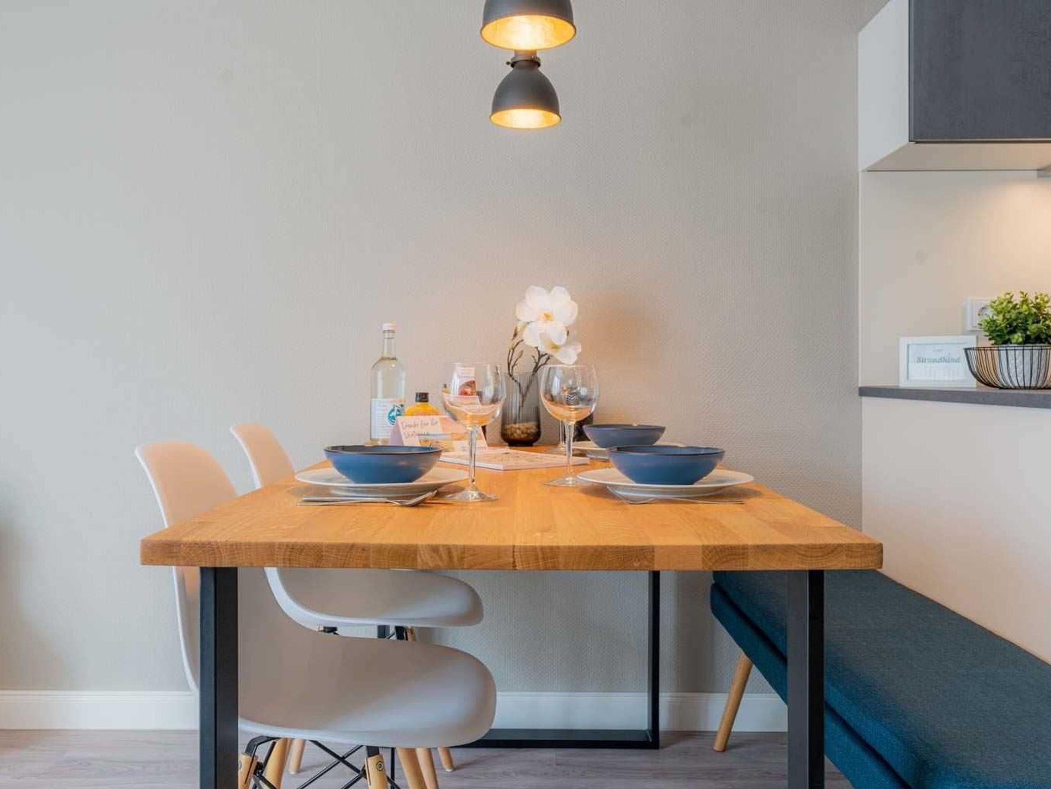 Helles Wohnzimmer mit Sofa mit Ottomane, SMART-TV (Kabel) und Esstisch mit 2 Stühlen und Sitzbank für 2 Personen. Direkter Zugang zum möblierten Balkon nach Südwesten mit Waldblick und Meeresrauschen. Offene Küche mit Backofen, Geschirrspüler, Kühlschrank mit Gefrierfach und Tchibo Cafissimo Kapsel-Kaffeemaschine.